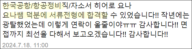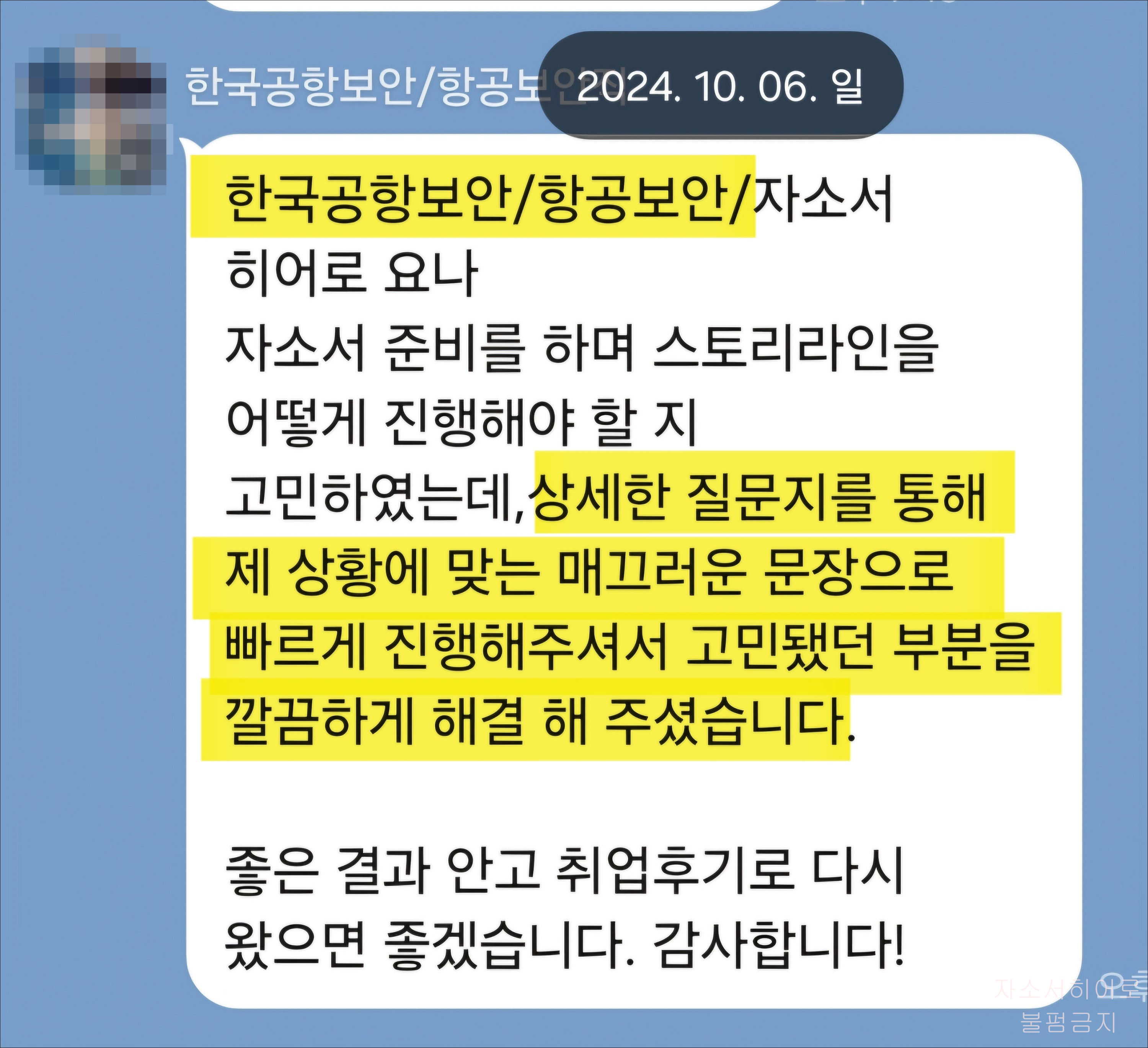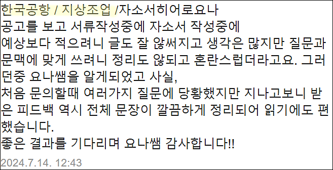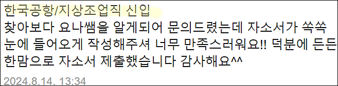 신속하고 정확한 첨삭이 필요하시다면, 수많은 합격 사례를 보유한 전문가에게 피드백을 받는 것이 가장 효율적입니다. 이러한 전문가의 도움으로 자기소개서 강점을 부각하고 개선점을 쉽게 파악할 수 있으며, 경쟁률 높은 지상조업 및 항공정비 직무에서도 서류 전형 통과 가능성을 높일 수 있습니다.