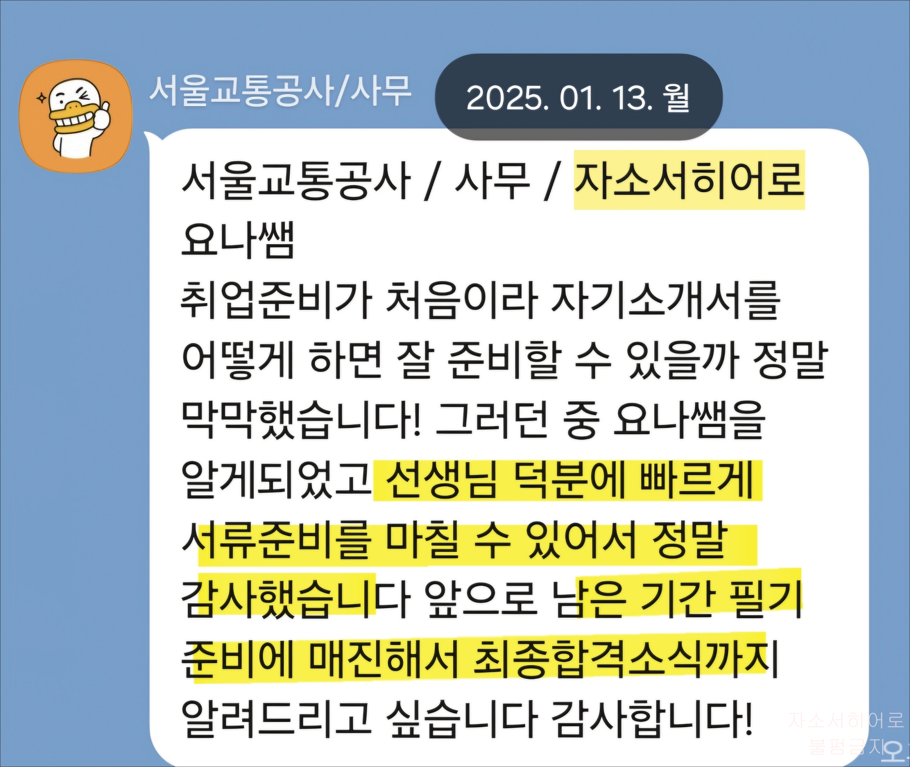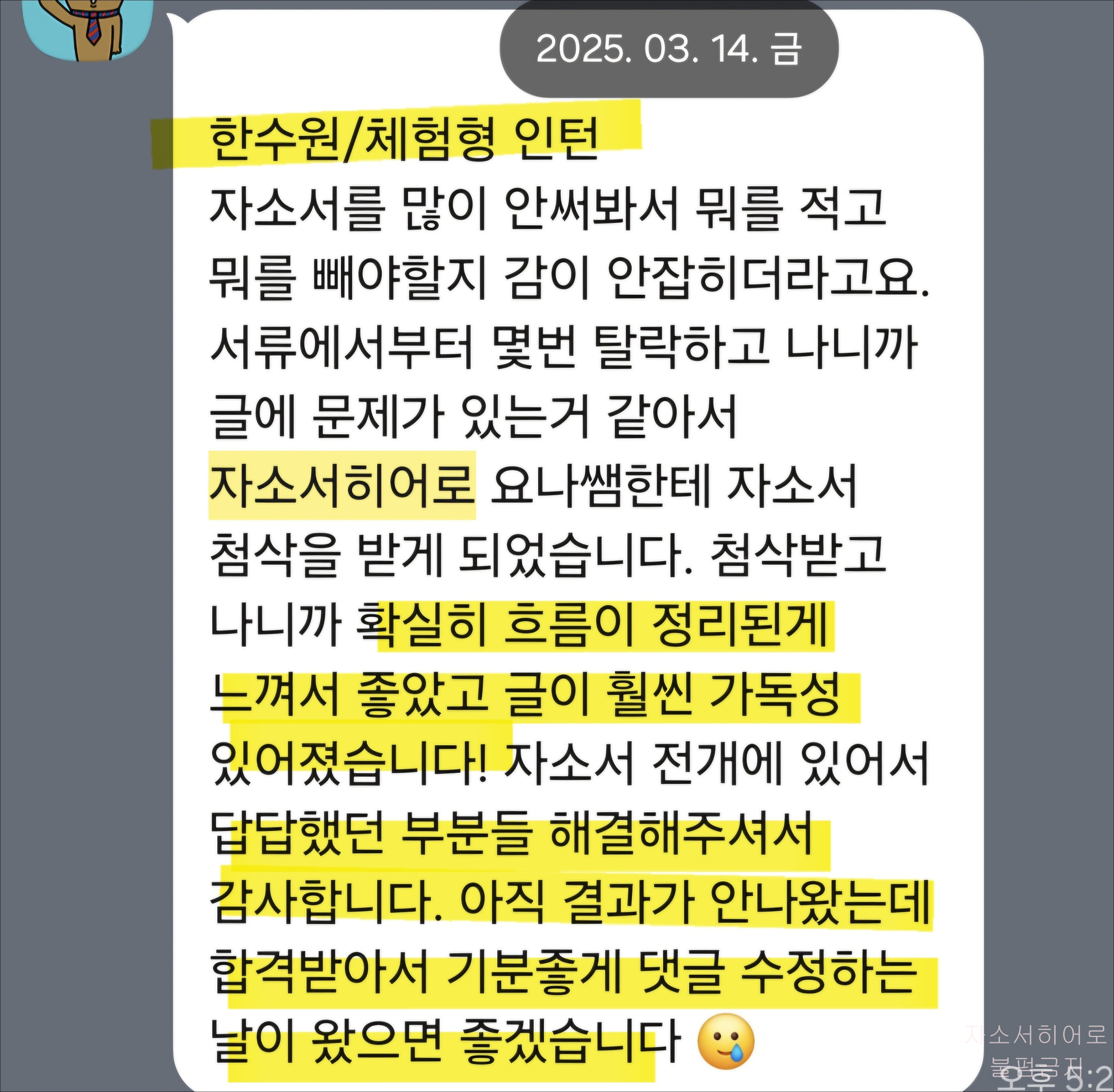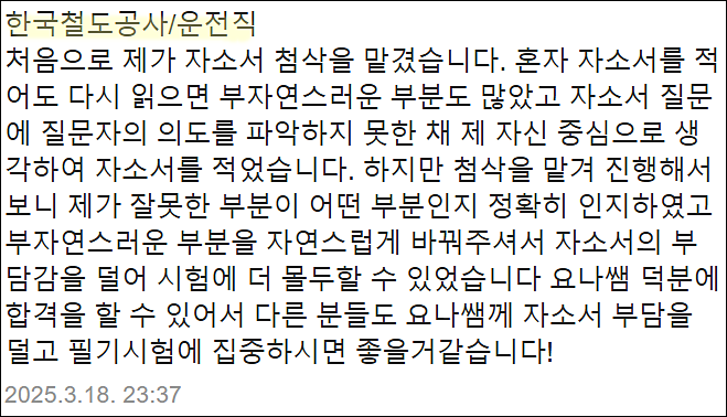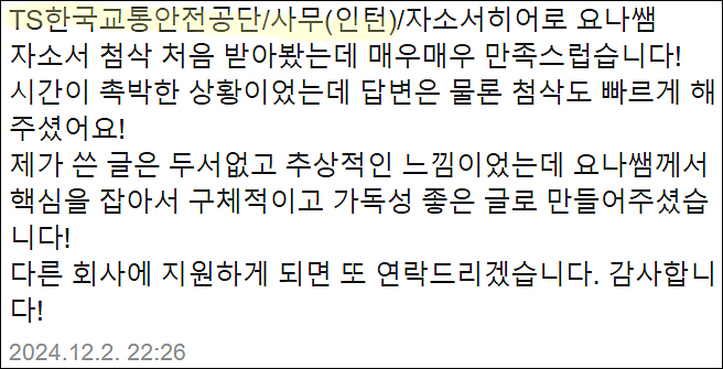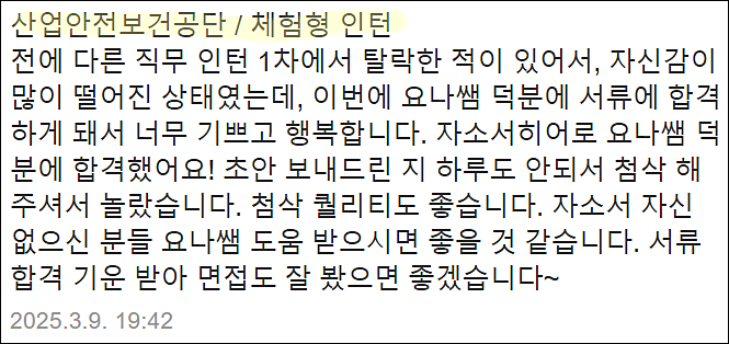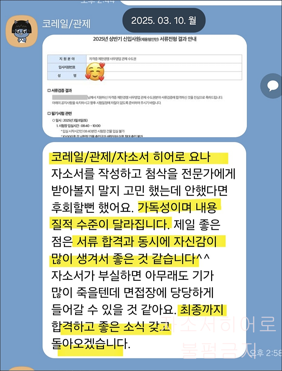 첨삭 전에는 막막했던 자기소개서가, 전문가 피드백 후 명확한 흐름과 탄탄한 구조를 갖춘 문서로 완성됩니다. 실제로 많은 분들이 첨삭 후 바로 서류합격 소식을 전해오시고 있습니다.