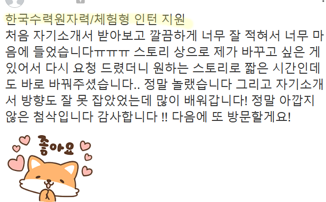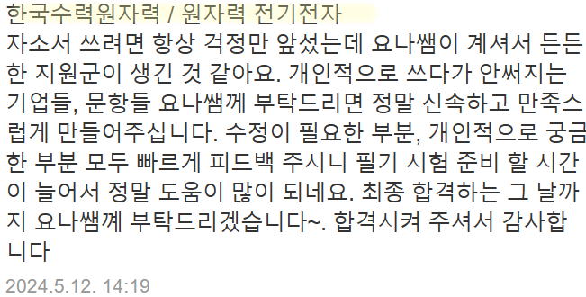 ✔ “한수원에서의 실무 경험을 통해 OOO 역량을 키워 OOO 분야 전문가가 되고 싶습니다.”