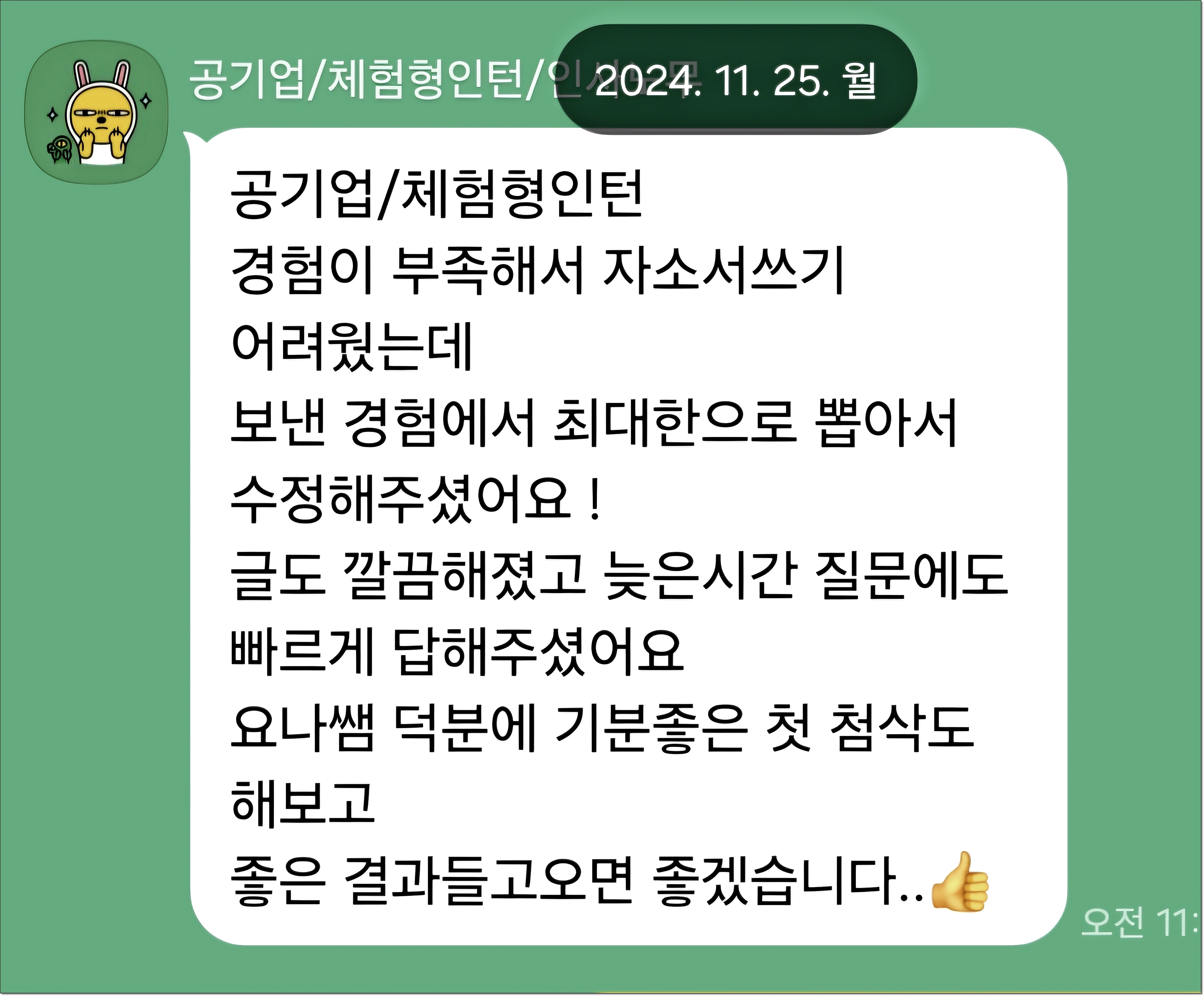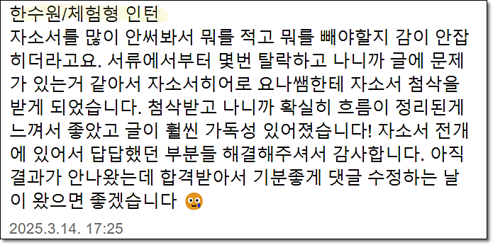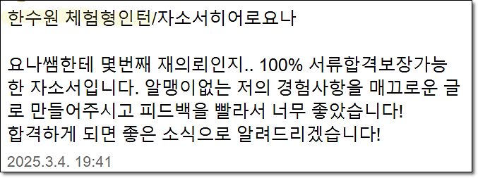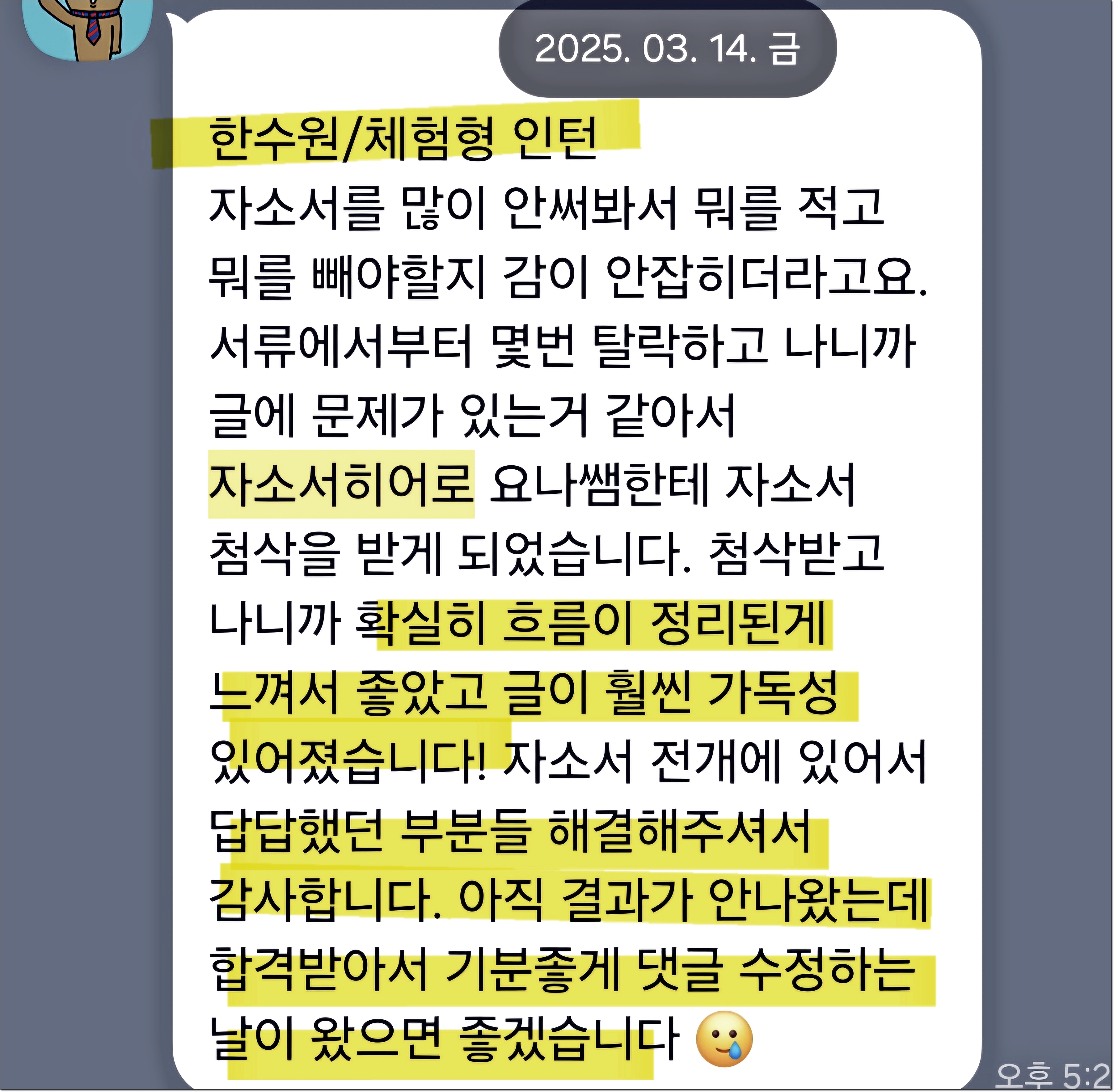 여러분의 핵심 역량을 돋보이게 하는 자기소개서를 함께 완성해드립니다. 문의는 언제든지 가능합니다.
