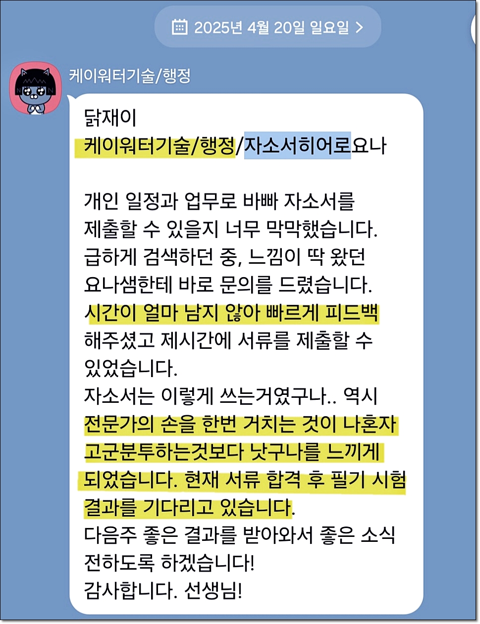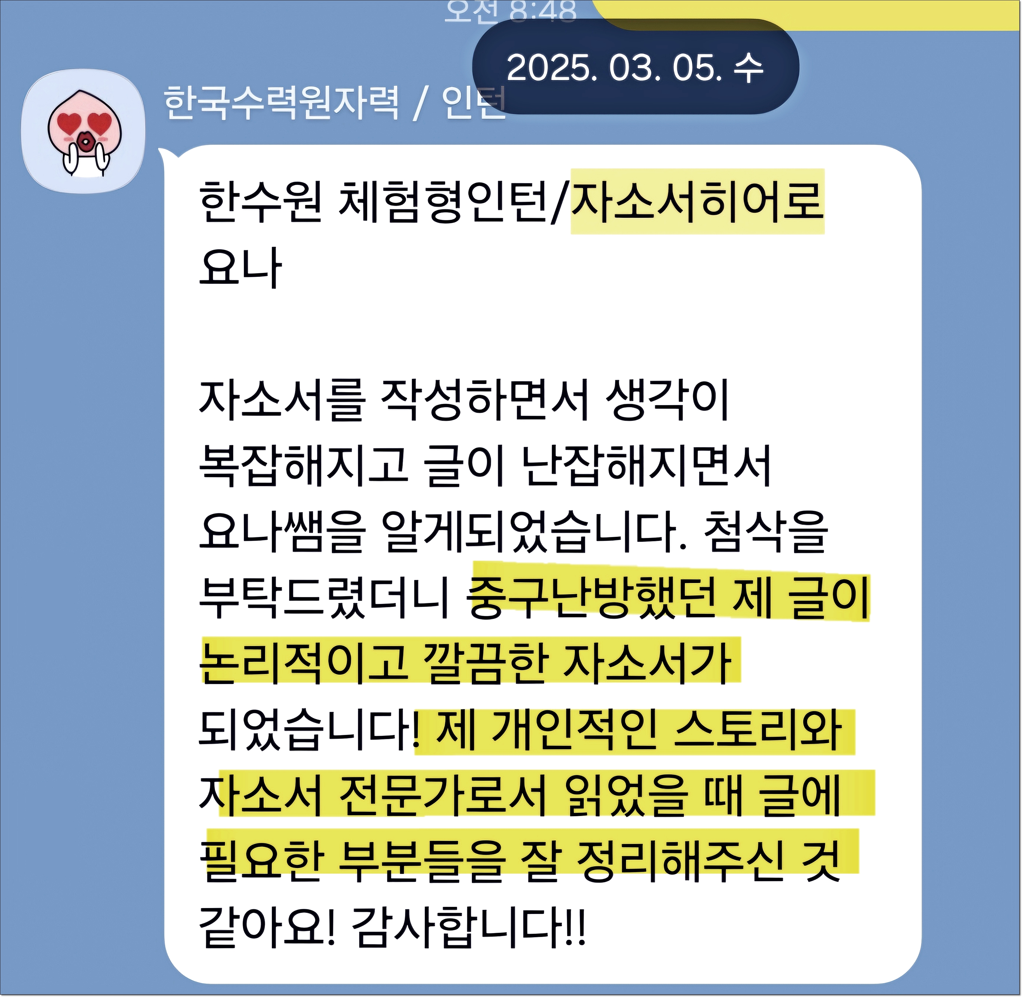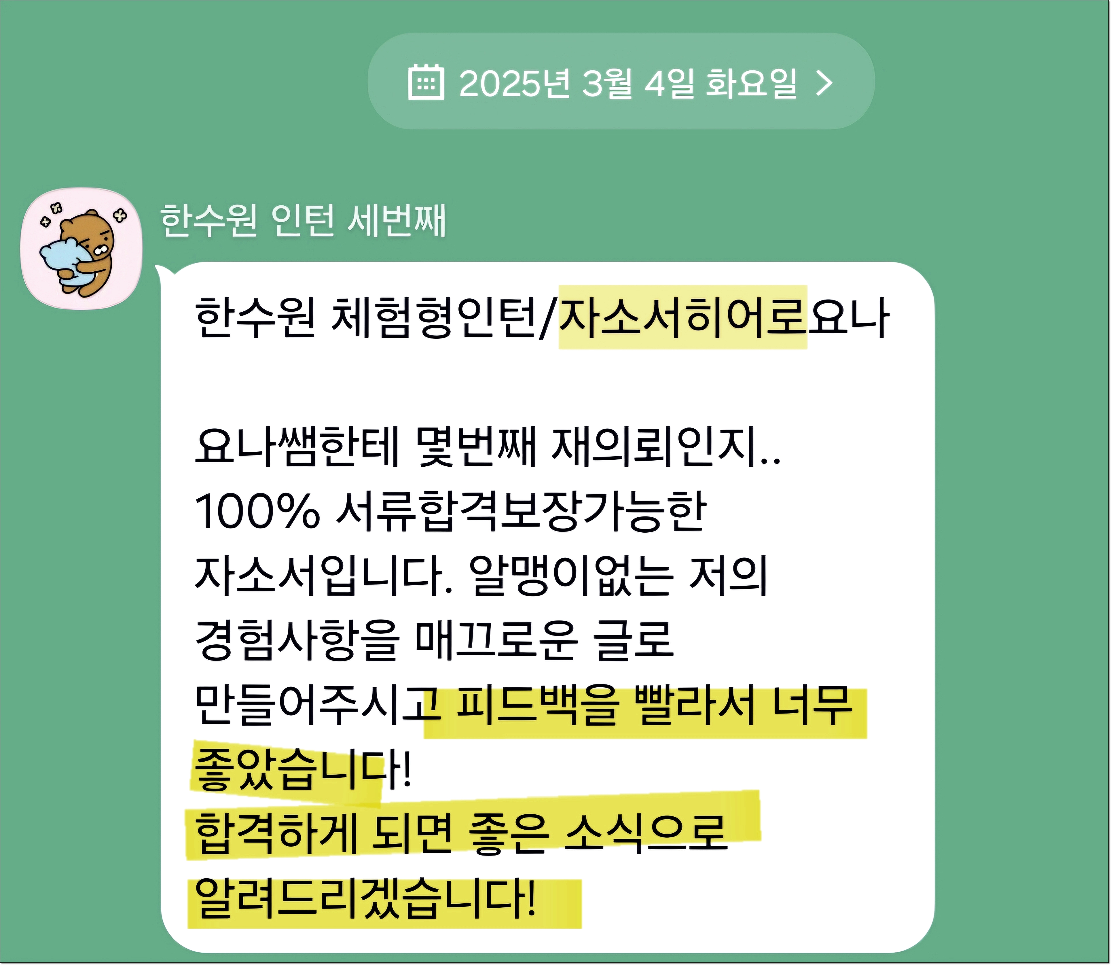 여러분의 핵심 역량을 돋보이게 하는 자기소개서를 함께 완성해드립니다. 문의는 언제든지 가능합니다.