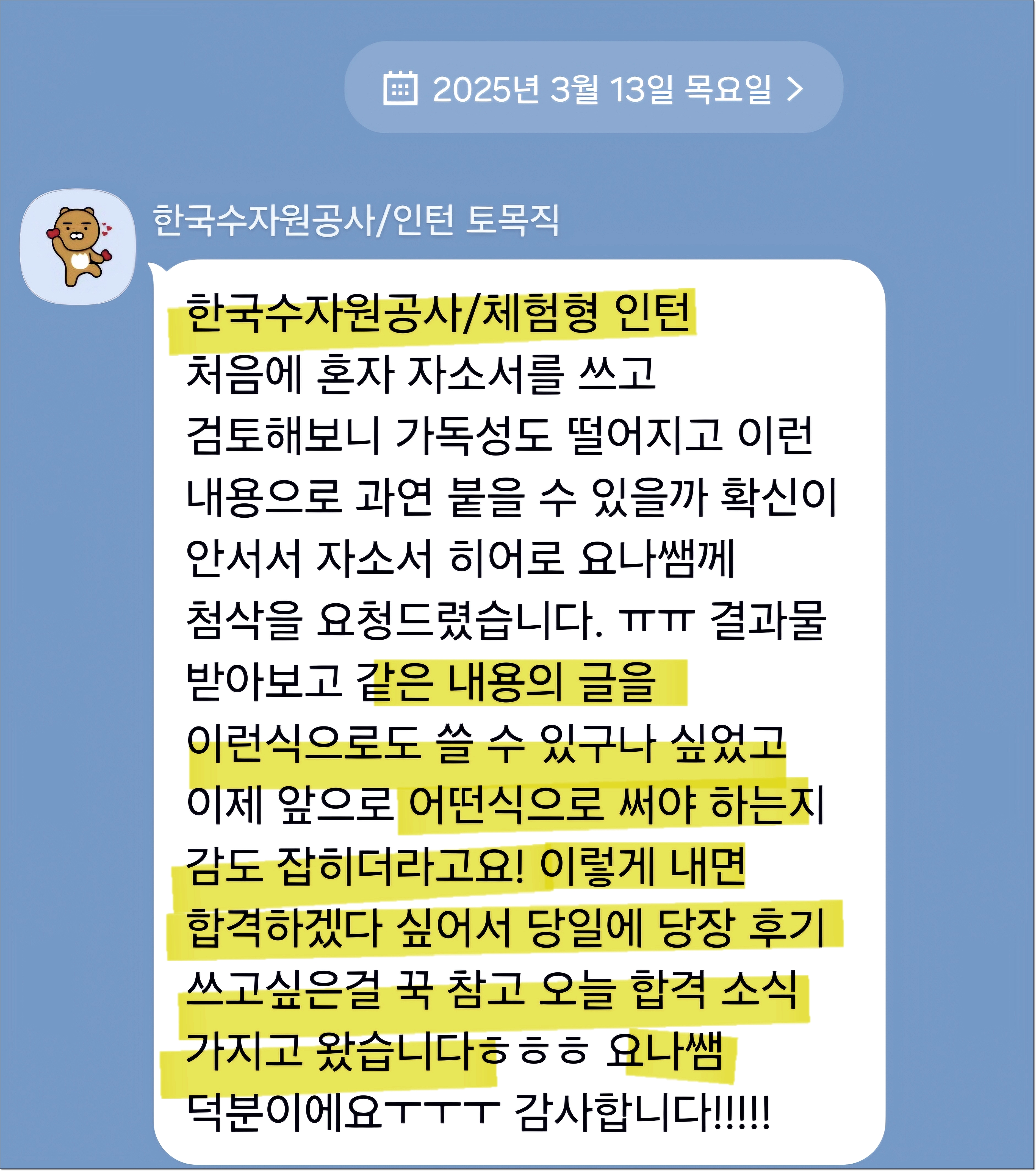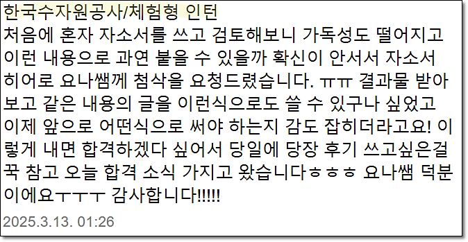문항 분석부터 답안 구성까지 막막하시다면, 전문가의 도움이 큰 차이를 만들어냅니다. 자소서히어로는 한국수자원공사를 포함한 다수의 공공기관 자기소개서 첨삭과 대필 경험을 보유하고 있으며, 95% 이상의 합격률을 자랑합니다.