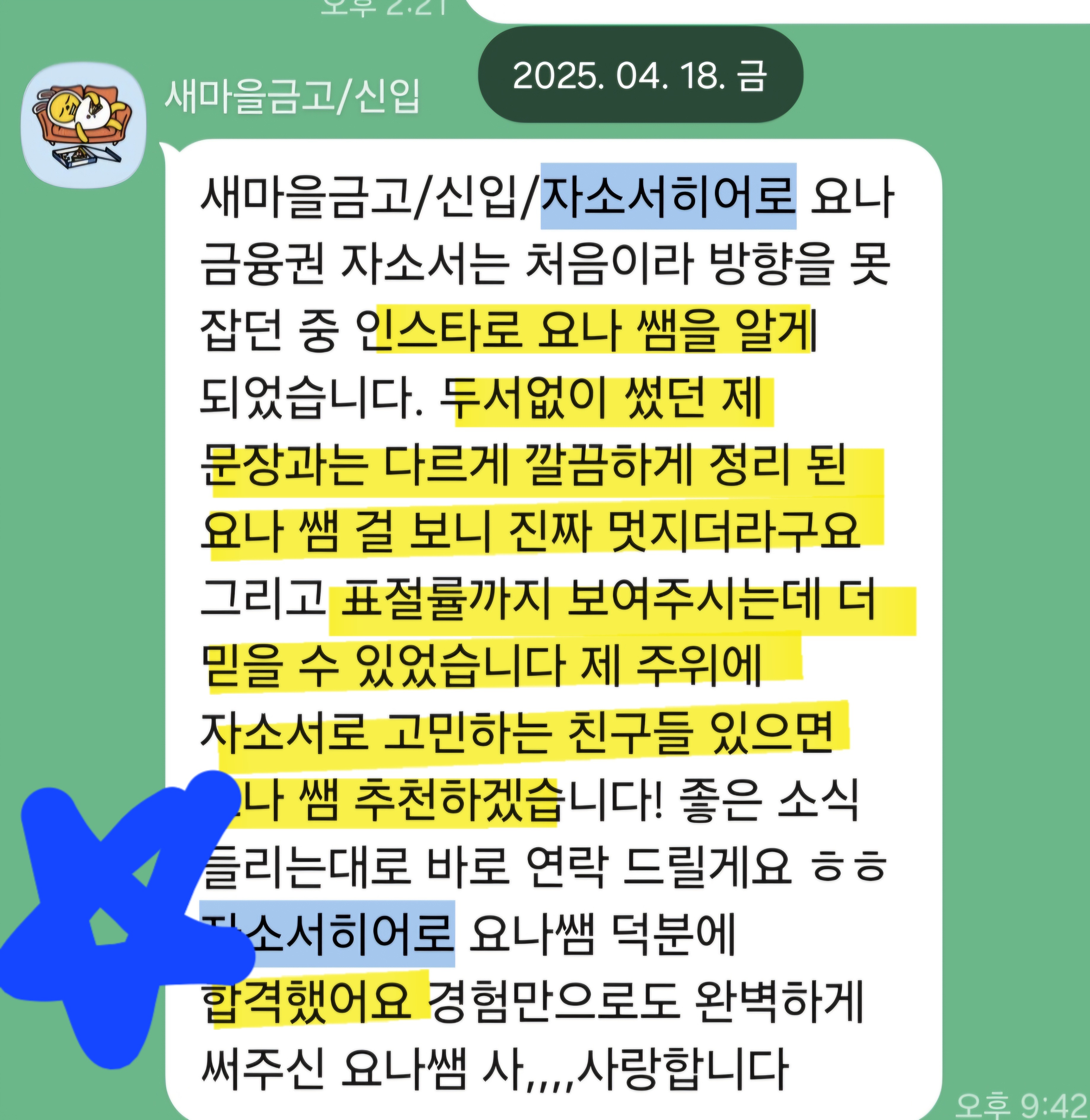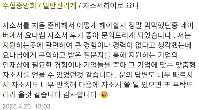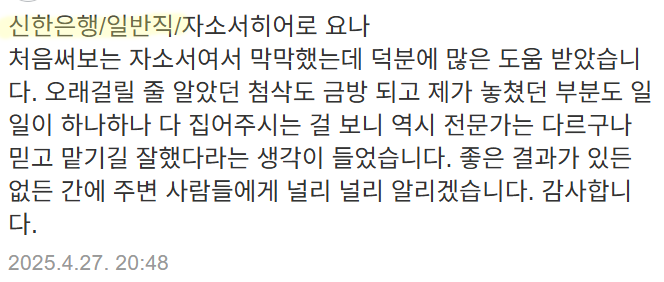 안녕하세요. 매해 3,000명, 매달 30명 이상의 의뢰인분들을 합격으로 이끌고 있는, 취업 전문 컨설턴트 자소서히어로 요나입니다.