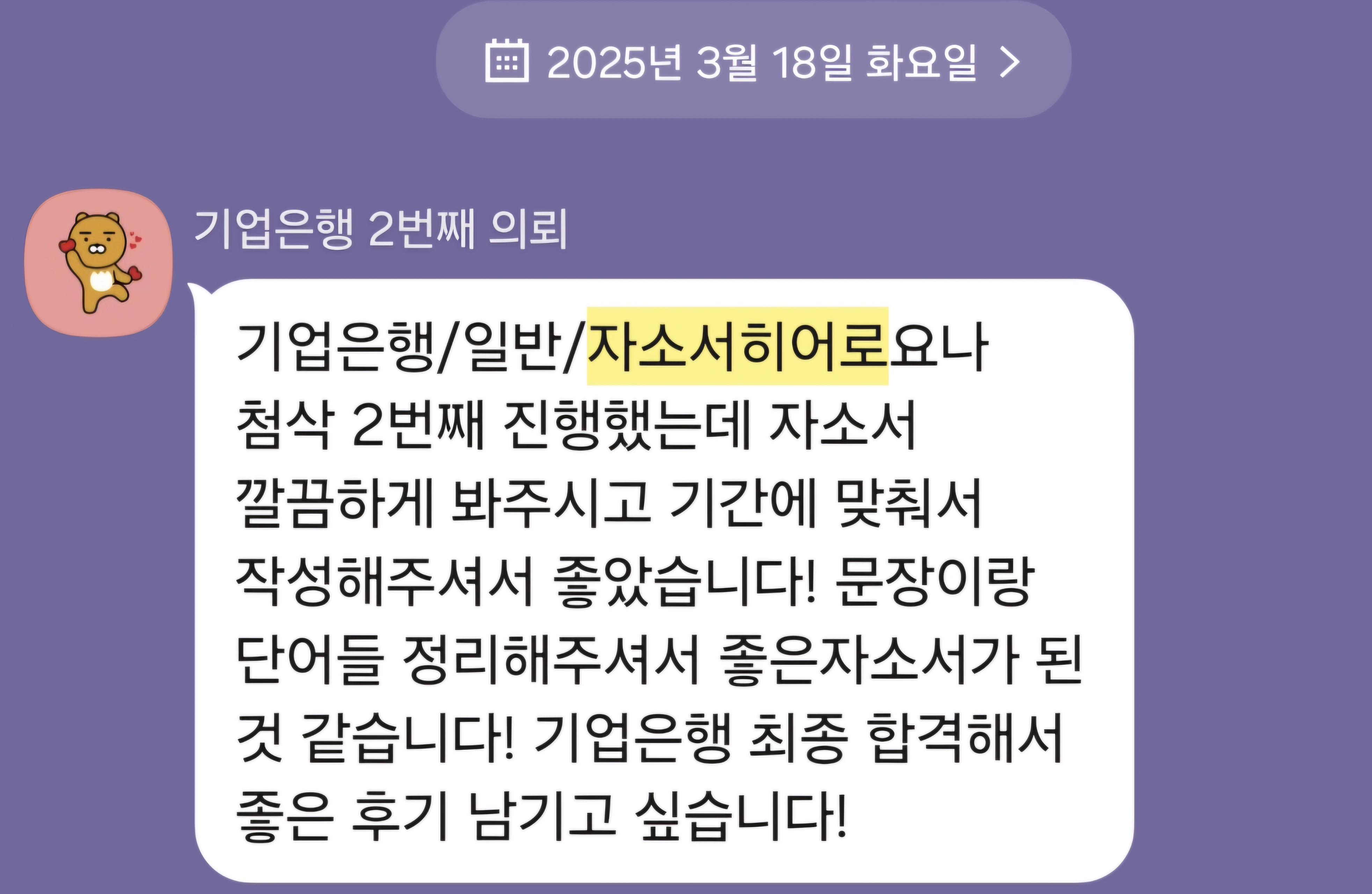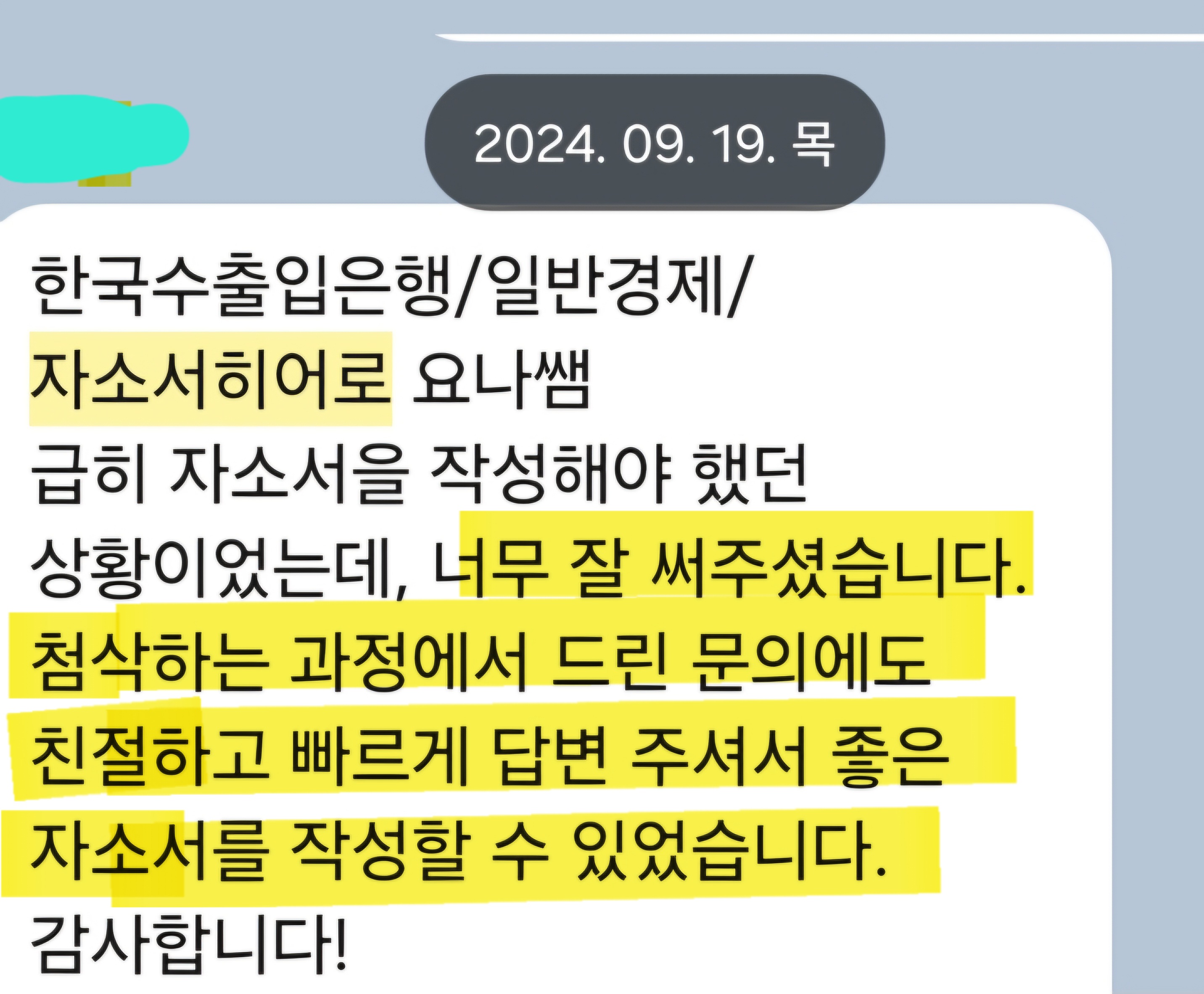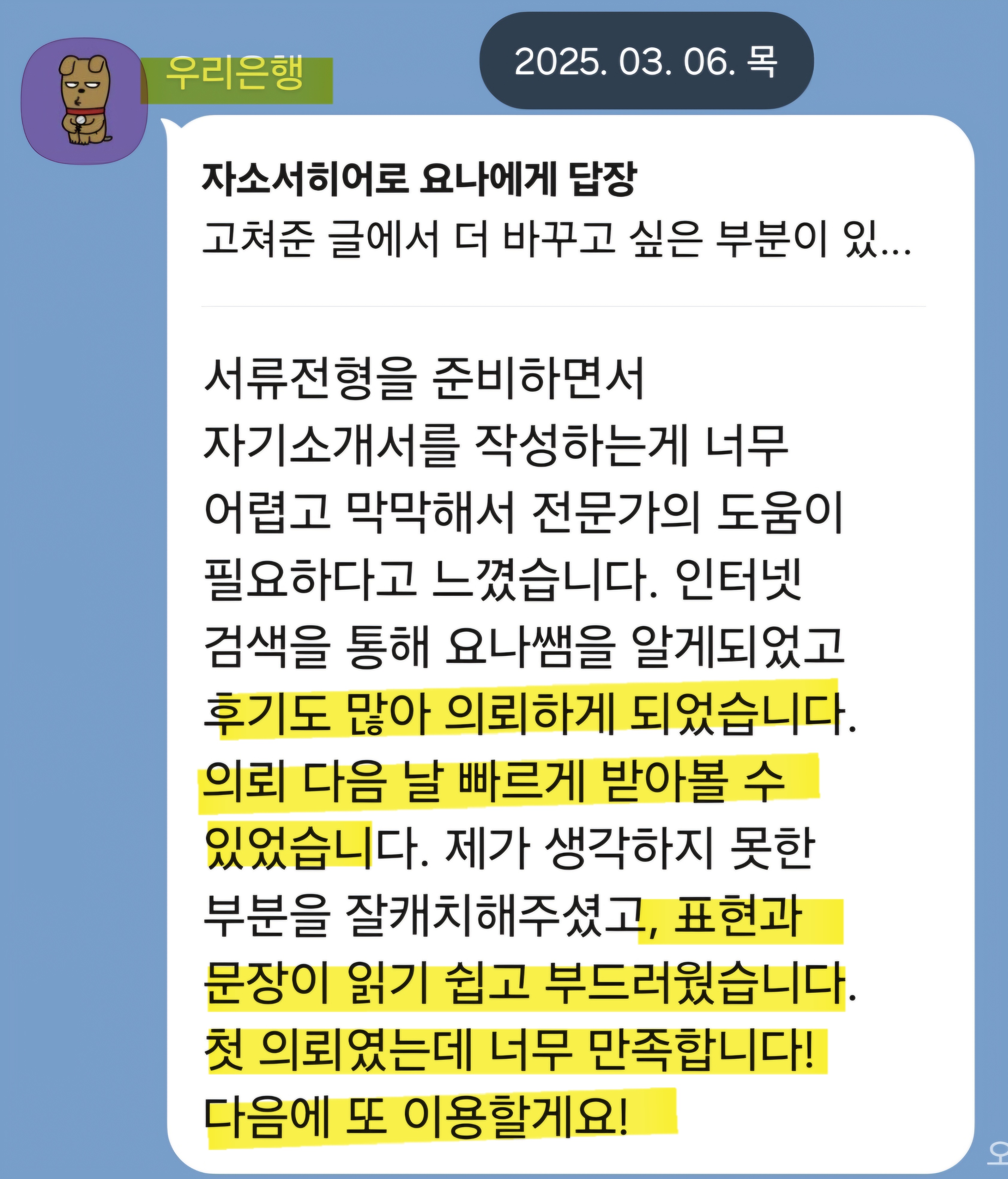 저는 10년간 대학교 취업 컨설턴트로 활동하며 3만 건 이상의 자기소개서 및 면접 컨설팅을 진행해 왔습니다. 특히 한국수출입은행, 한국은행, 산업은행 등 정책금융기관 자기소개서 첨삭 경험이 풍부합니다.
