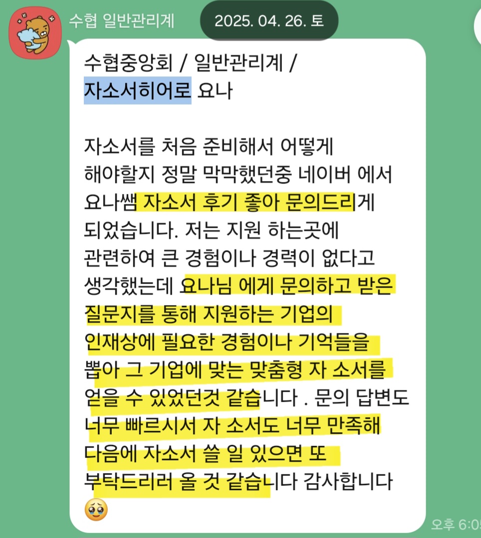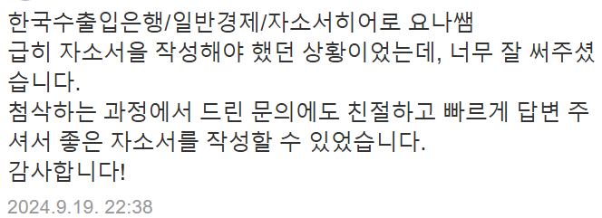 저는 10년간 대학교 취업 컨설턴트로 활동하며 3만 건 이상의 자기소개서 및 면접 컨설팅을 진행해 왔습니다. 특히 한국수출입은행, 한국은행, 산업은행 등 정책금융기관 자기소개서 첨삭 경험이 풍부합니다.
