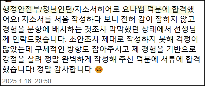 안녕하세요, 자소서히어로 요나입니다. 지난 10년 동안 대학교와 다양한 플랫폼에서 총 3만 건이 넘는 자기소개서를 첨삭하고, 95% 이상의 서류 합격률을 기록해왔습니다.