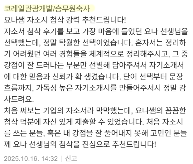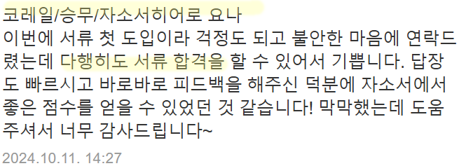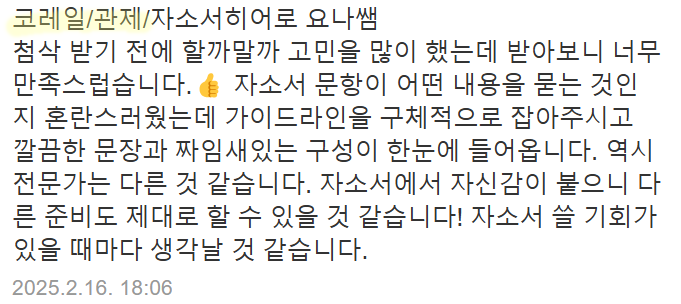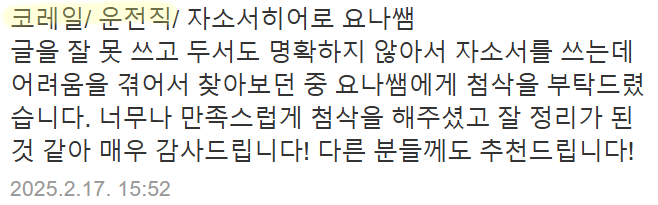 맞춤형 자기소개서 첨삭으로 서류 합격을 보장합니다. 만족도 5.0, 당일 완성 가능!