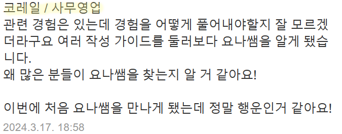 10년 경력 취업 컨설턴트 | 크몽 후기 2,000개 이상 | 평균 서류 합격률 95%