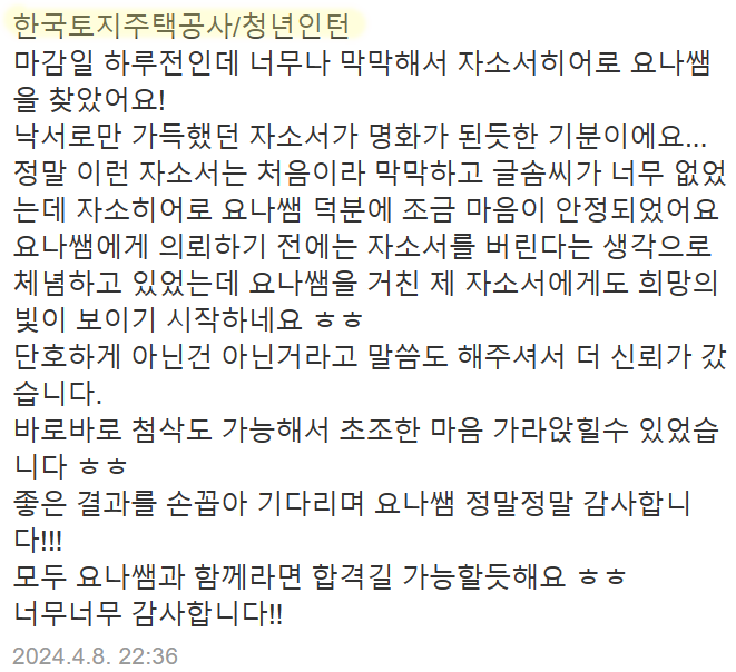 - 주택 정책 및 공공임대주택 관리 실무를 경험하며 현장 중심의 직무 역량을 키우고 싶다는 점을 강조합니다.