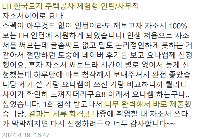 - LH 체험형 인턴 과정을 통해 직무 역량을 실질적으로 키우고 싶다는 목표를 설정합니다.