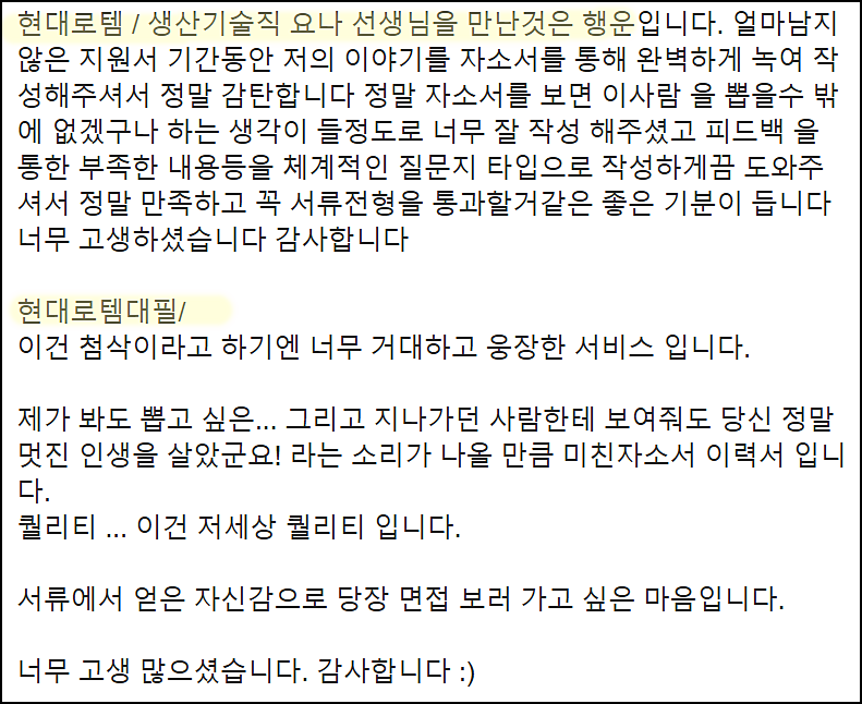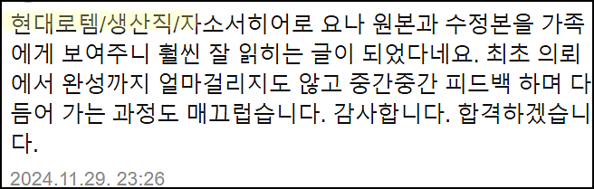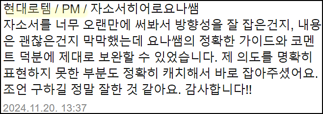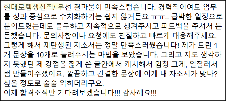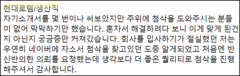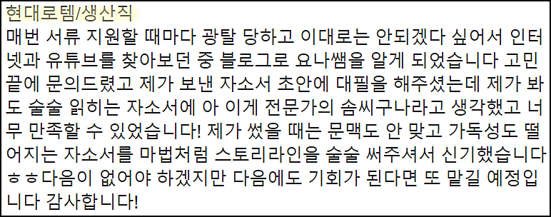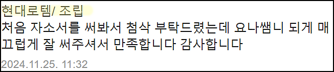 단순히 글을 다듬는 수준이 아닌, 직무와 기업에 맞춘 전략적 자기소개서를 완성하고 싶으시다면 지금 바로 상담해 보세요.