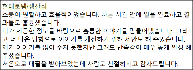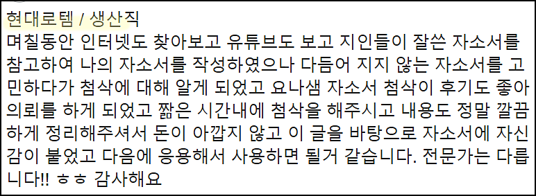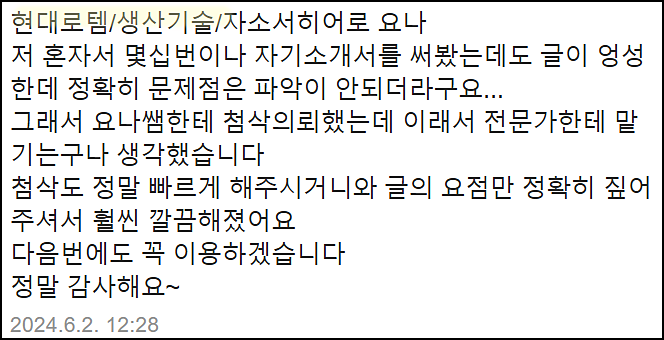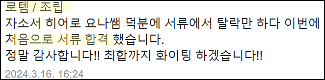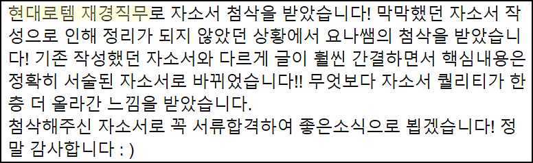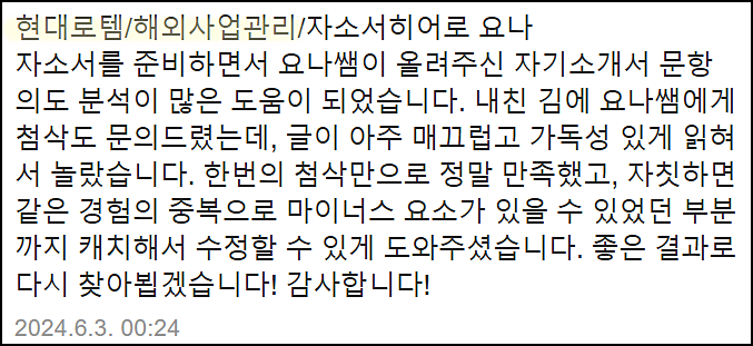 단순히 글을 다듬는 수준이 아닌, 직무와 기업에 맞춘 전략적 자기소개서를 완성하고 싶으시다면 지금 바로 상담해 보세요.