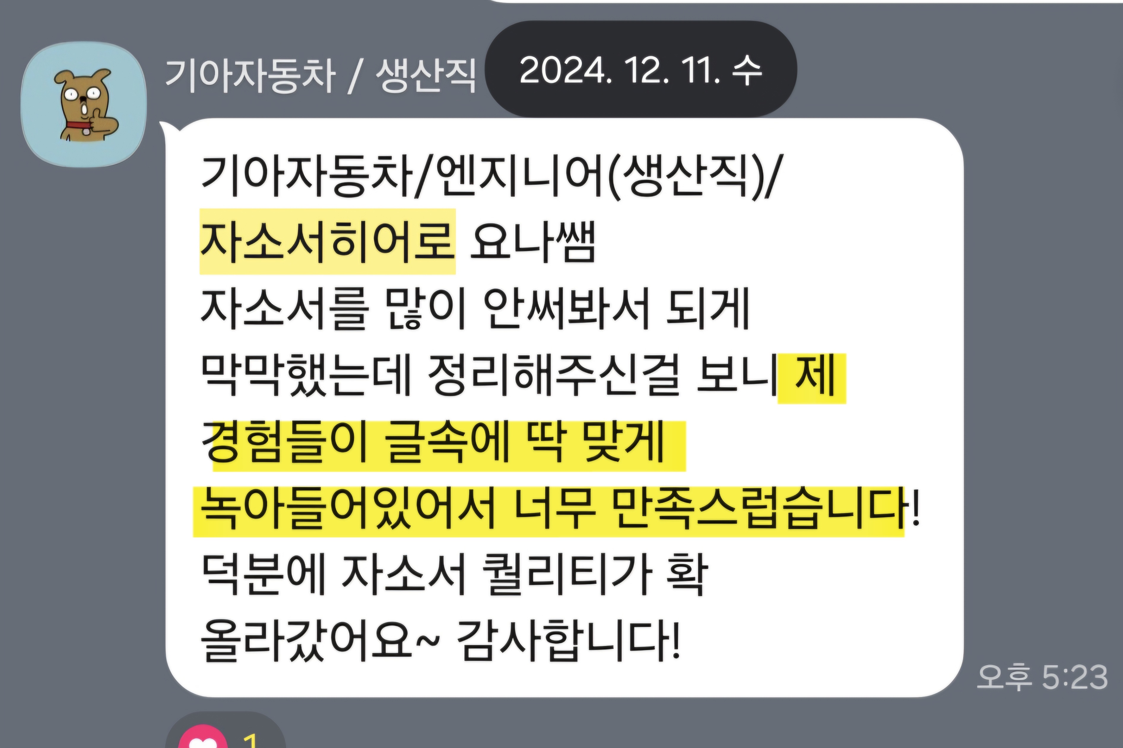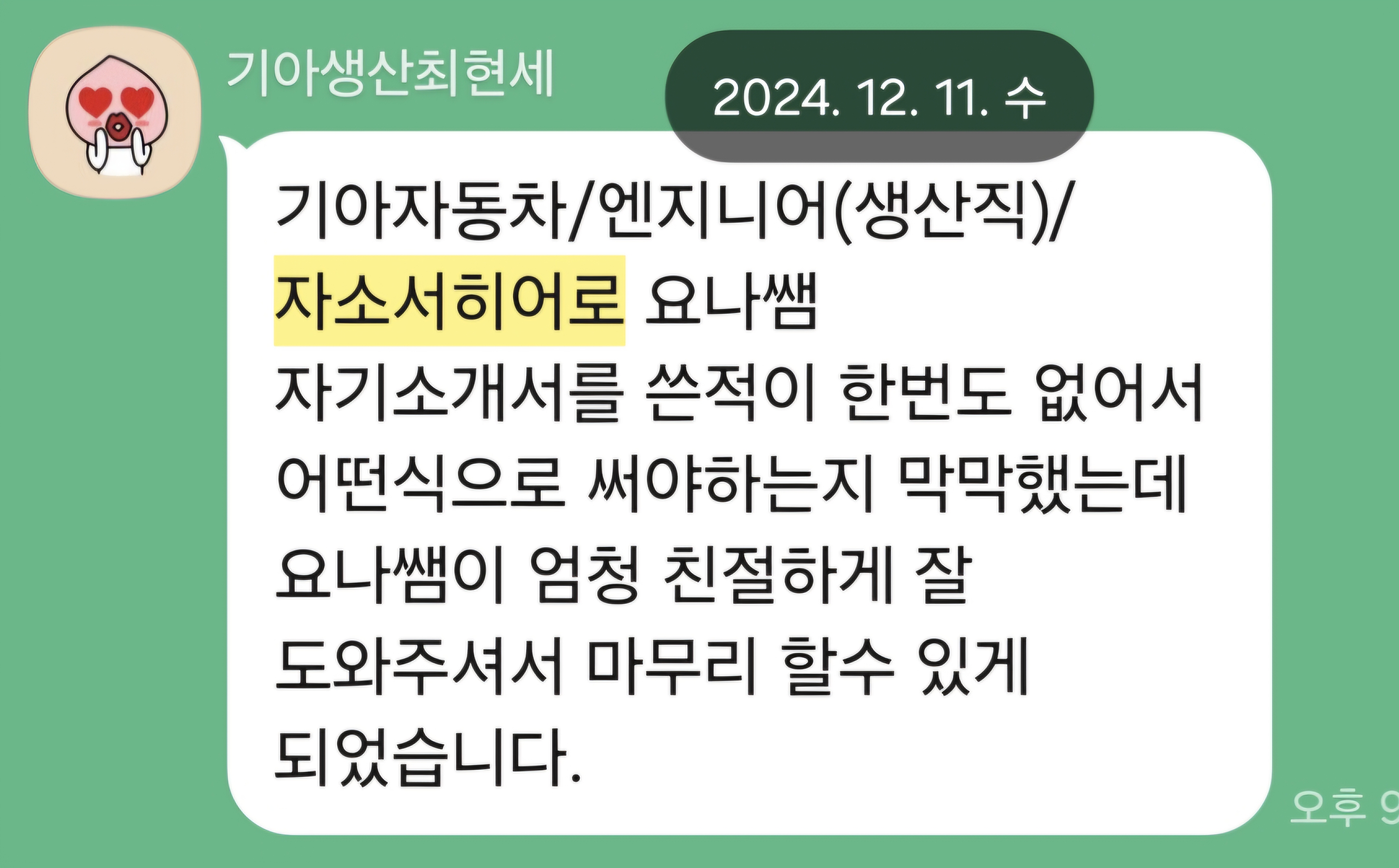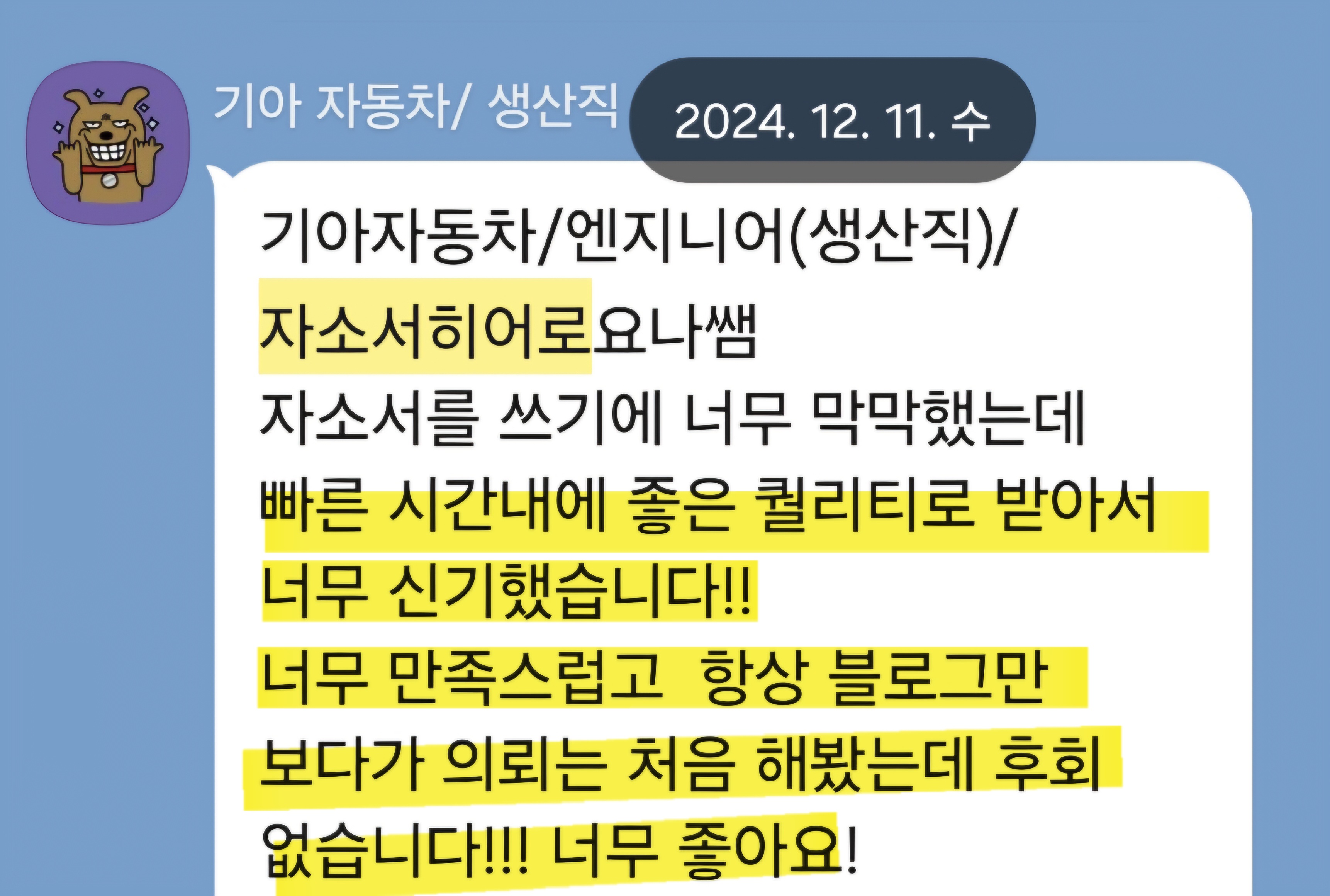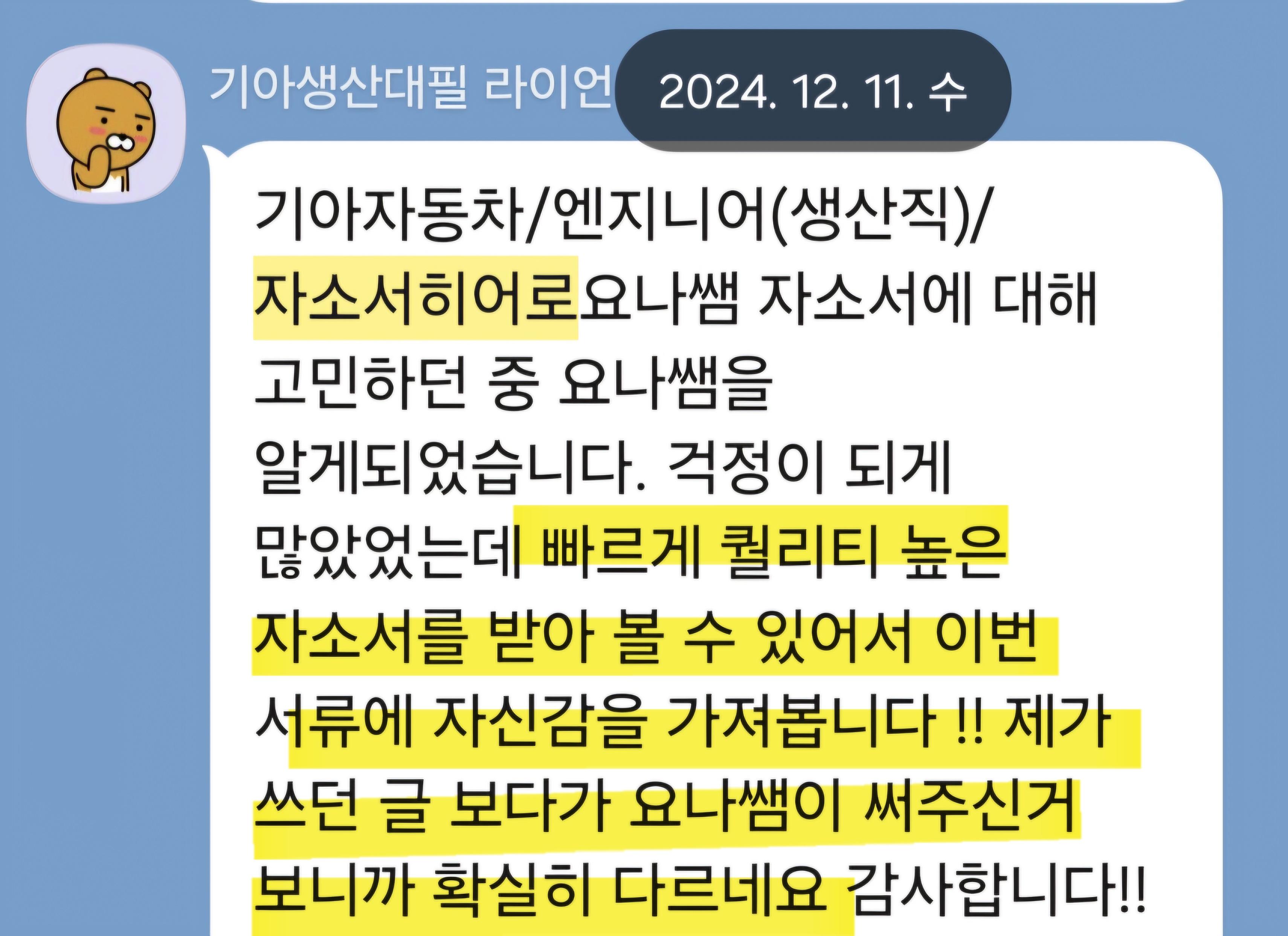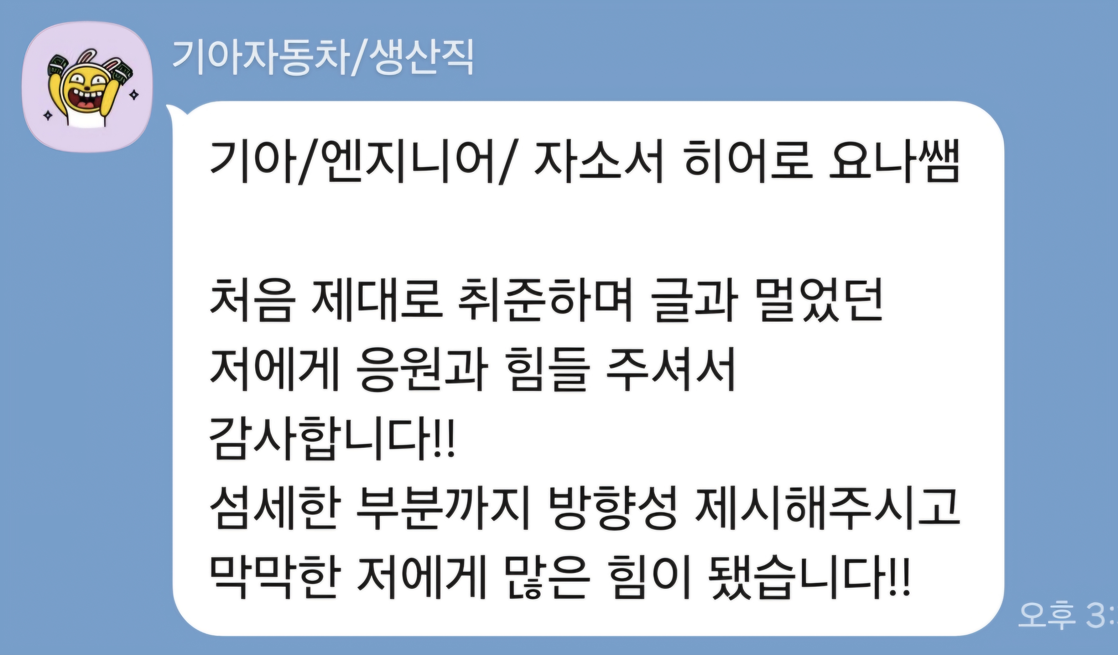 “A님은 기술 인력을 강조하는 문항 작성에서 경험을 구체적으로 연결하지 못해 어려움을 겪으셨습니다. 저희는 A님의 생산 관리 경험과 현대자동차의 직무 특성을 연결해 스토리를 강화했고, 서류 합격 후 면접까지 성공적으로 통과하셨습니다.”