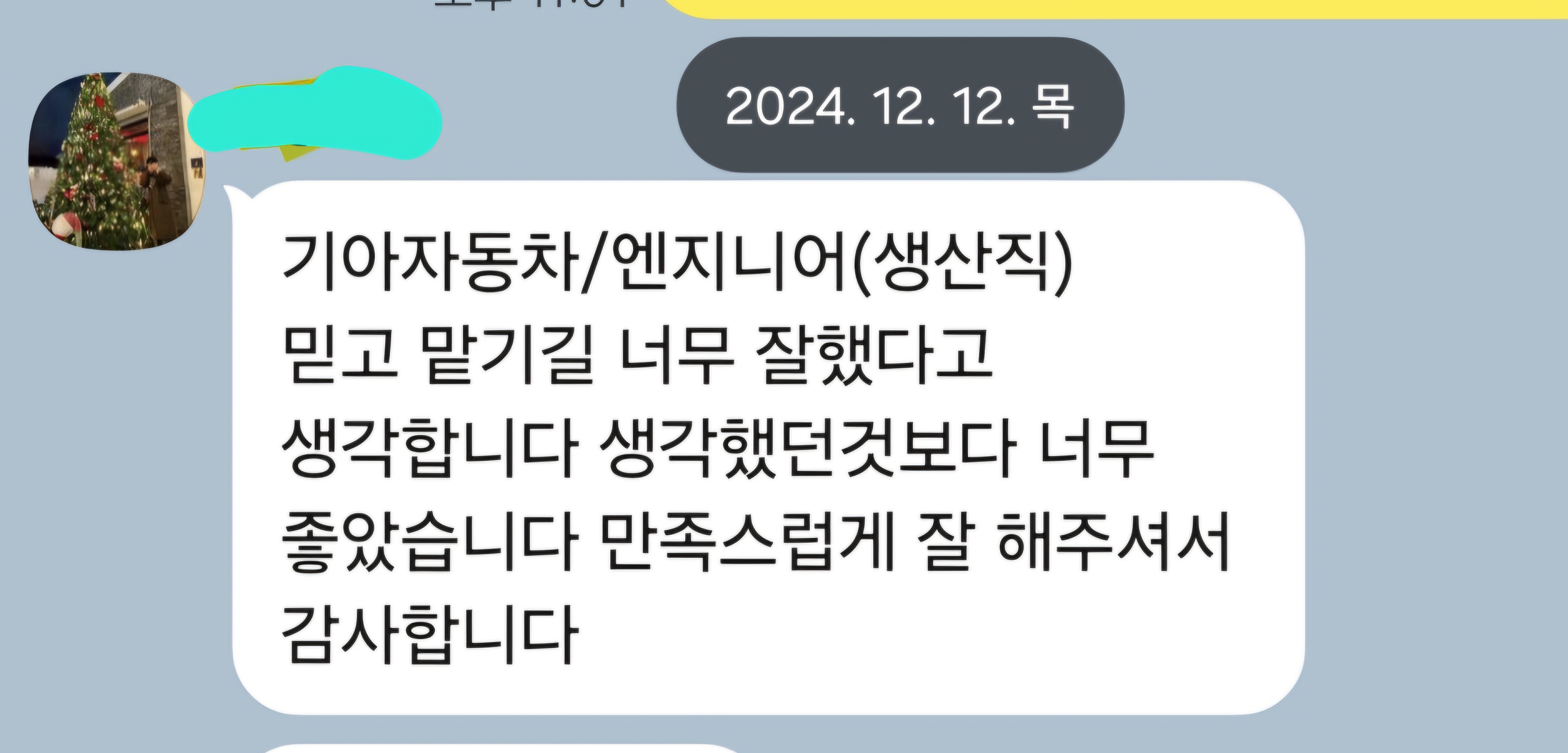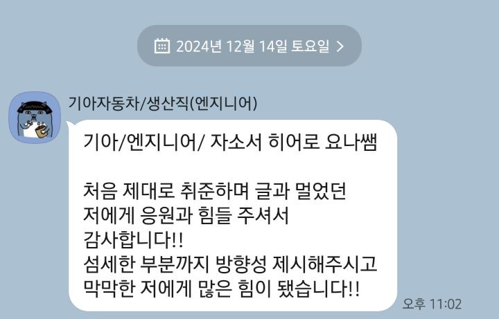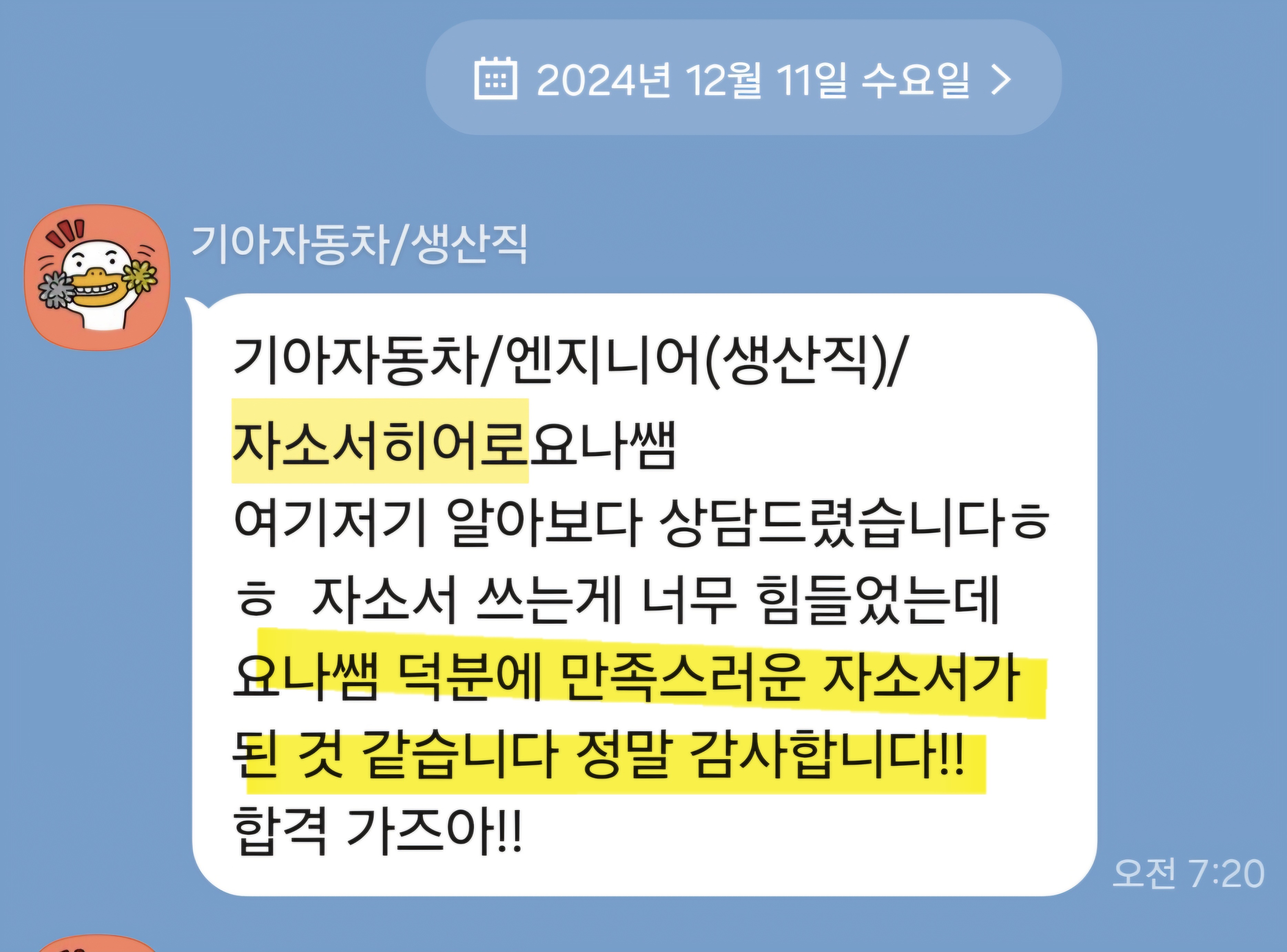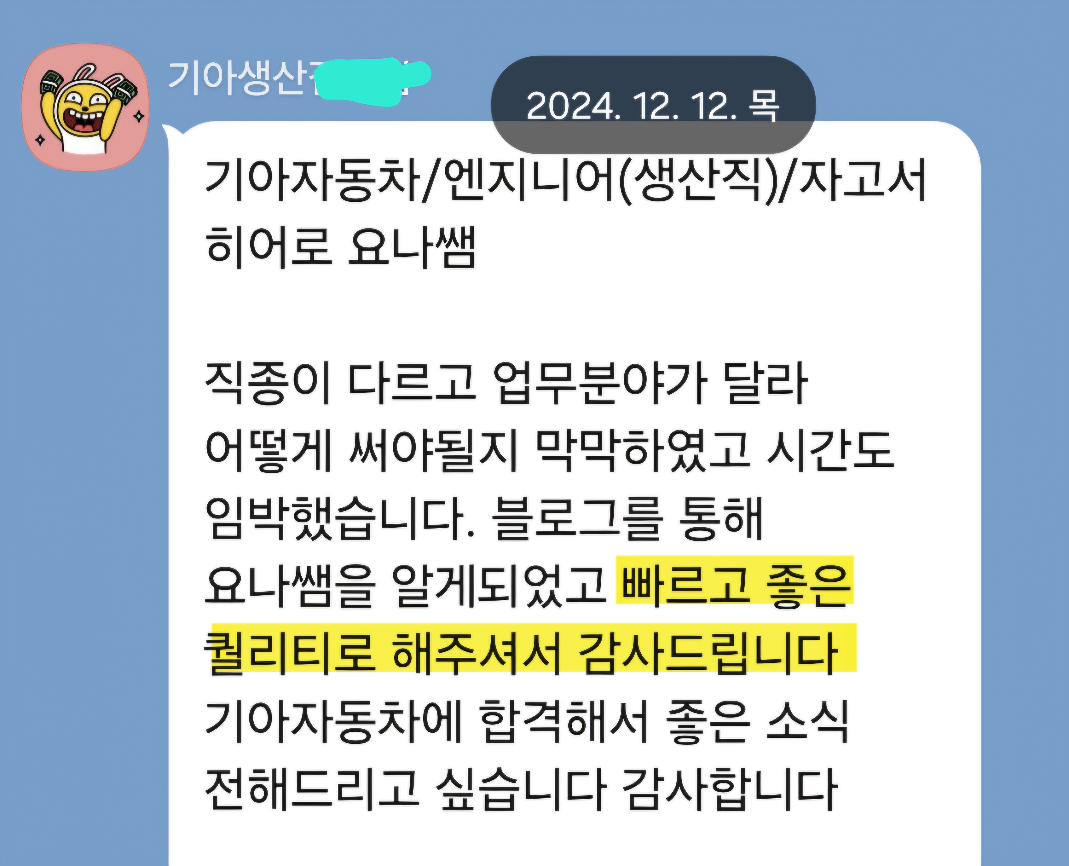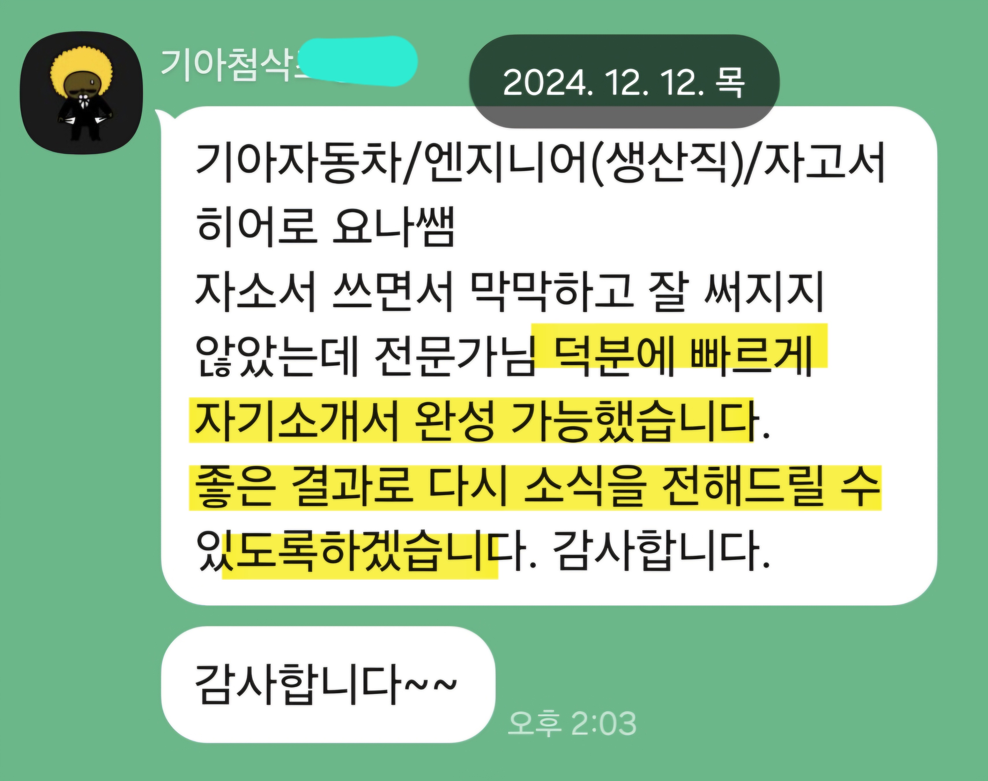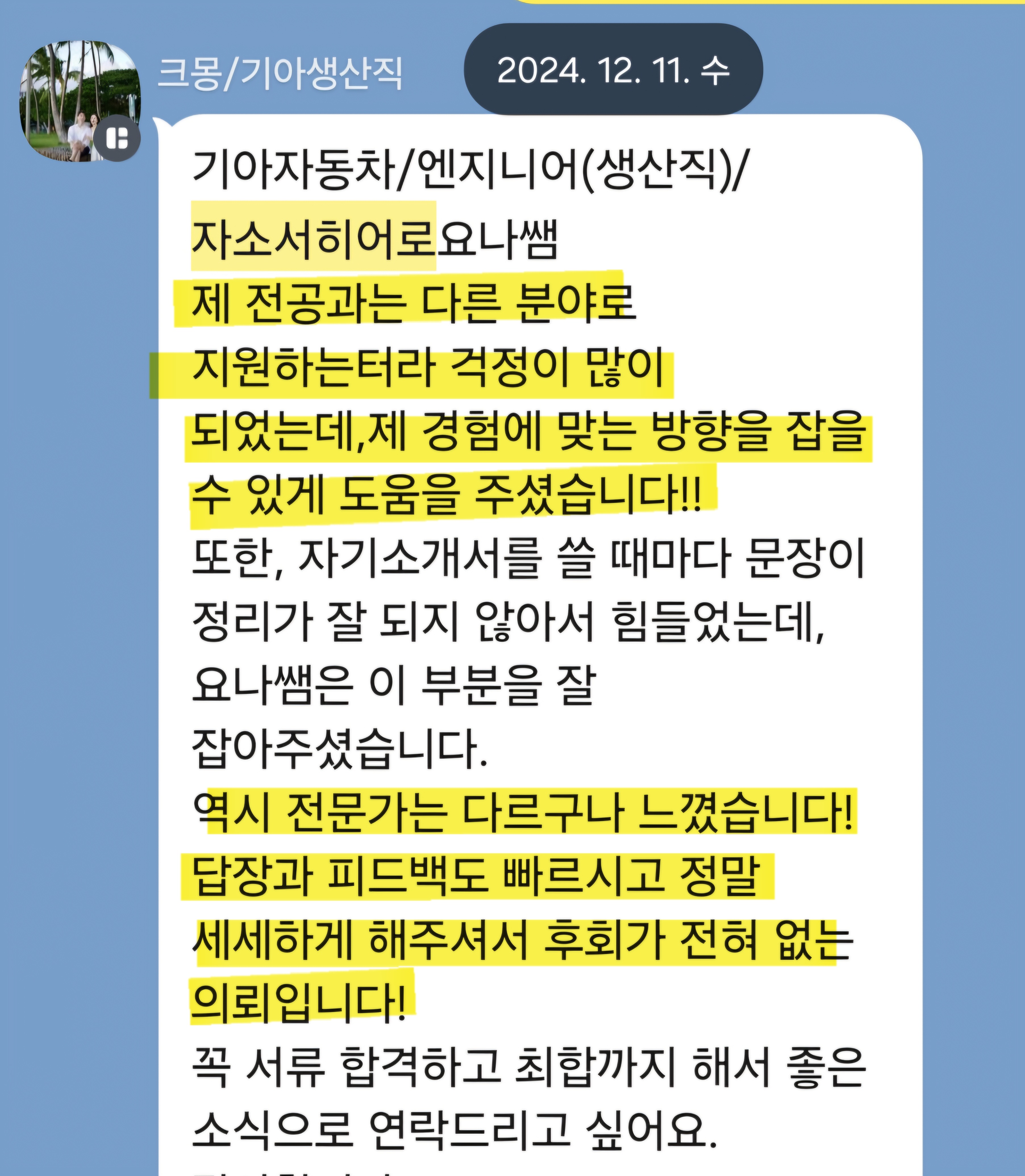 “A님은 기술 인력을 강조하는 문항 작성에서 경험을 구체적으로 연결하지 못해 어려움을 겪으셨습니다. 저희는 A님의 생산 관리 경험과 현대자동차의 직무 특성을 연결해 스토리를 강화했고, 서류 합격 후 면접까지 성공적으로 통과하셨습니다.”