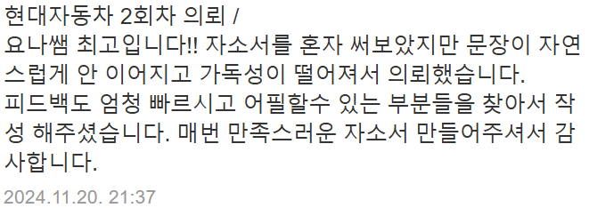 - 맞춤형 첨삭 서비스: 현대차 인재상과 문항별 분석에 맞춘 자기소개서 작성.
