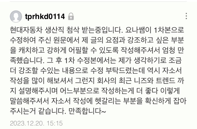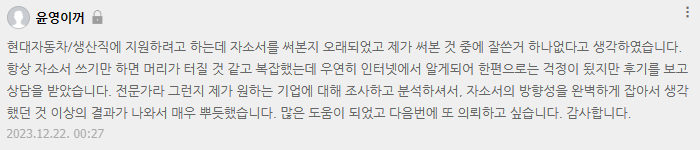 - 맞춤형 첨삭 서비스: 현대차 인재상과 문항별 분석에 맞춘 자기소개서 작성.