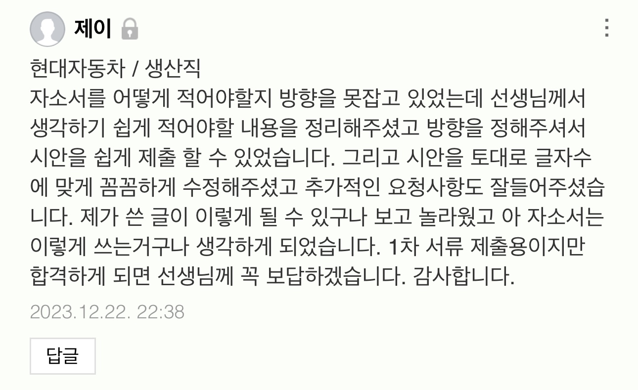 - 전문성과 풍부한 경험: 10년간 30,000건 이상의 첨삭 경험.