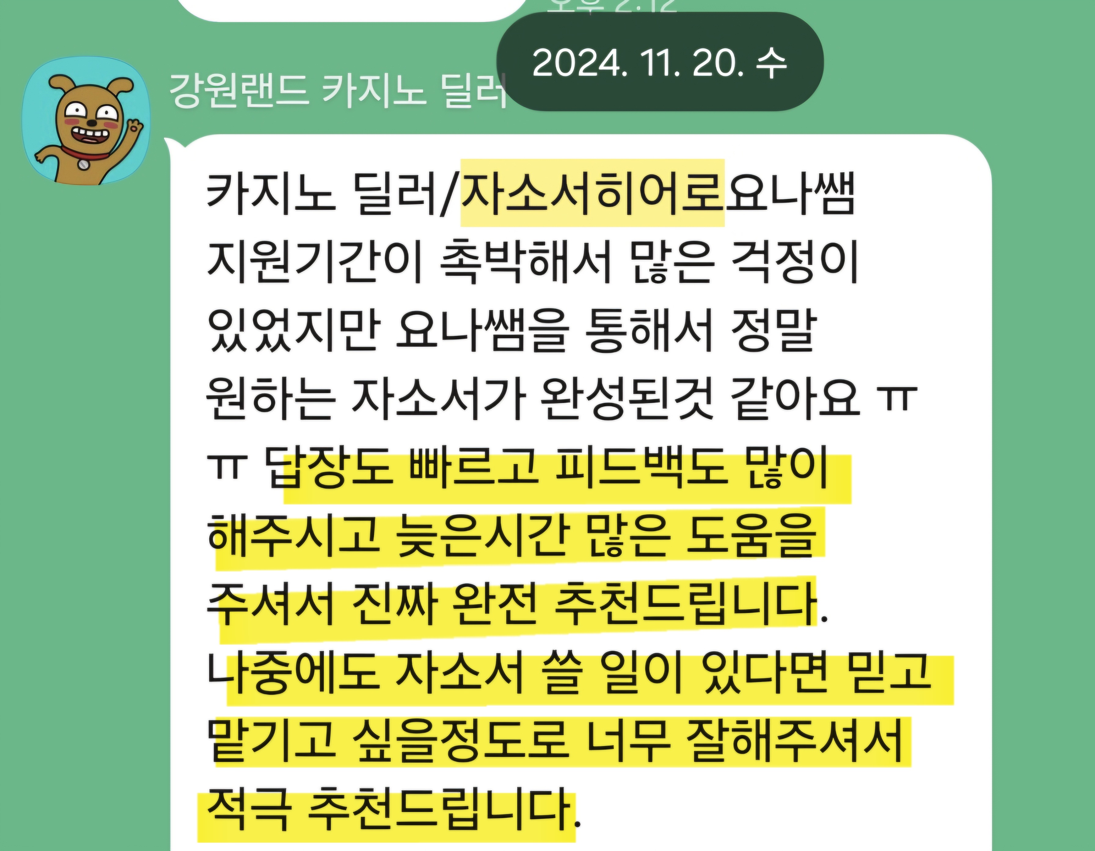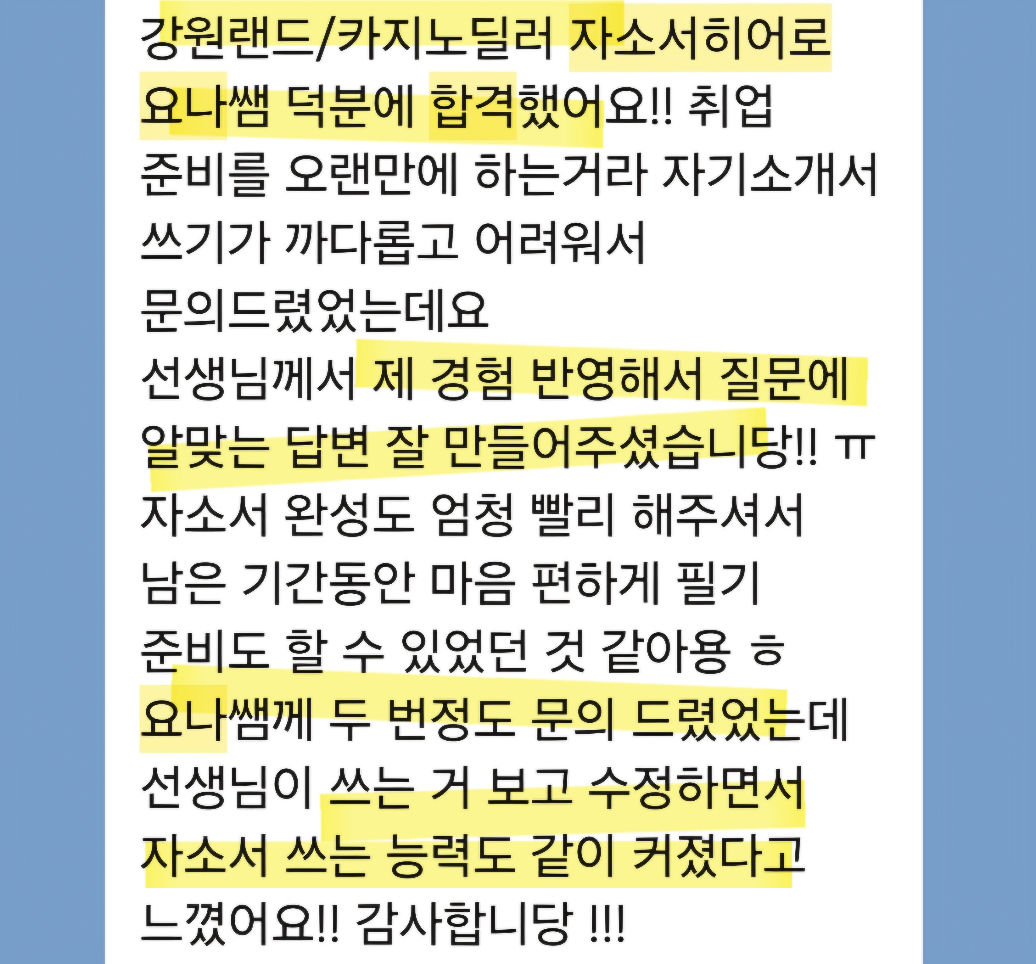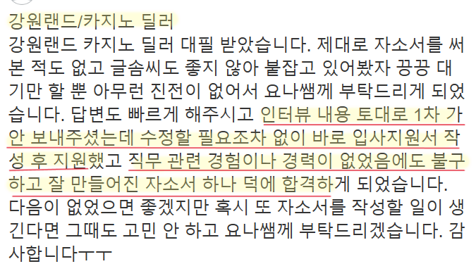 24시간 내 강원랜드 자소서 첨삭 및 맞춤 작성이 가능합니다. 문의는 아래 연락처로 주세요.