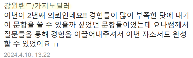 자소서히어로 요나는 10년간 3만 건 이상의 자기소개서 첨삭, 자소서 대필을 진행해 왔으며, 특히 공기업 자기소개서에 특화되어 있습니다. 강원랜드 자기소개서 항목별 요구사항에 맞춘 첨삭 및 작성 가이드 제공이 가능합니다.
