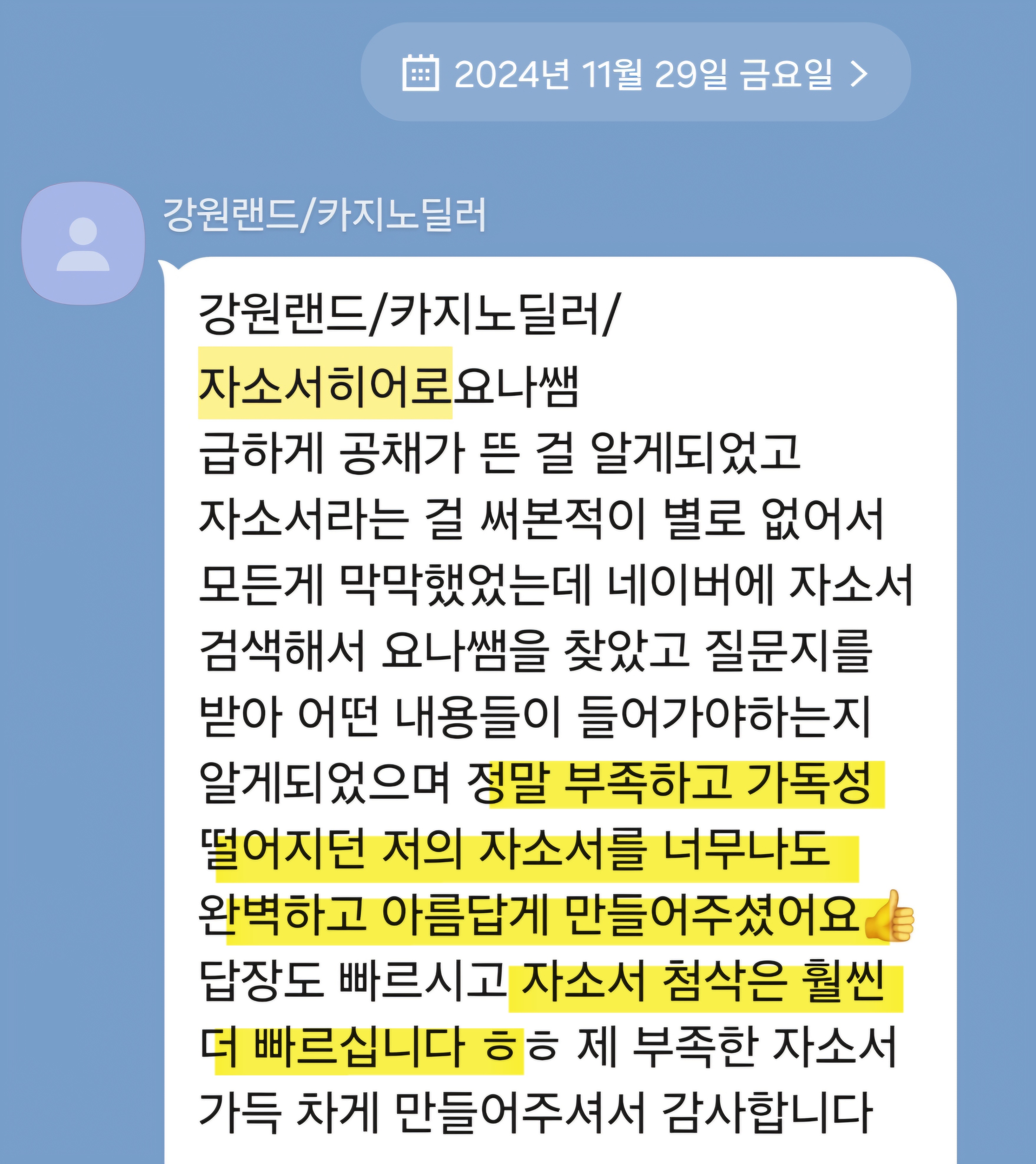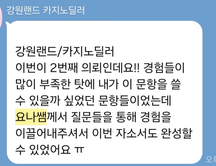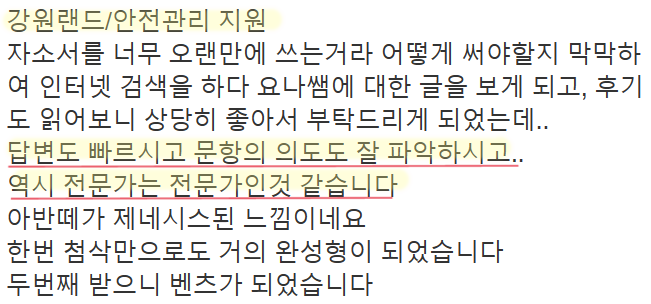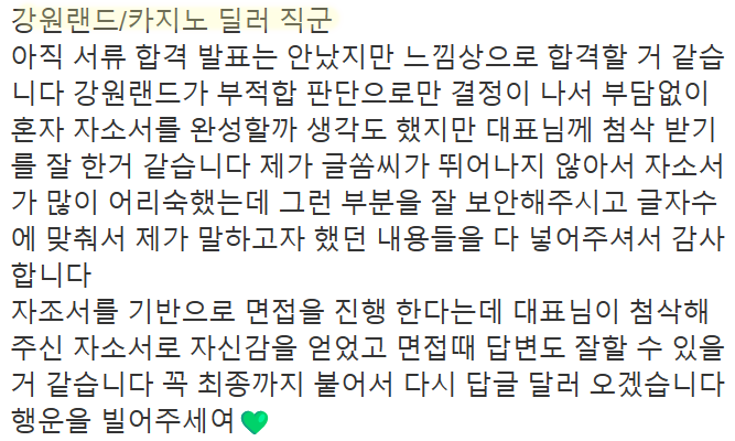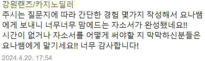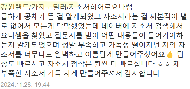24시간 내 강원랜드 자소서 첨삭 및 맞춤 작성이 가능합니다. 문의는 아래 연락처로 주세요.