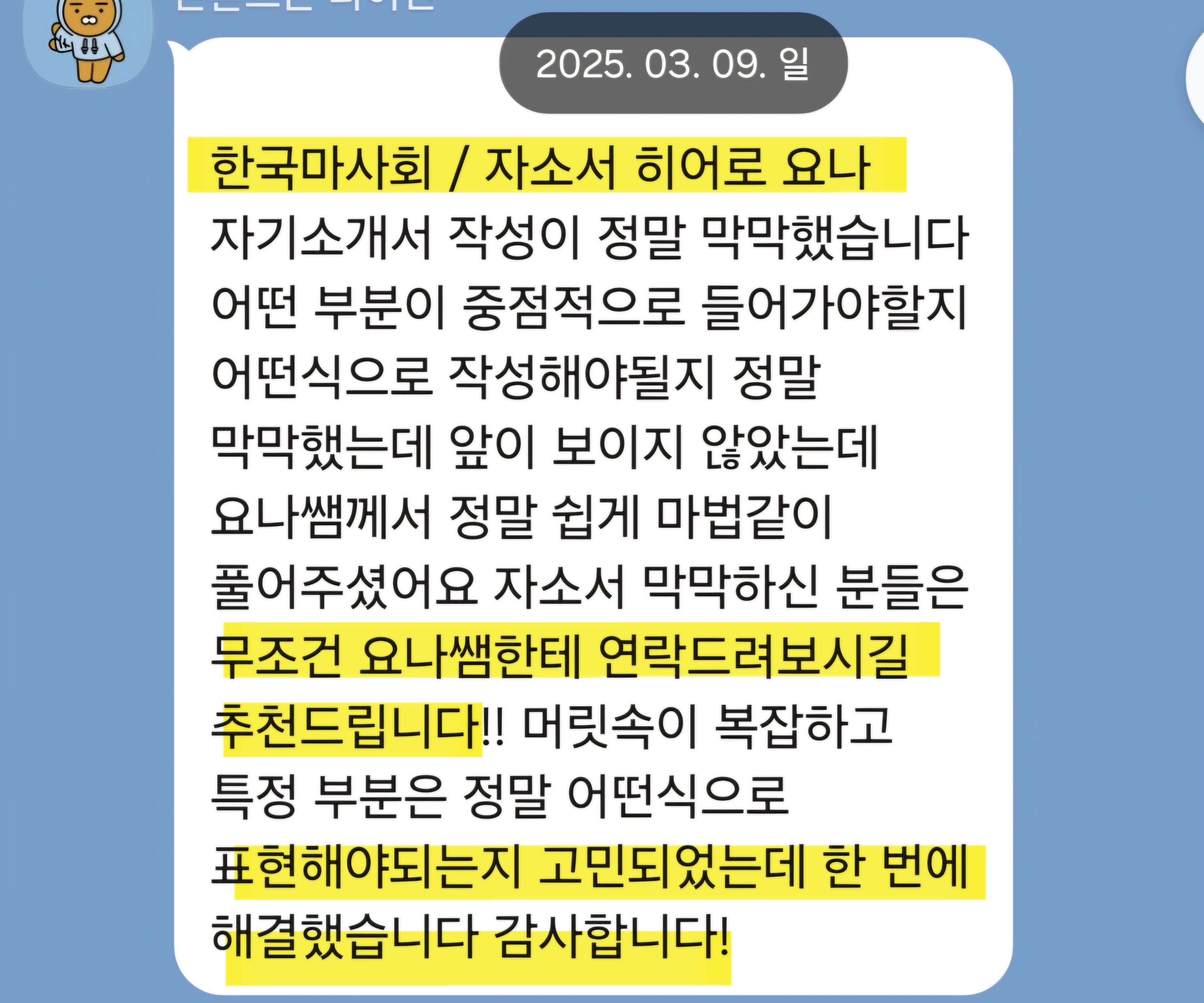 자소서히어로 요나는 공기업, 대기업 자소서 첨삭 및 자소서 대필을 전문으로 하고 있습니다. 블로그 후기 2,200건, 크몽 첨삭 후기 2,000건 이상의 신뢰도 높은 서비스로 단기간 내 합격 가능성을 높여 드립니다.