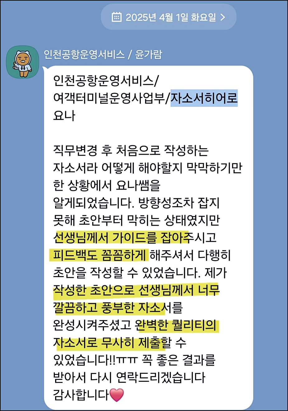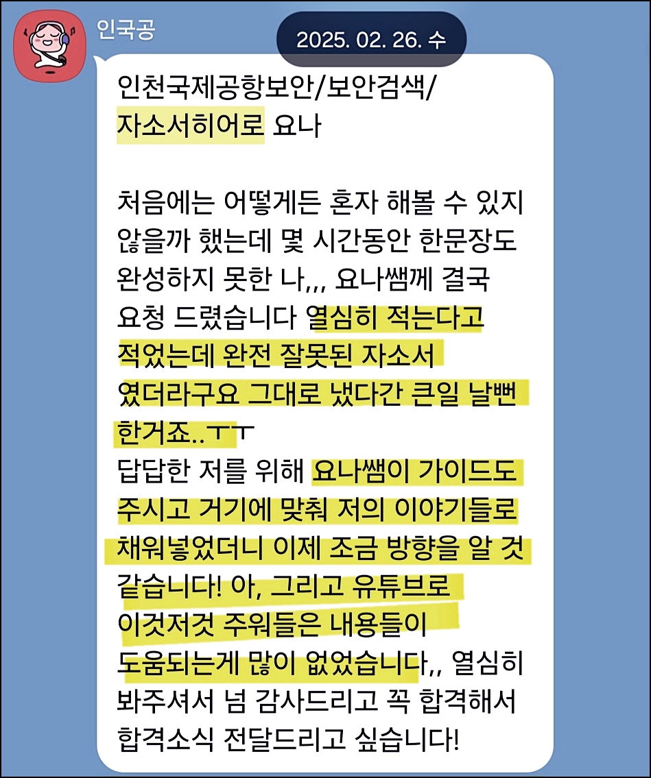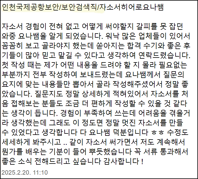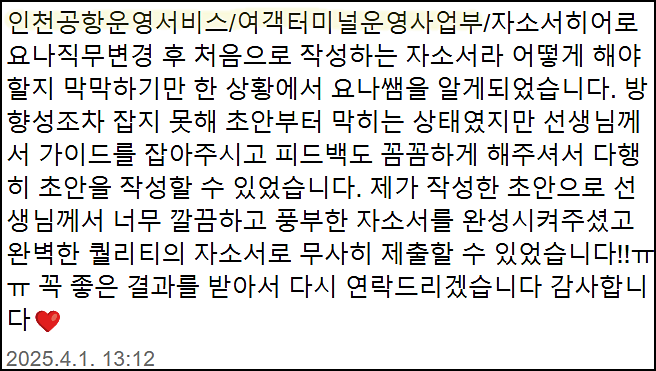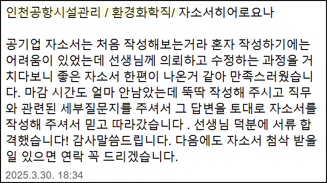 맞춤형 자기소개서 첨삭으로 서류 합격을 보장합니다. 만족도 5.0, 당일 완성 가능!