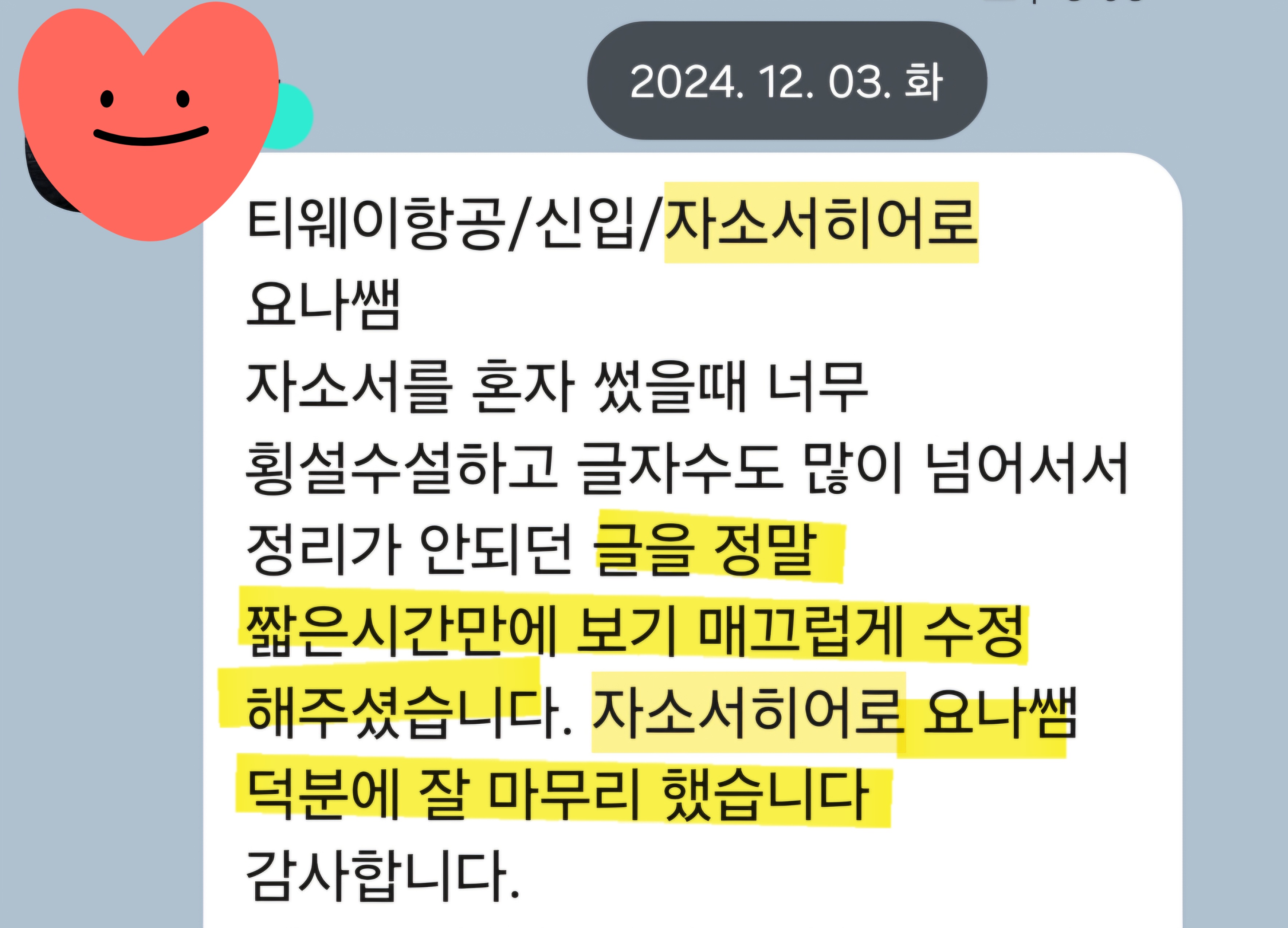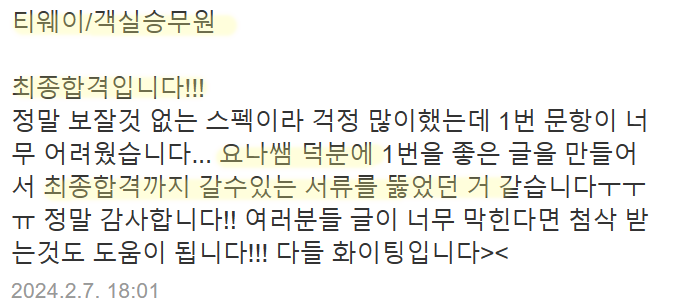 만약 문항 의도 해석이나 적절한 소재 선정이 어려우시다면, 전문가의 1:1 피드백을 통해 시간을 절약하고 완성도를 높일 수 있습니다. 저희는 티웨이항공 지원자 대상의 맞춤 첨삭 경험이 풍부하며, 제출 직전 최종 점검까지 도와드립니다.
