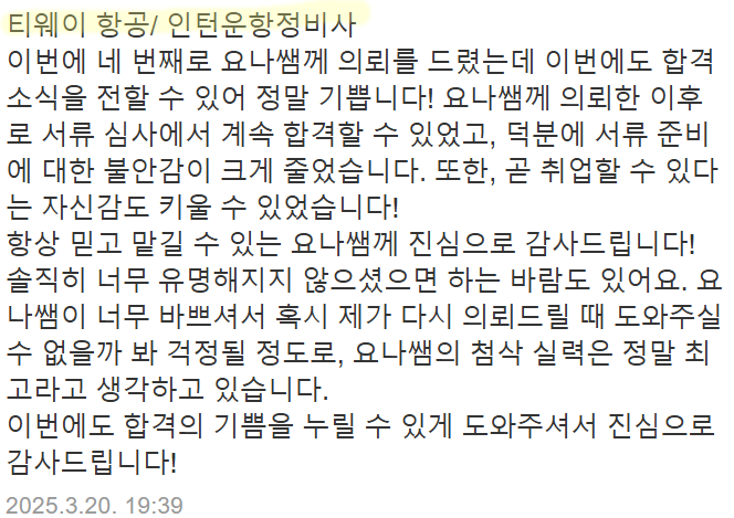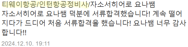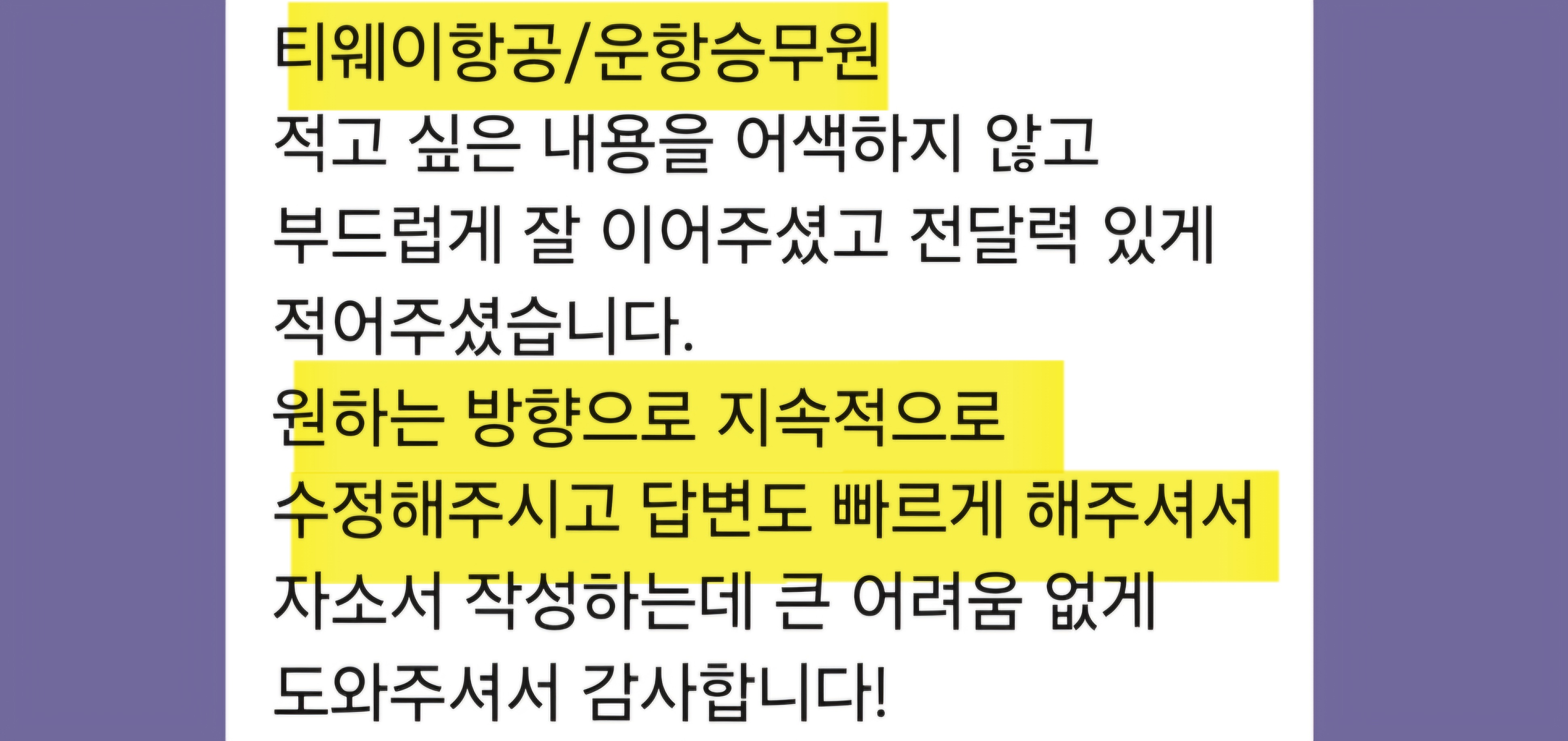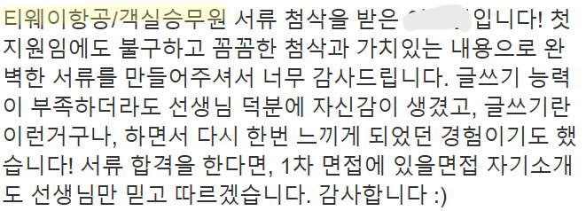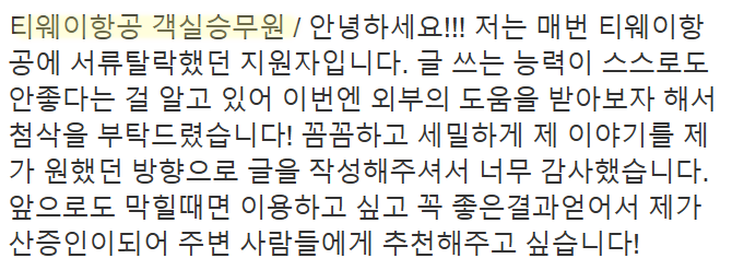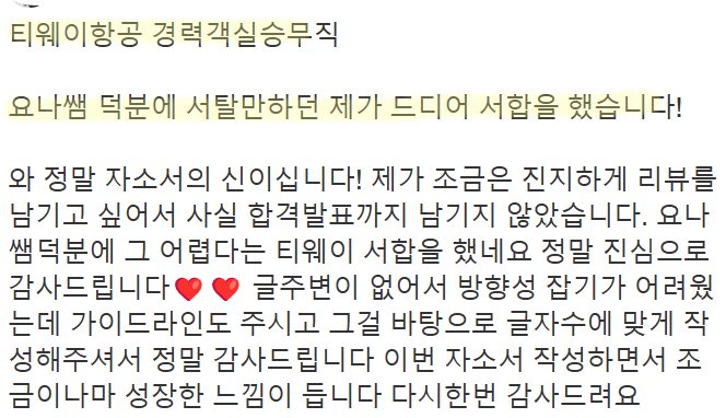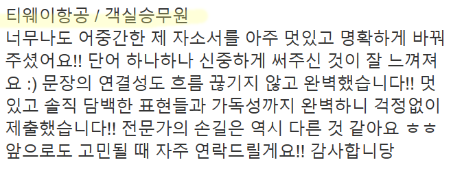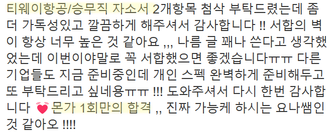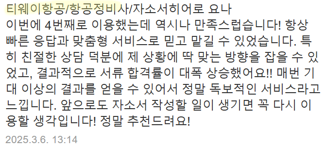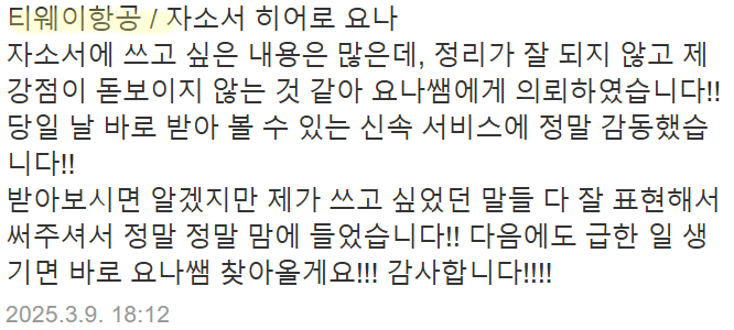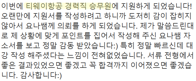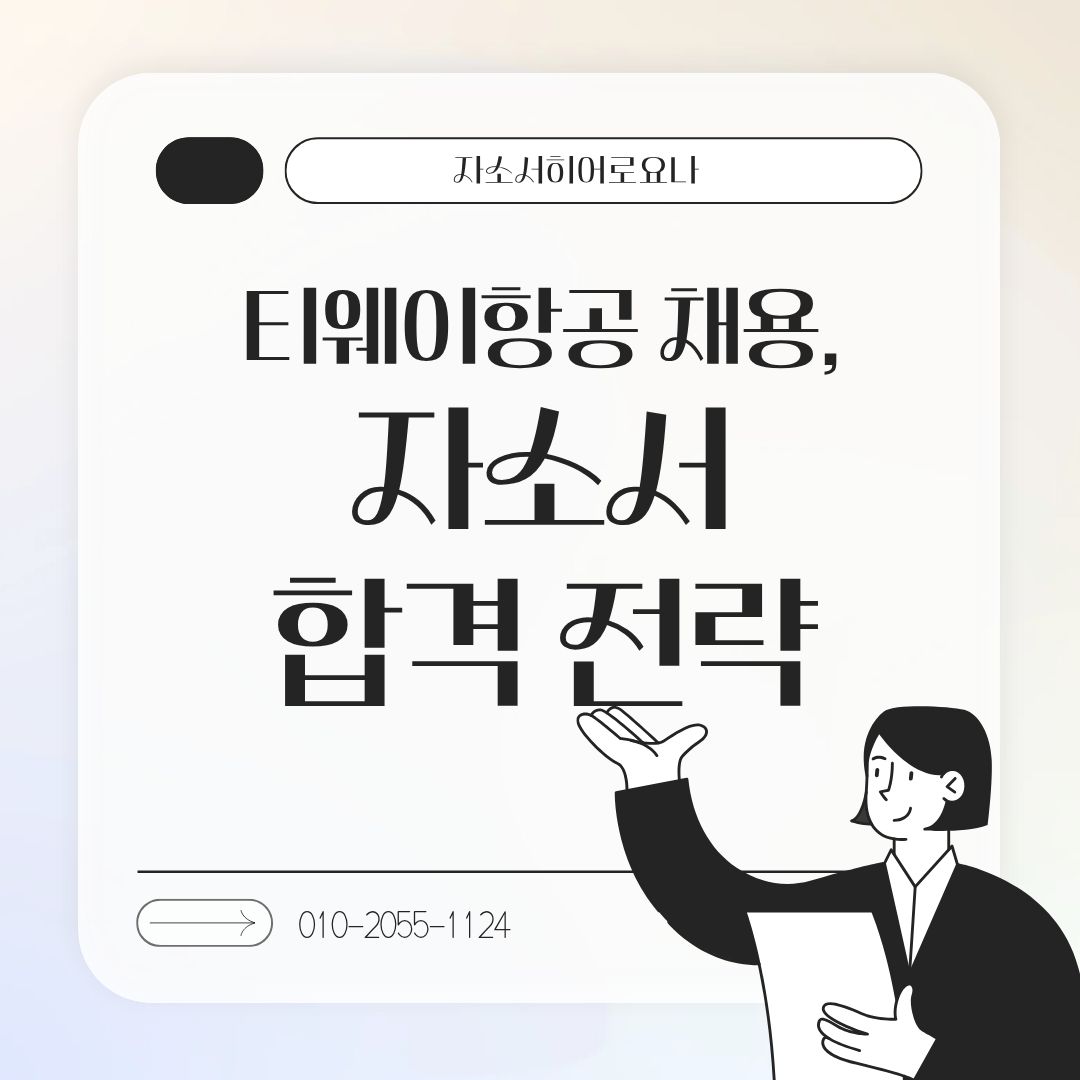 만약 문항 의도 해석이나 적절한 소재 선정이 어려우시다면, 전문가의 1:1 피드백을 통해 시간을 절약하고 완성도를 높일 수 있습니다. 저희는 티웨이항공 지원자 대상의 맞춤 첨삭 경험이 풍부하며, 제출 직전 최종 점검까지 도와드립니다.