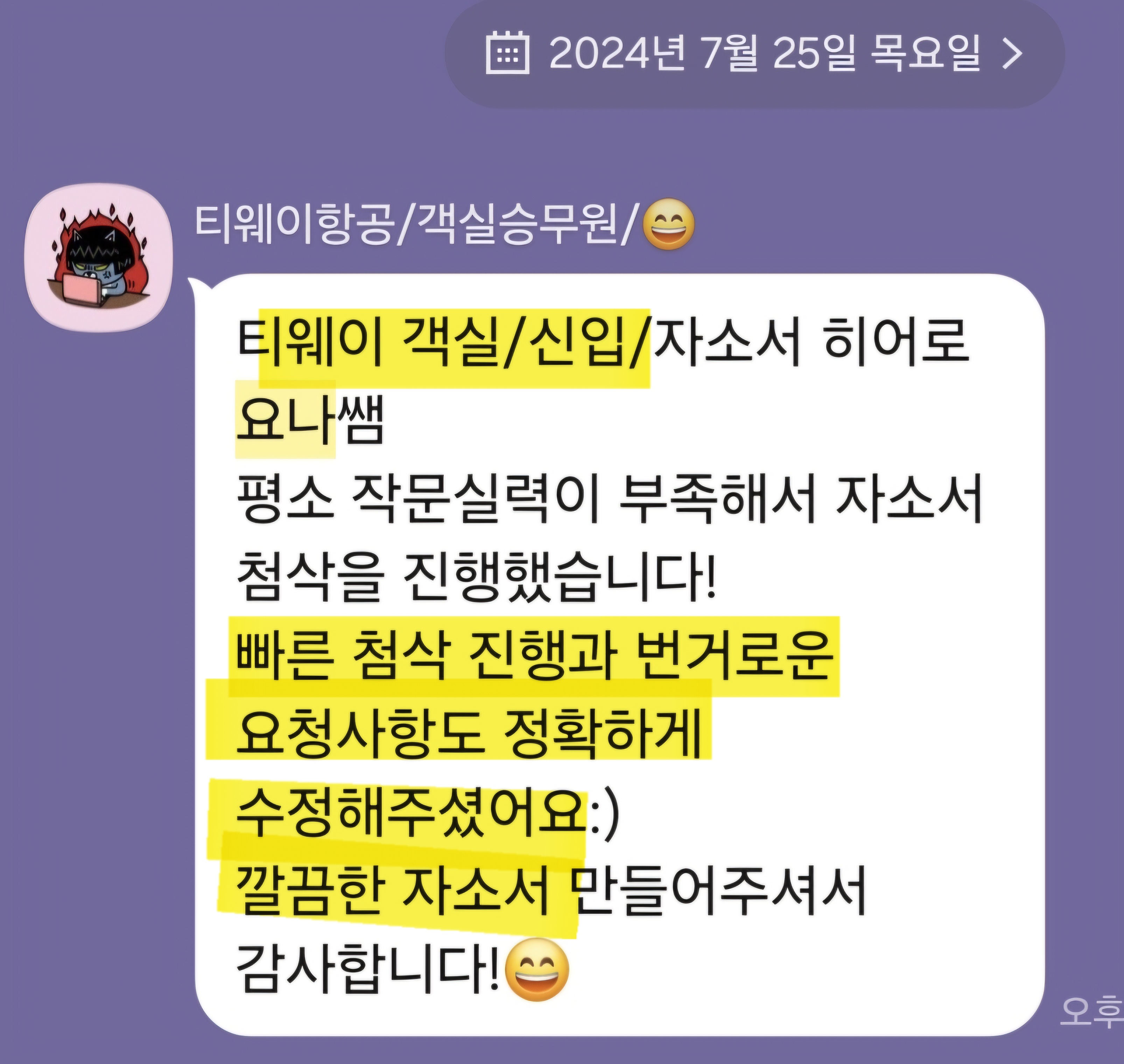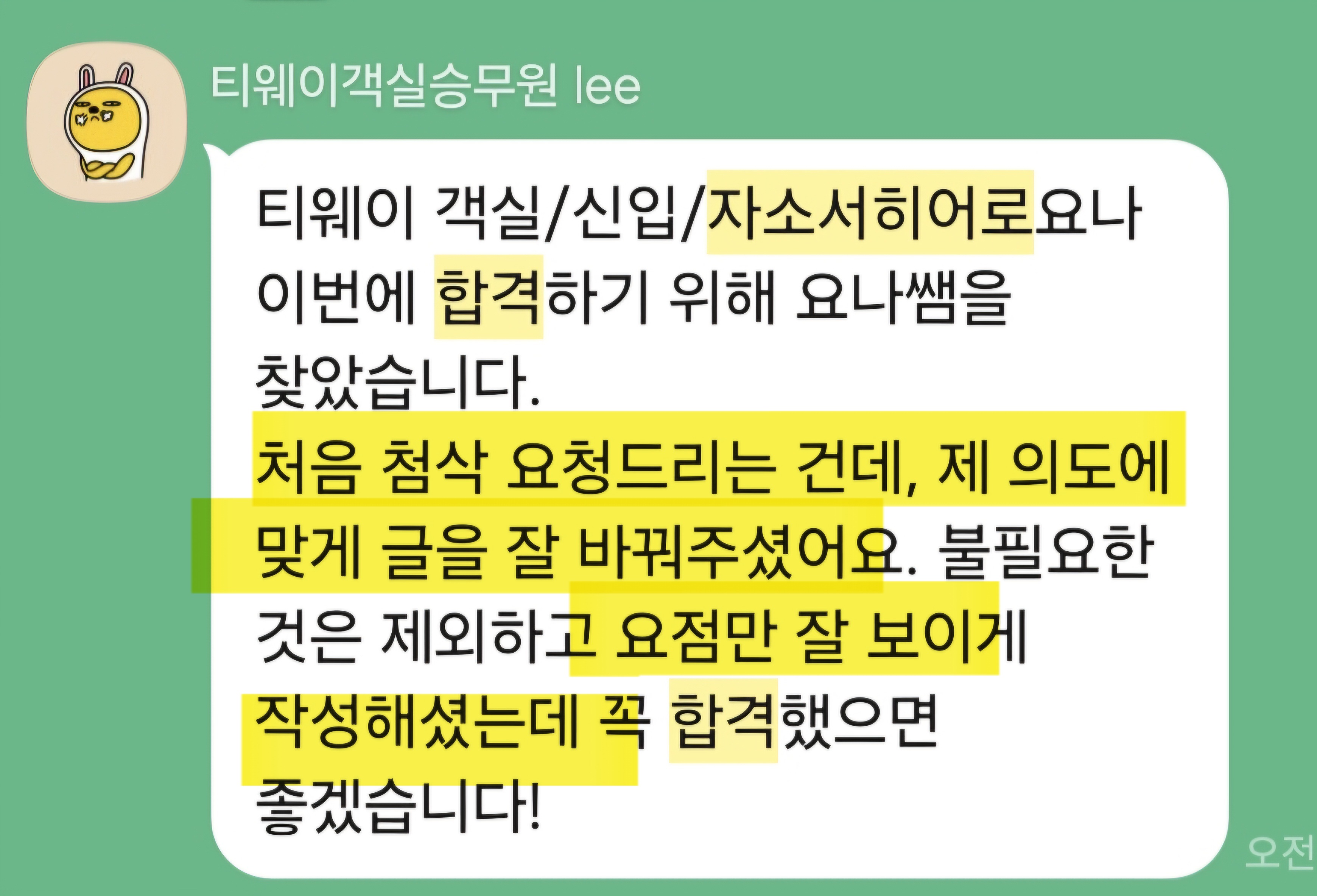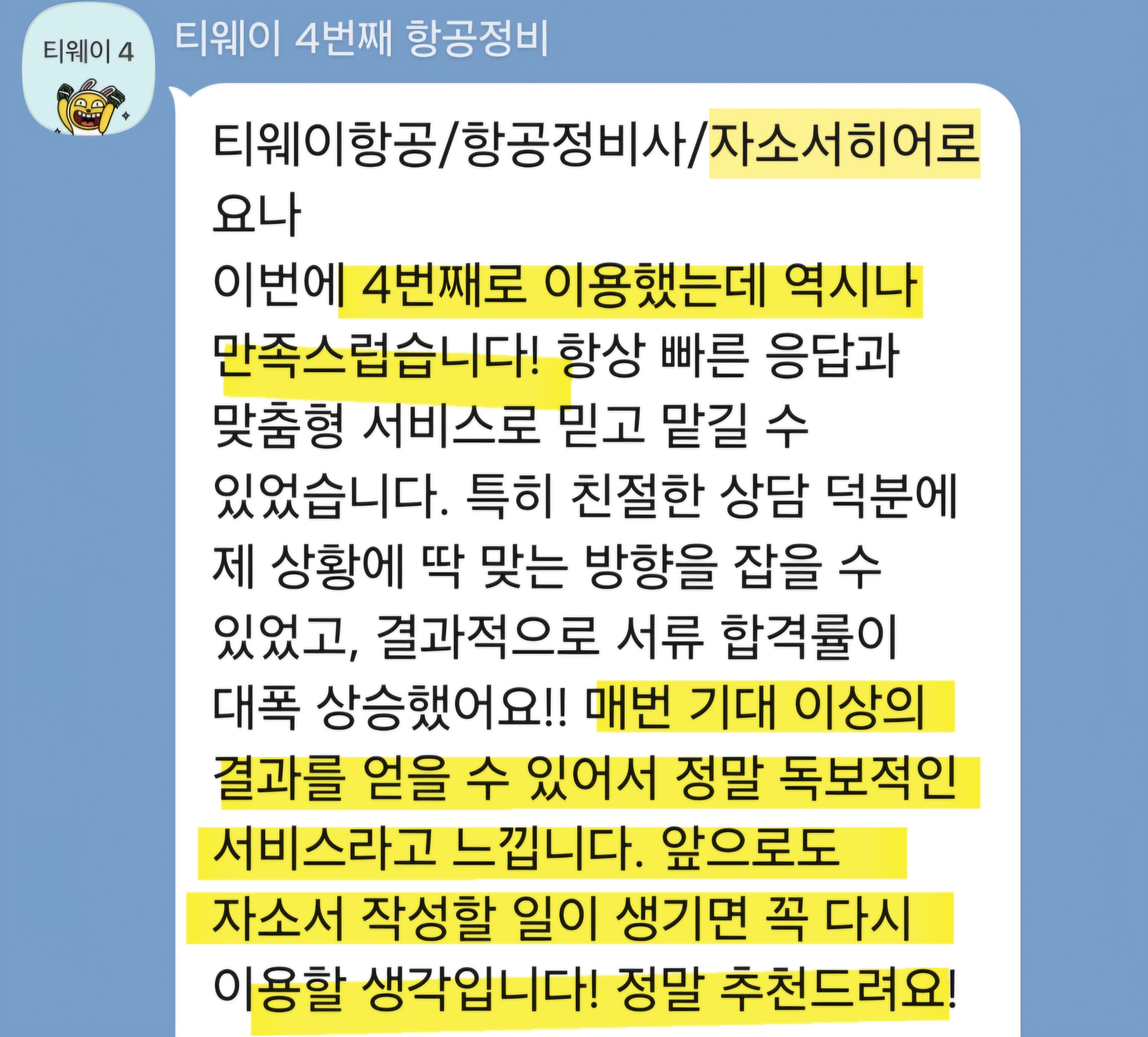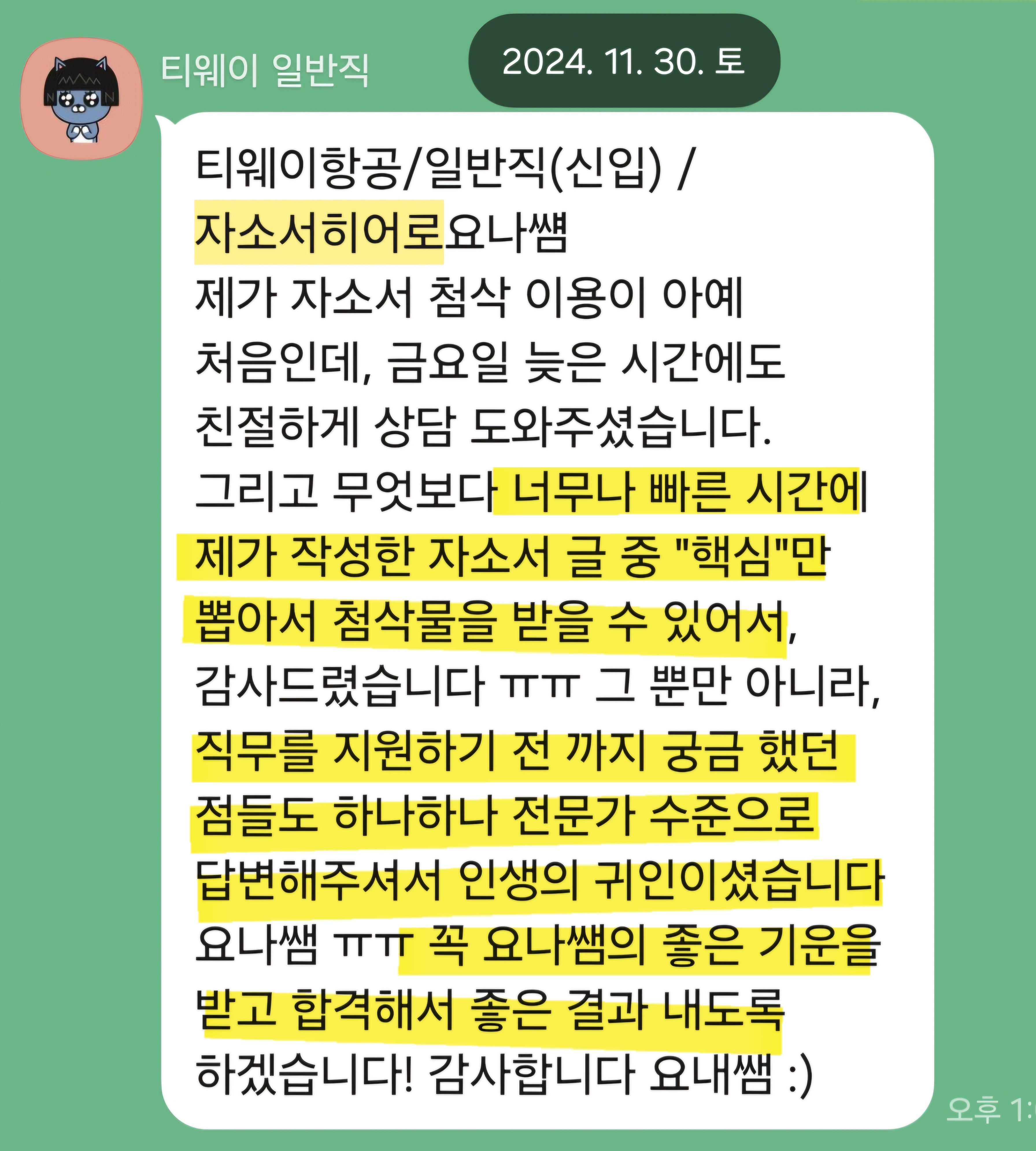 만약 문항 의도 해석이나 적절한 소재 선정이 어려우시다면, 전문가의 1:1 피드백을 통해 시간을 절약하고 완성도를 높일 수 있습니다. 저희는 티웨이항공 지원자 대상의 맞춤 첨삭 경험이 풍부하며, 제출 직전 최종 점검까지 도와드립니다.