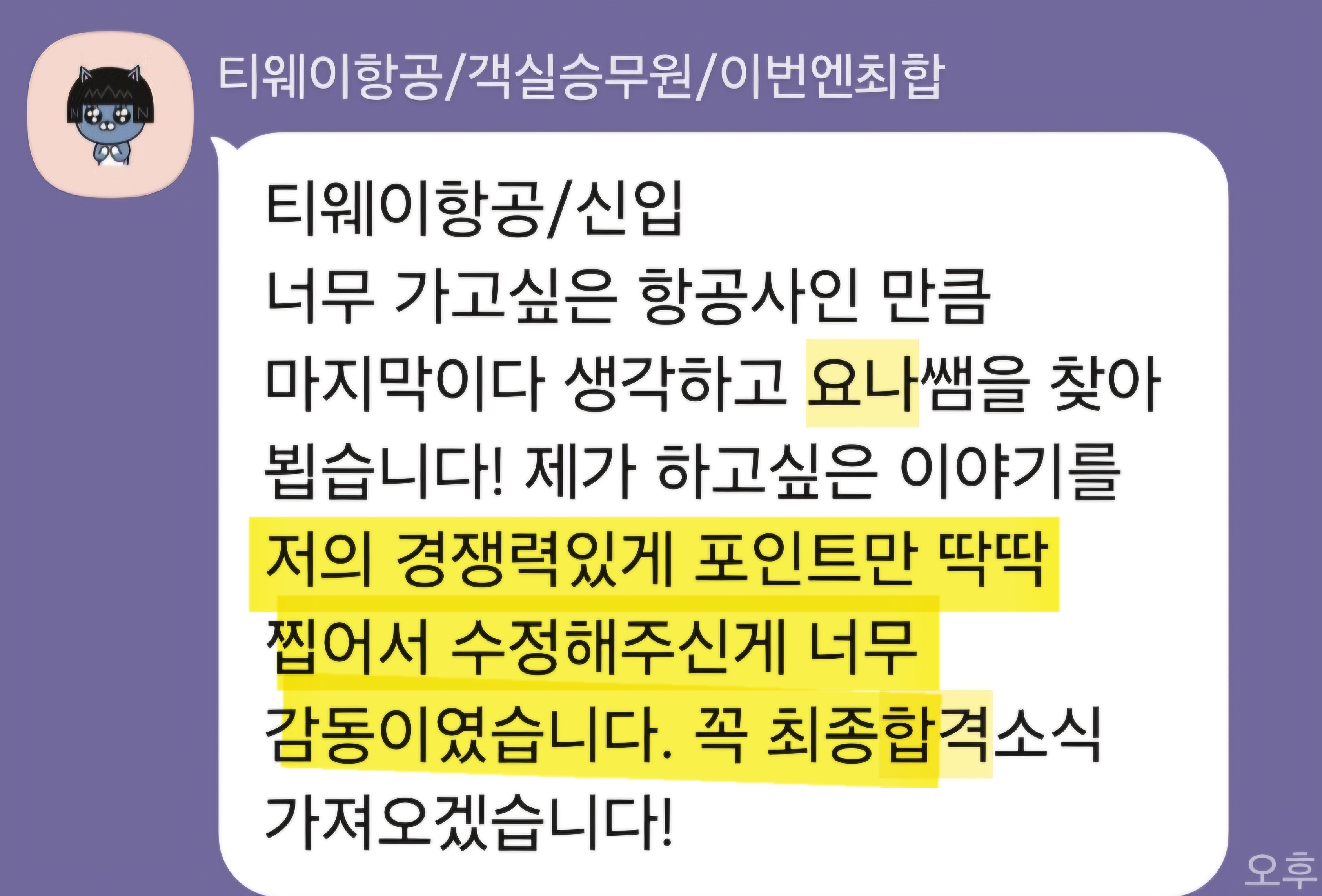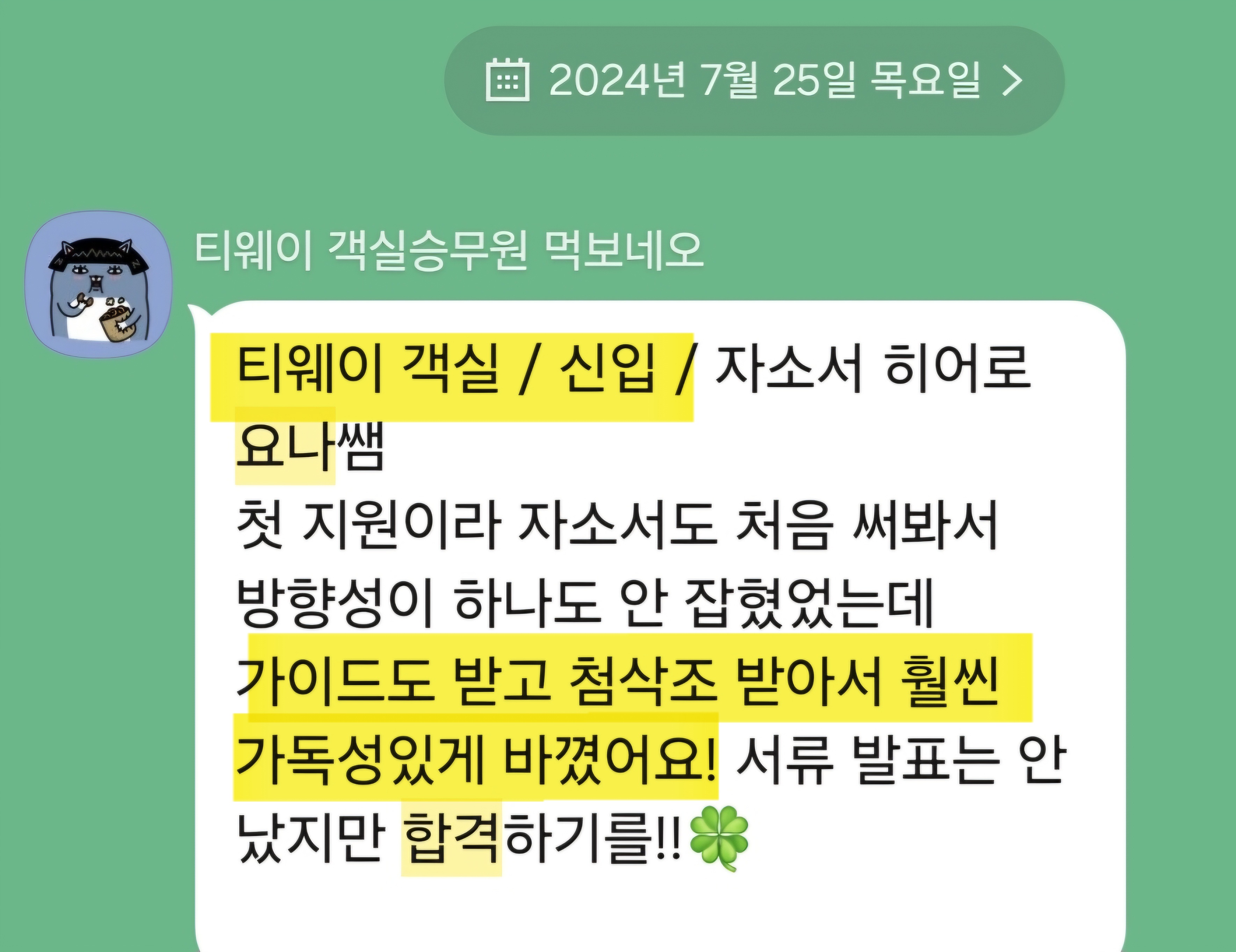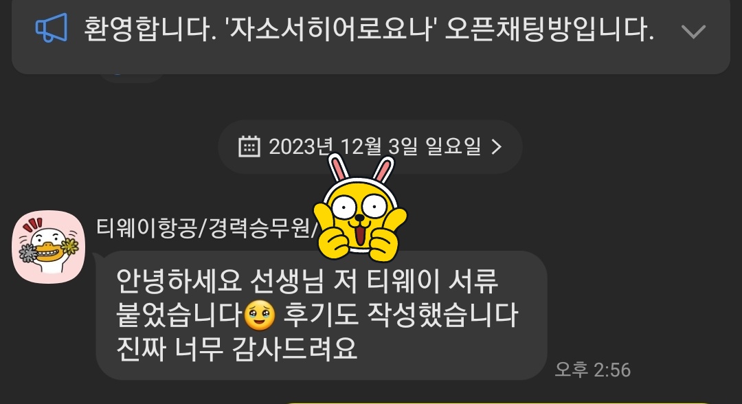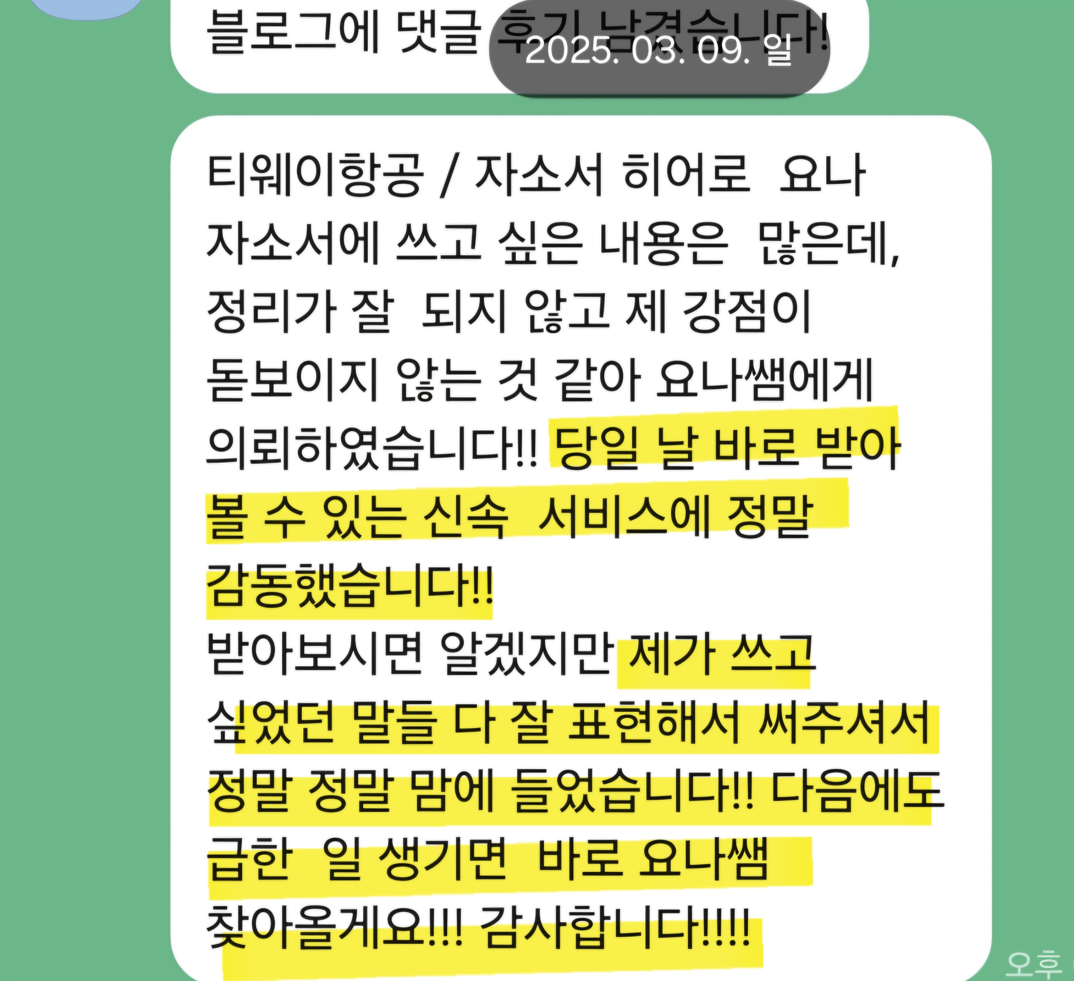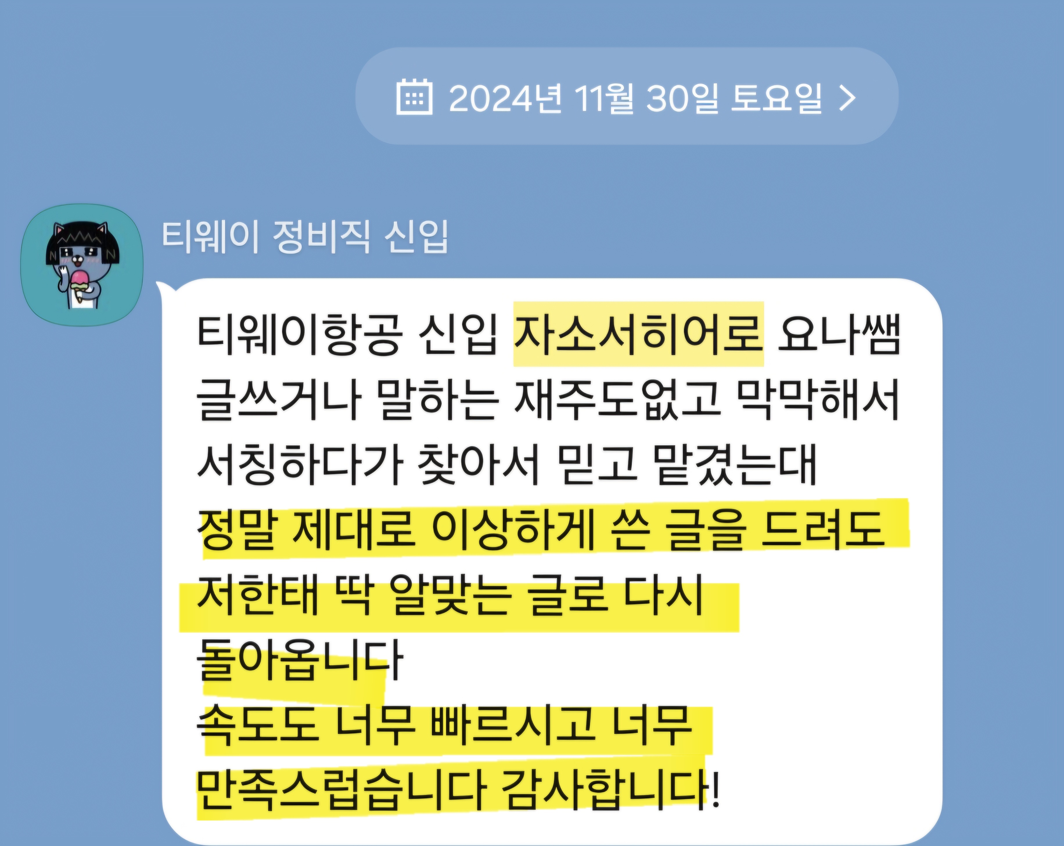 만약 문항 의도 해석이나 적절한 소재 선정이 어려우시다면, 전문가의 1:1 피드백을 통해 시간을 절약하고 완성도를 높일 수 있습니다. 저희는 티웨이항공 지원자 대상의 맞춤 첨삭 경험이 풍부하며, 제출 직전 최종 점검까지 도와드립니다.