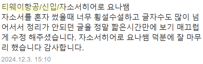 맞춤형 자기소개서 첨삭으로 서류 합격을 보장합니다. 만족도 5.0, 당일 완성 가능!