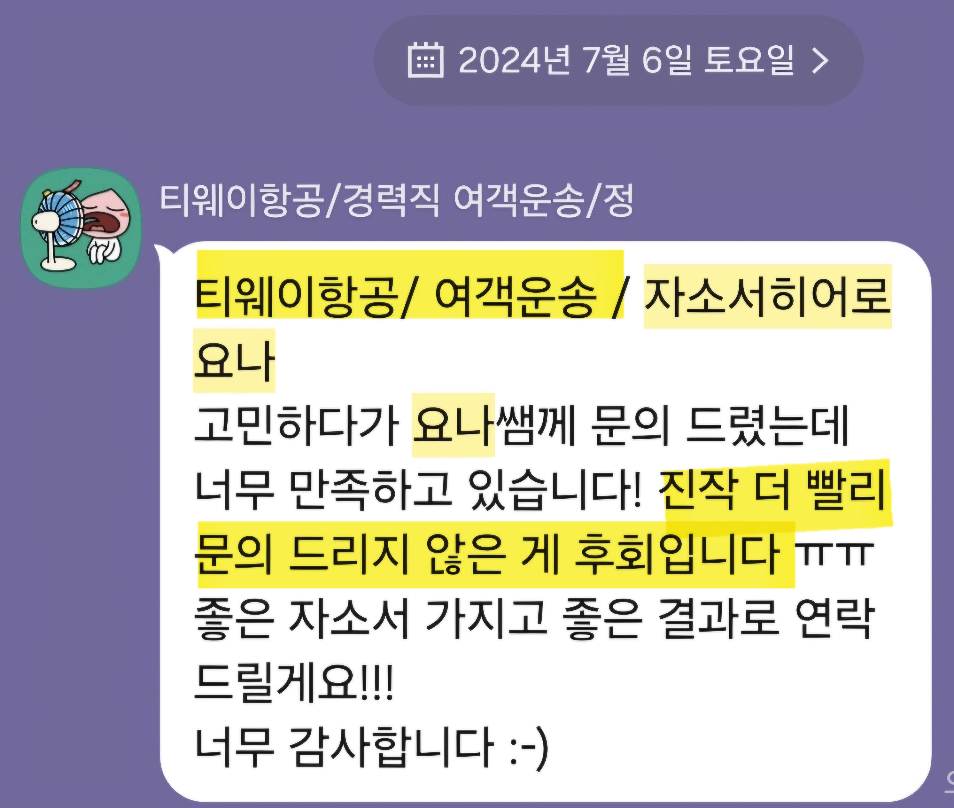 3) 최신 기업 이슈/서비스 방향을 반영하세요 — 티웨이의 최근 메시지나 캠페인, 항공업계 트렌드와 연결하면 설득력이 커집니다.