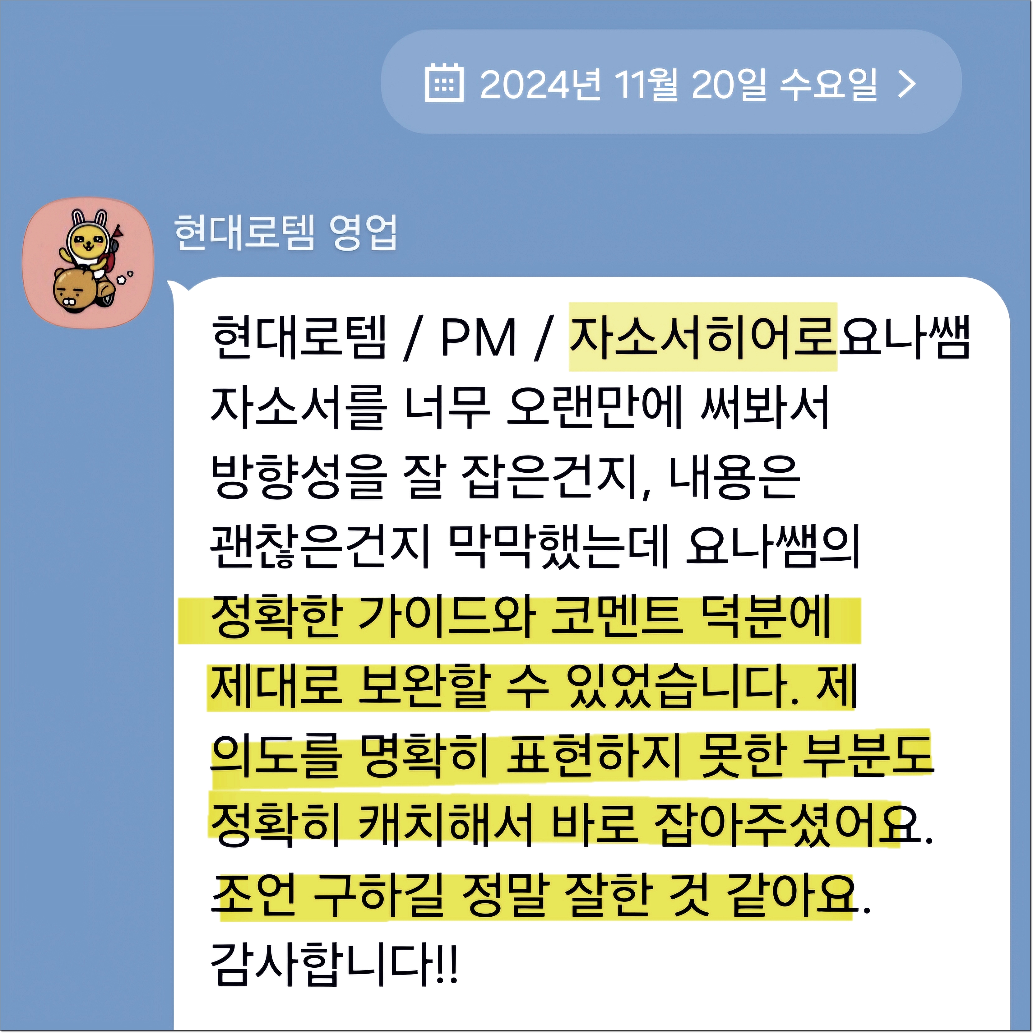 안녕하세요. 취업 전문 컨설턴트 자소서히어로 요나입니다. 10년간 3만 건 이상의 서류 첨삭을 진행하며 95% 이상의 서류 합격률을 기록해 왔습니다.