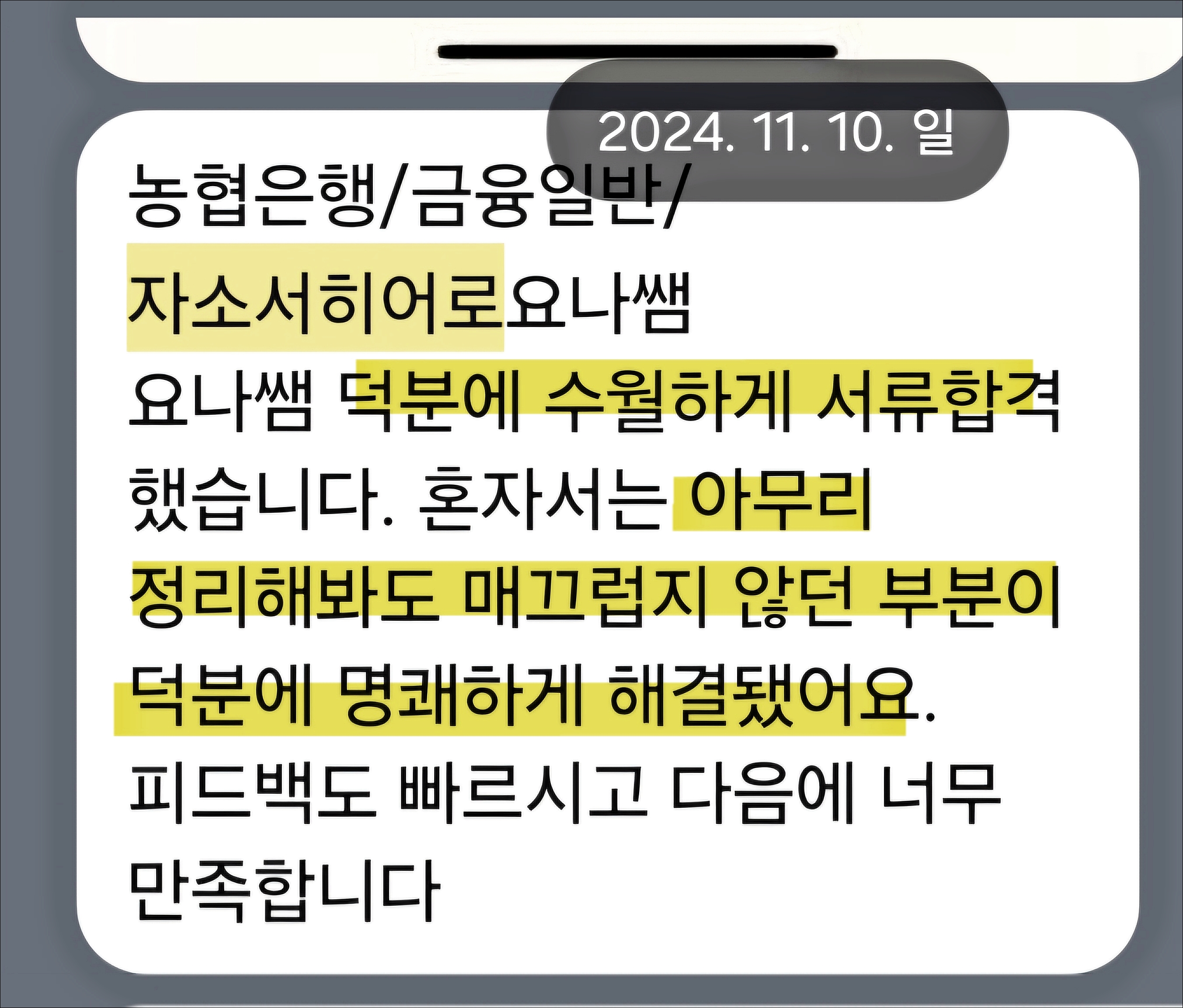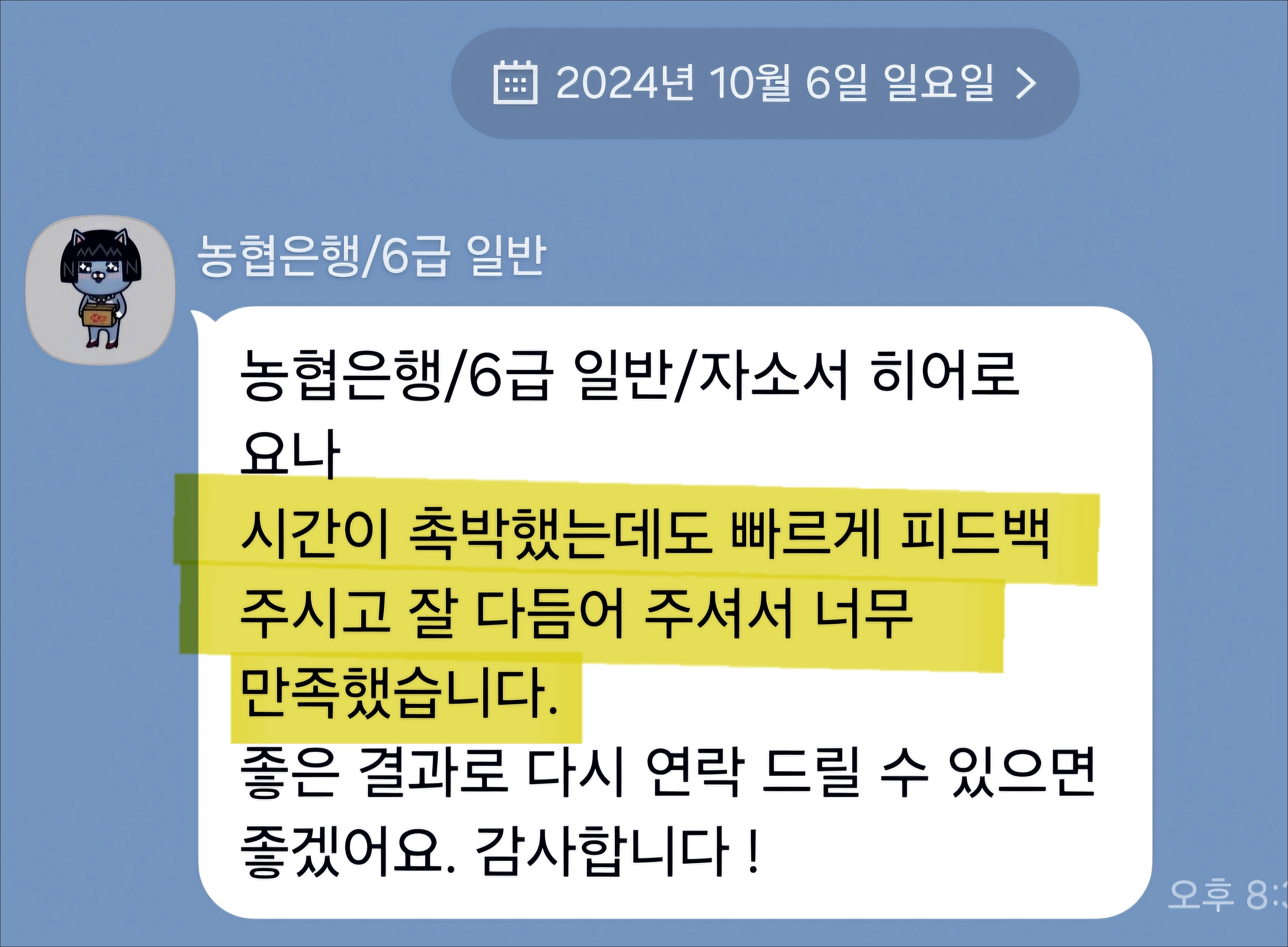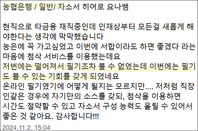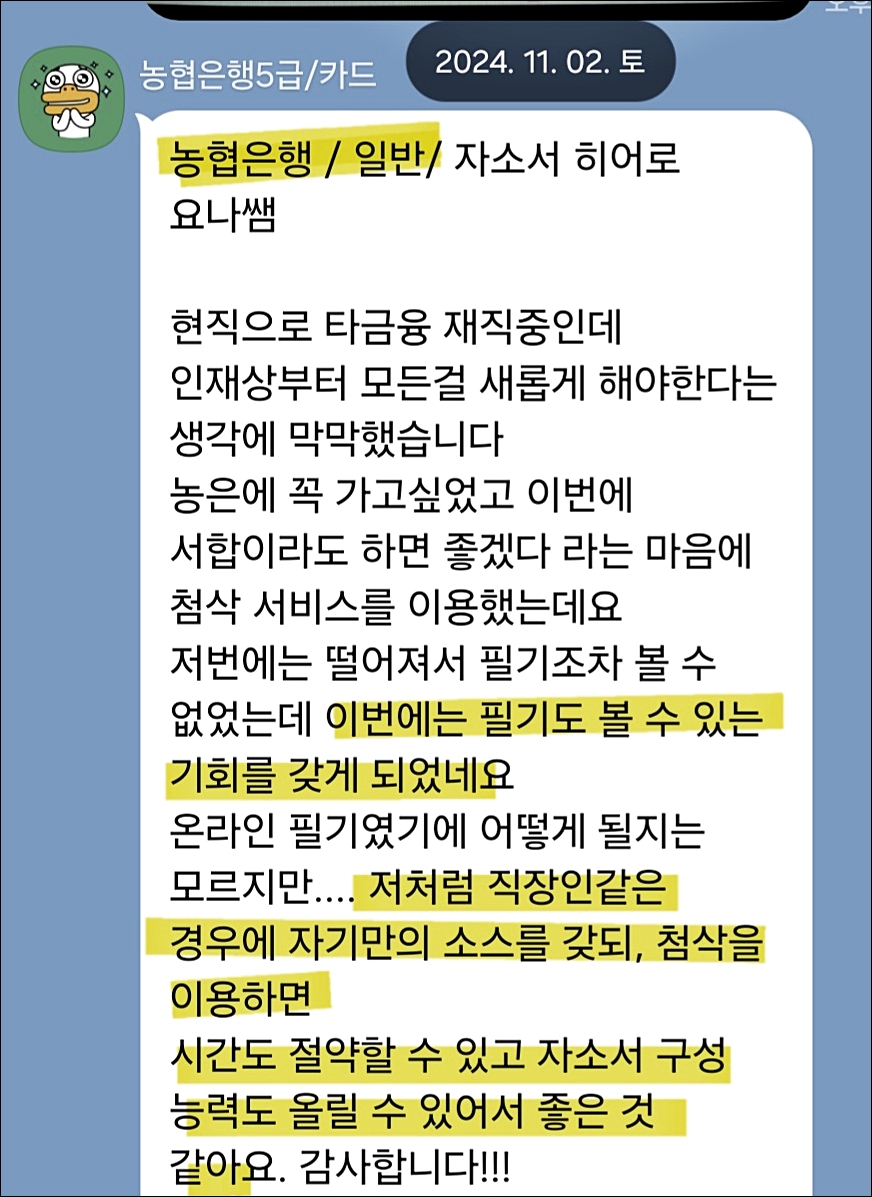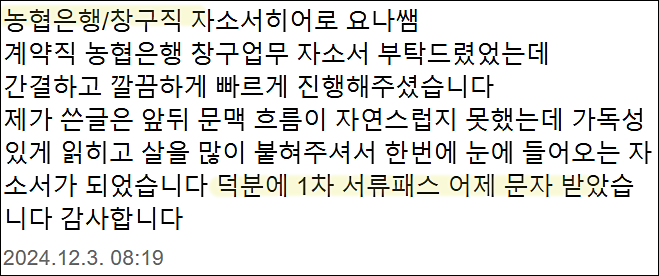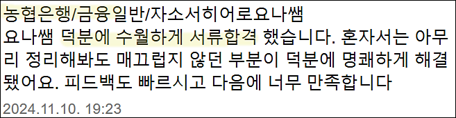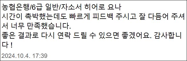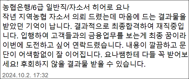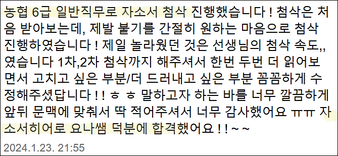 24시간 내 NH농협은행 6급 합격을 위한 맞춤 자기소개서 첨삭 대행 서비스를 제공해 드립니다.