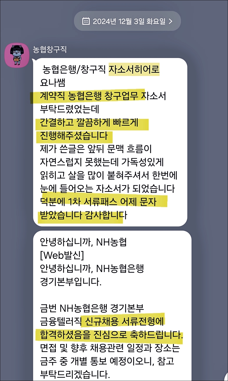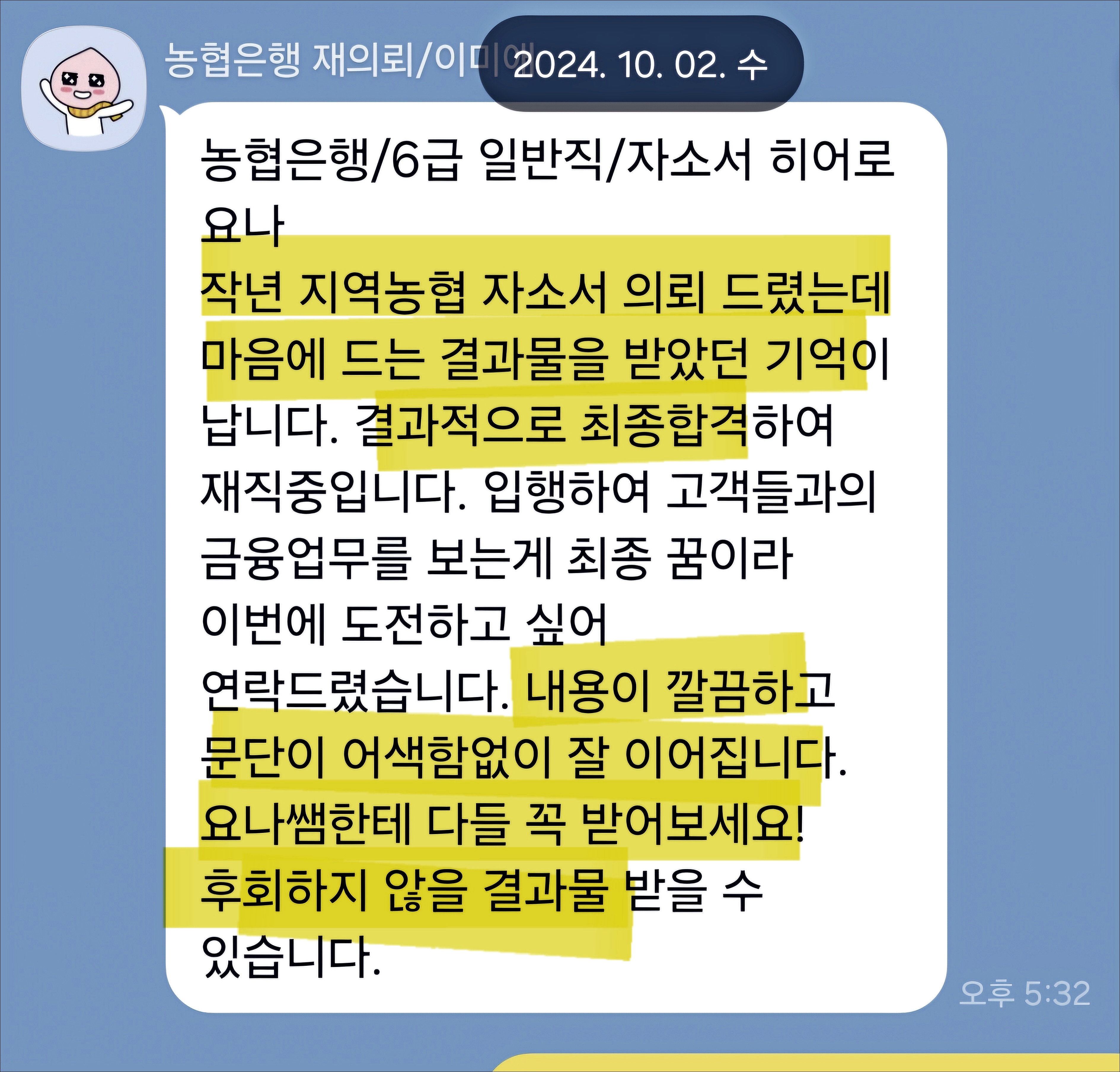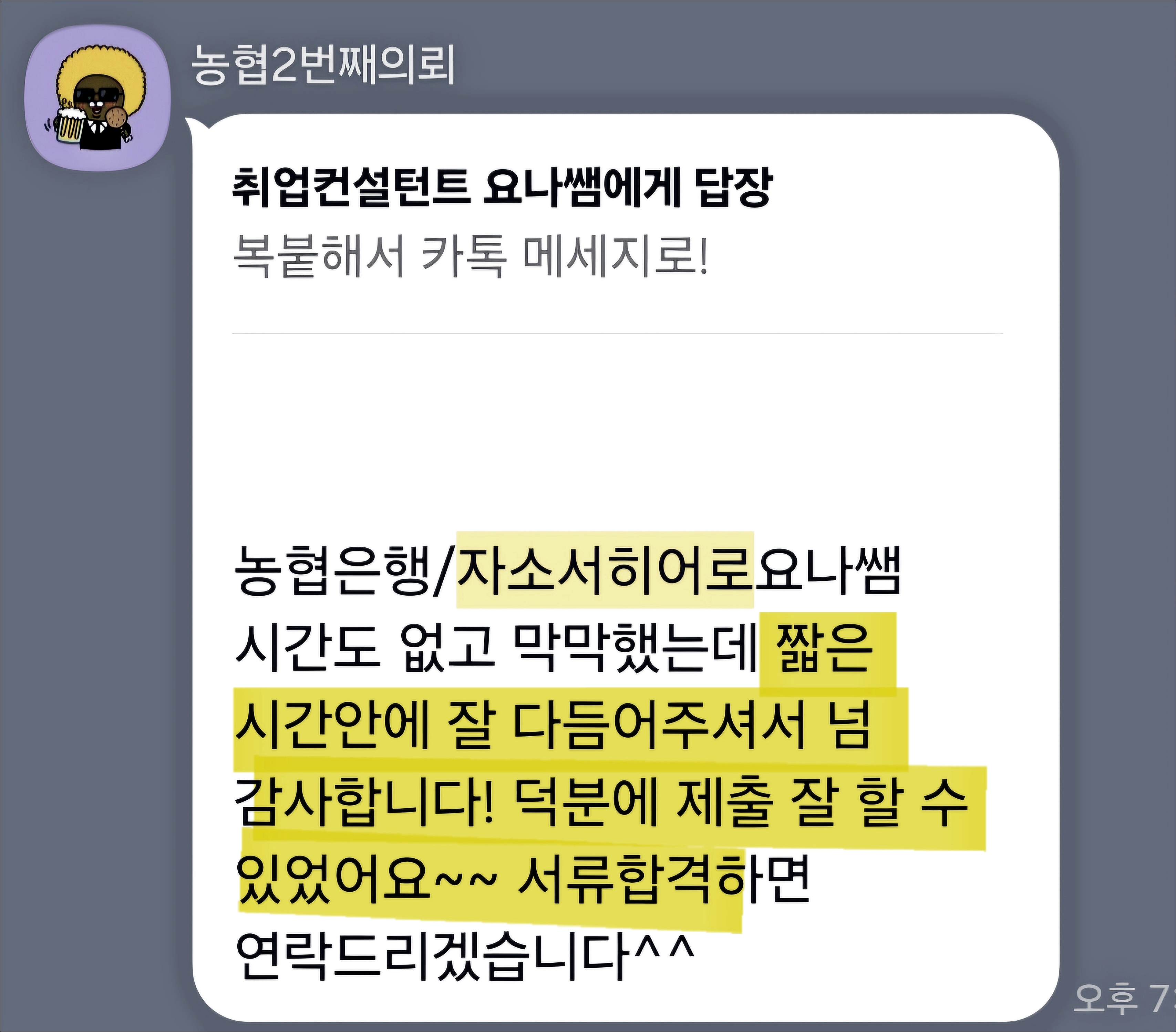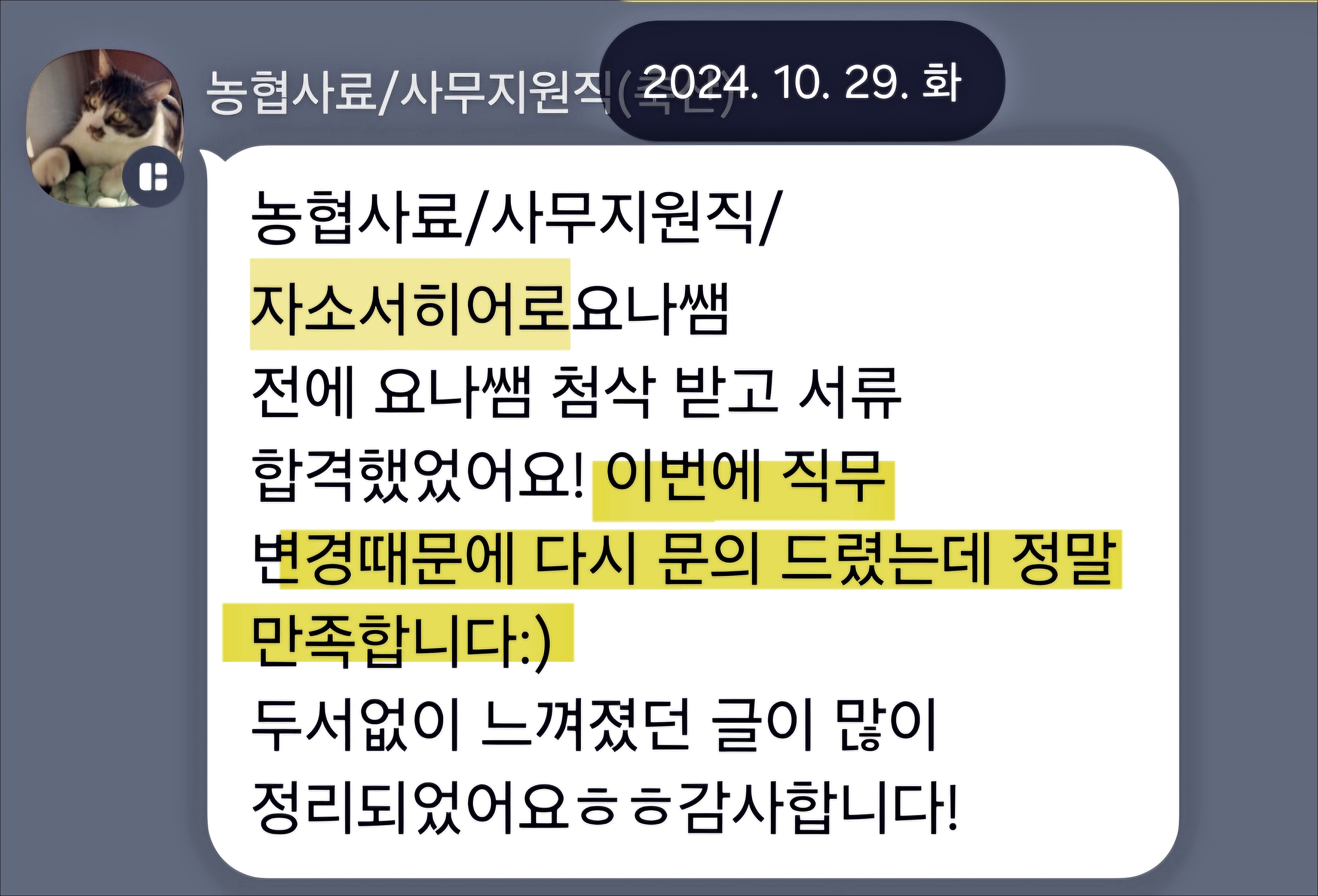 NH농협은행 6급 자기소개서 작성에 고민이 있으신 분들은 아래 채널로 문의해 주세요. 24시간 내 맞춤 첨삭 대행 서비스를 제공하며, 지원자의 핵심 소재를 반영한 고퀄리티 자기소개서를 제작해 드립니다.