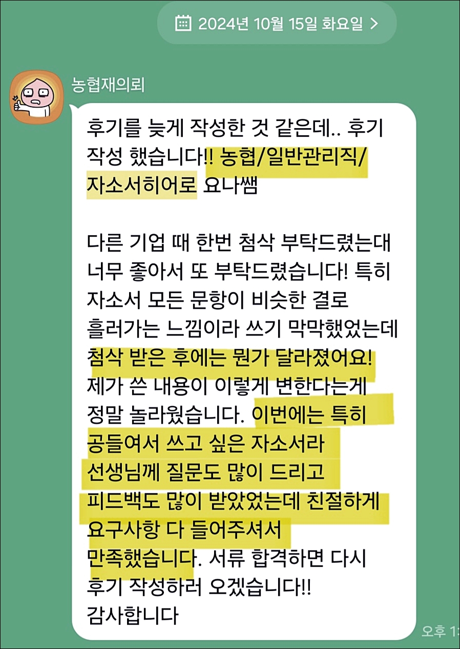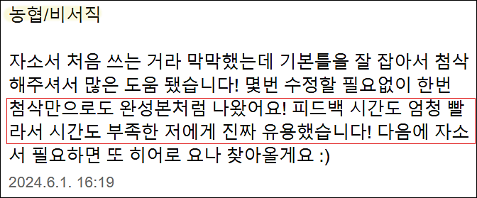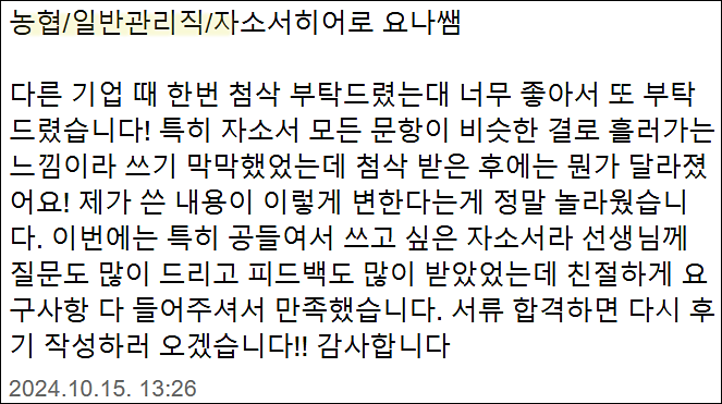 맞춤형 자기소개서 첨삭으로 서류 합격을 보장합니다. 만족도 5.0, 당일 완성 가능!
