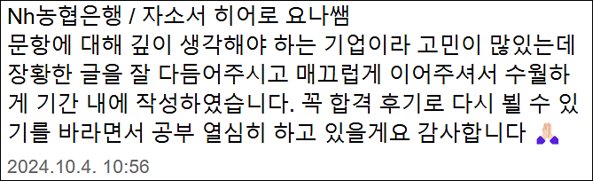 NH농협은행 6급 자기소개서 작성에 고민이 있으신 분들은 아래 채널로 문의해 주세요. 24시간 내 맞춤 첨삭 대행 서비스를 제공하며, 지원자의 핵심 소재를 반영한 고퀄리티 자기소개서를 제작해 드립니다.