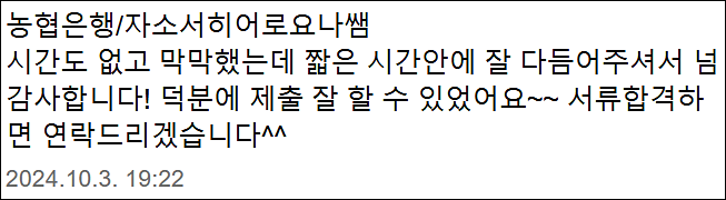 24시간 내 NH농협은행 6급 합격을 위한 맞춤 자기소개서 첨삭 대행 서비스를 제공해 드립니다.