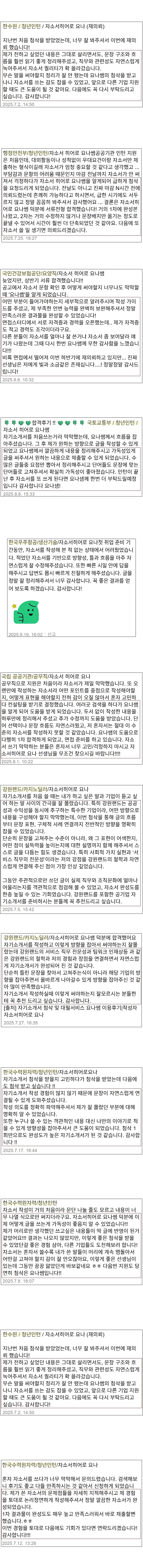 안녕하세요. 자소서히어로 요나입니다. 지난 10년간 다양한 기업의 서류 전형과 면접 컨설팅을 진행하며, 수많은 지원자들의 합격을 도와드렸습니다. 특히 공기업, 대기업, 금융권, 병원, 항공사 등 직무별로 다른 채용 전략을 분석하고, 그에 맞는 맞춤형 자기소개서 첨삭 및 대필 서비스를 제공하고 있습니다.