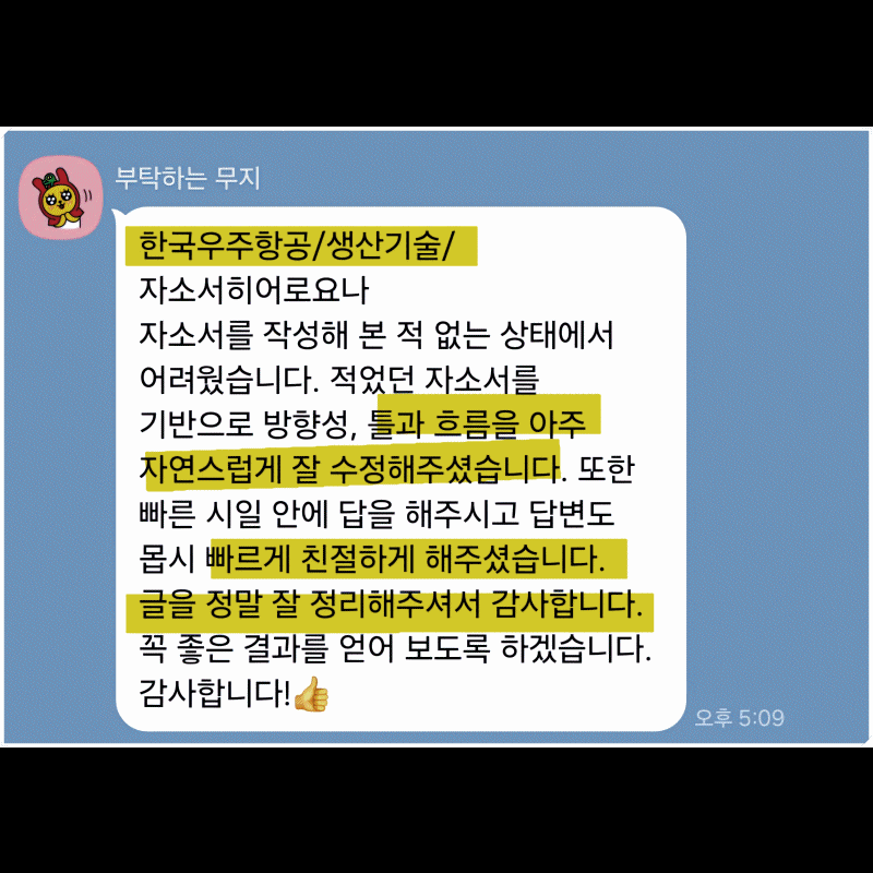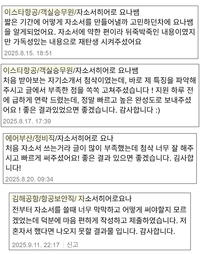맞춤형 자기소개서 첨삭으로 서류 합격을 보장합니다. 만족도 5.0, 당일 완성 가능!