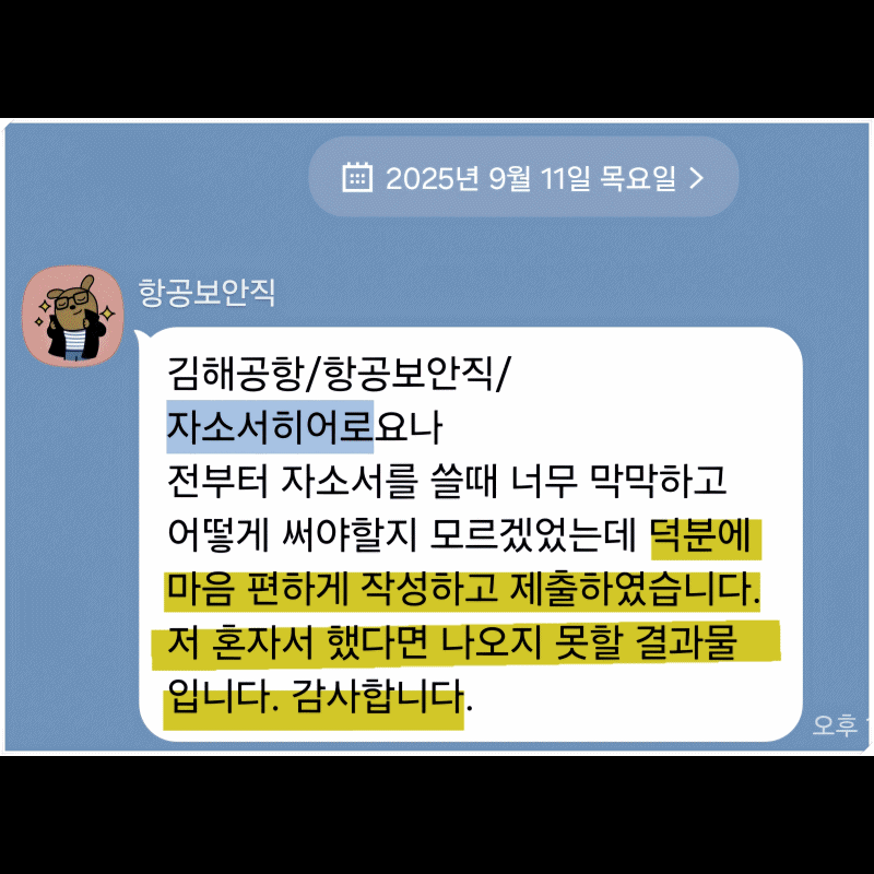 항공사는 서비스 마인드와 위기관리능력이 핵심 평가 요소입니다. 이에 따라, 고객 응대나 돌발상황 해결 사례를 중심으로 구성하였으며, AI 표절률 검사를 거쳐 오직 본인 경험 중심으로 완성했습니다. 결과적으로 2차 면접까지 진출한 사례가 다수 있었습니다.