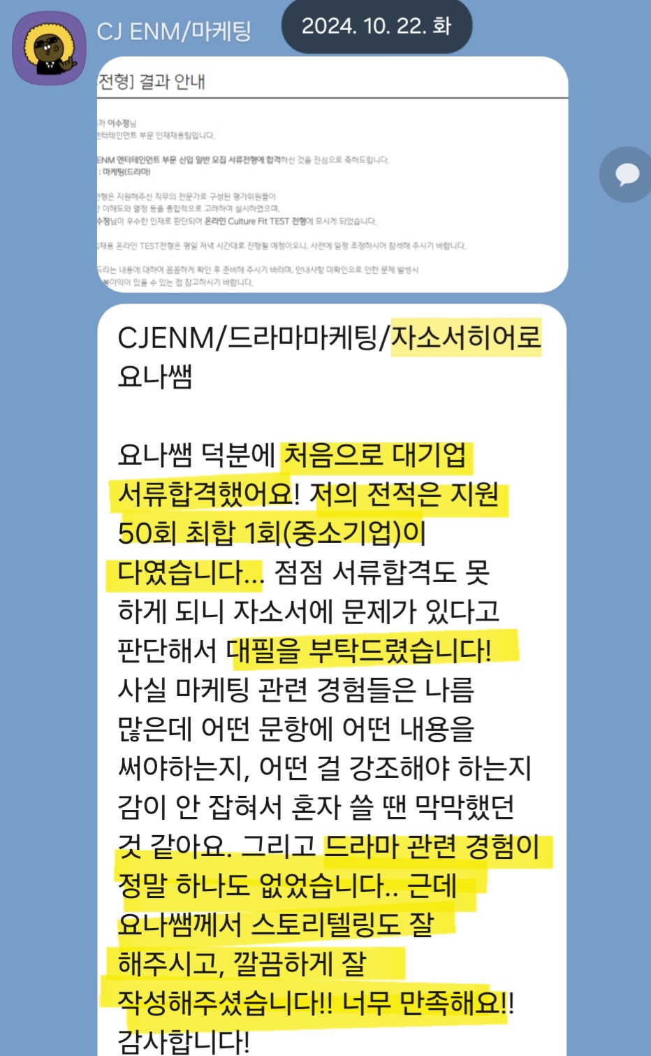 문의는 언제든지 가능하며, 빠른 피드백과 꼼꼼한 작업으로 서류 합격에 가장 가까운 자기소개서를 완성해드립니다.