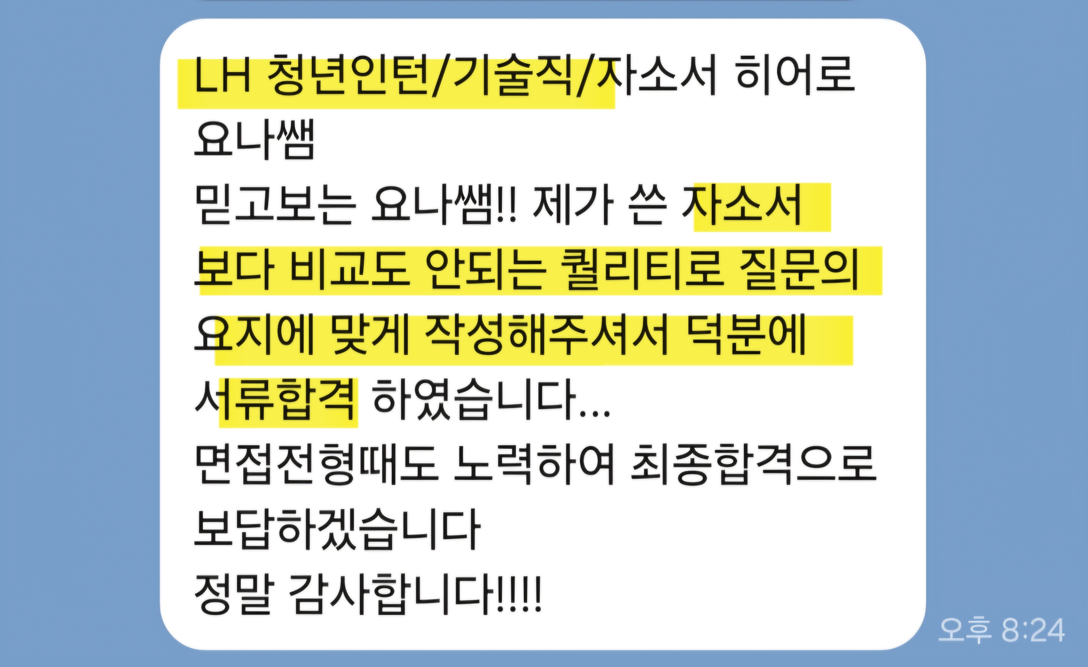 맞춤형 자기소개서 첨삭으로 서류 합격을 보장합니다. 만족도 5.0, 당일 완성 가능!