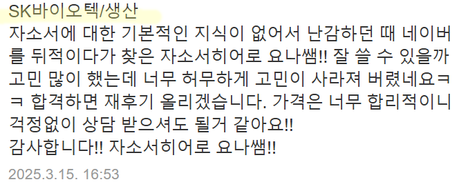 맞춤형 자기소개서 첨삭으로 서류 합격을 보장합니다. 만족도 5.0, 당일 완성 가능!