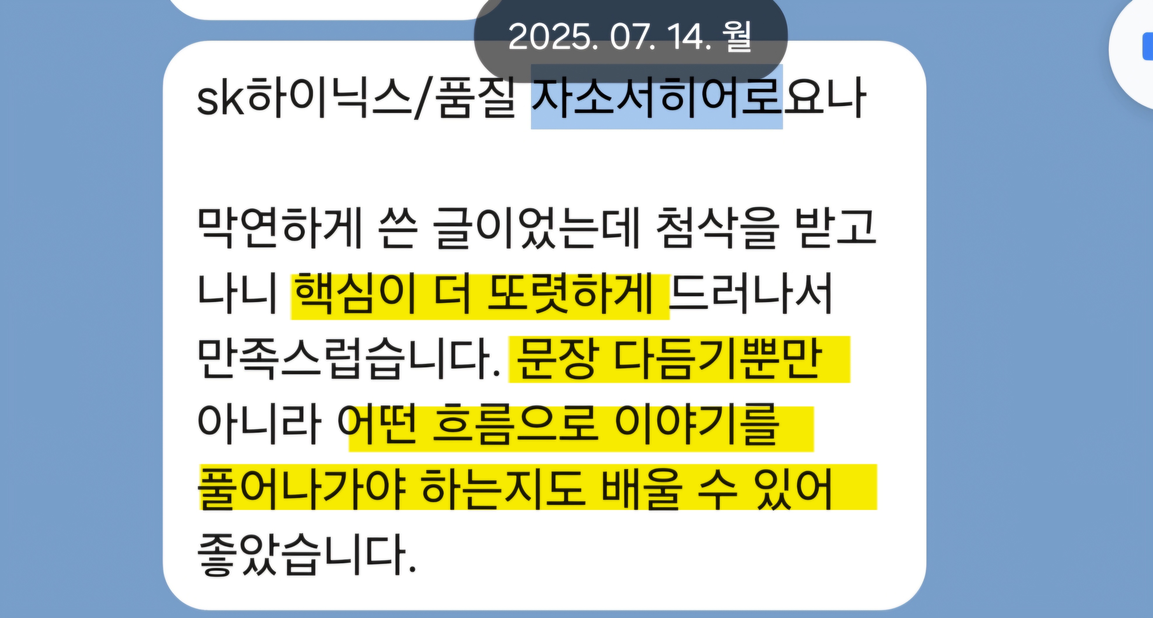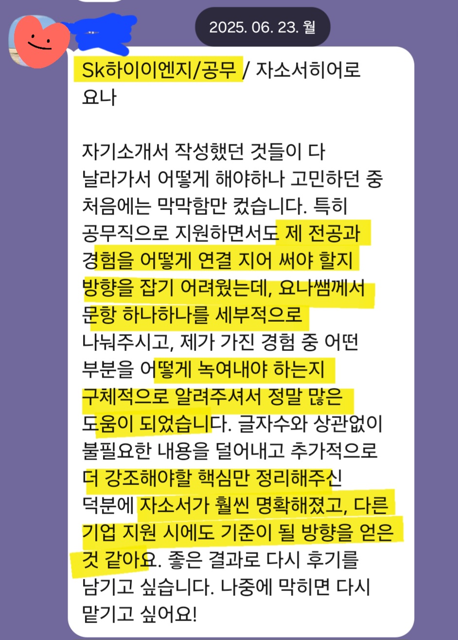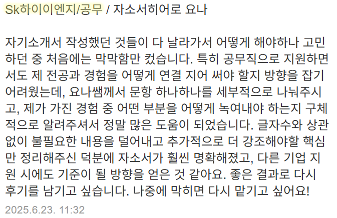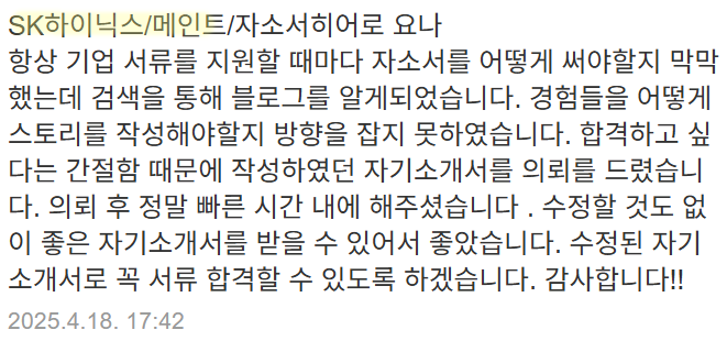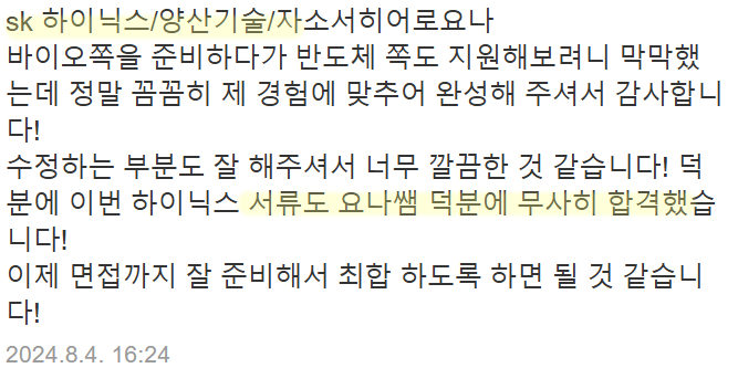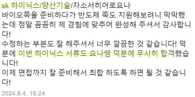 자소서히어로는 SK하이닉스 포함 반도체 분야 첨삭 및 대필 경력이 풍부하며,
