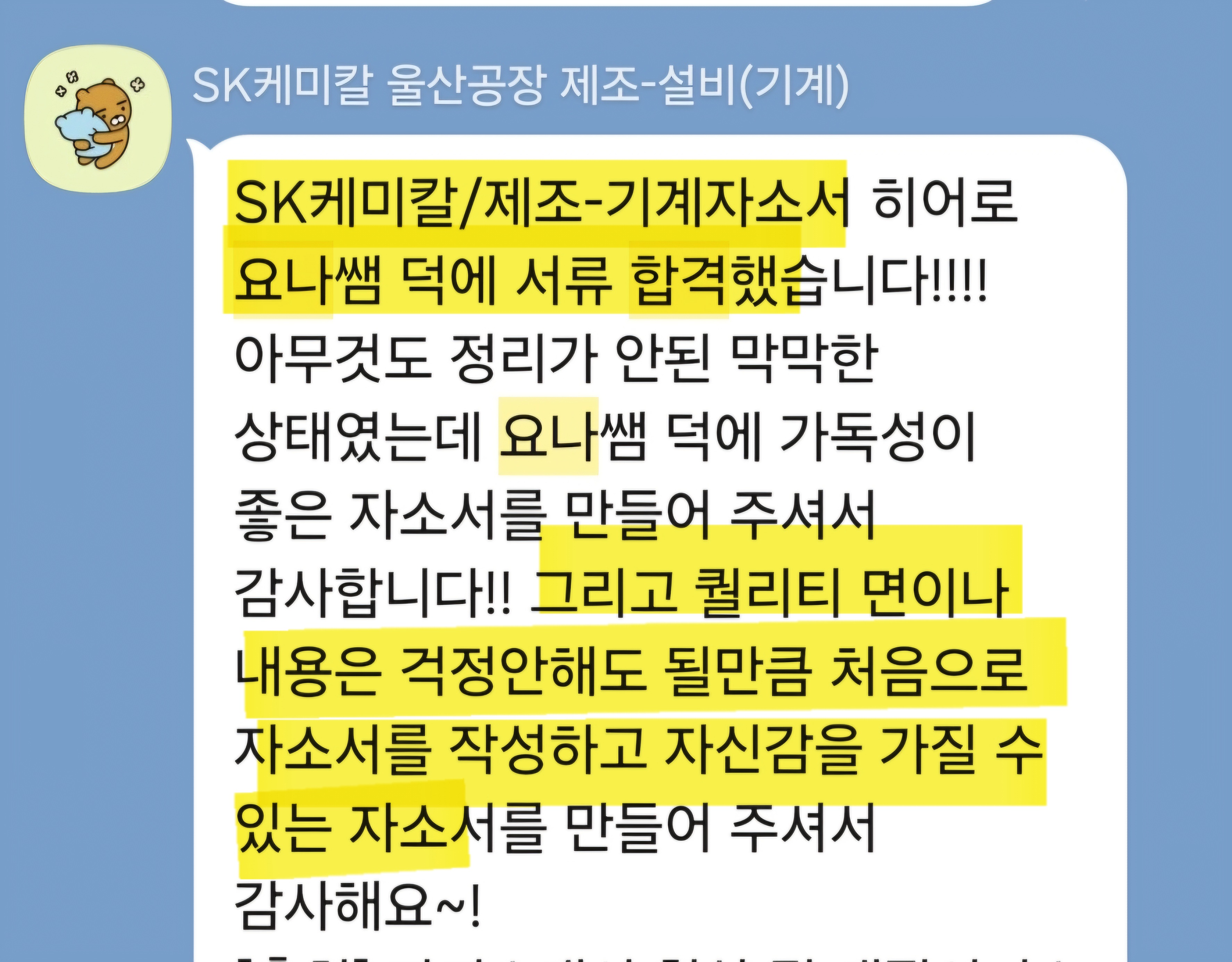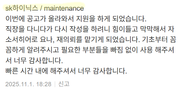 매해 3,000명 이상의 지원자분들과 함께하며, SK하이닉스 메인터넌스(메인트) 자기소개서 또한 수많은 합격 사례를 만들어왔습니다.