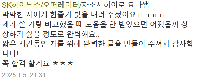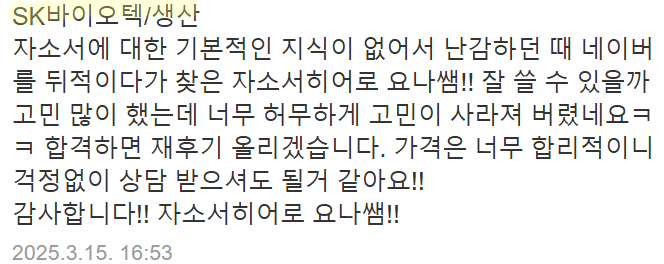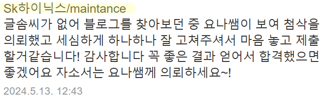 빠른 첨삭이 필요하시거나 맞춤 컨설팅을 원하신다면 아래 채널을 통해 문의해주세요.
