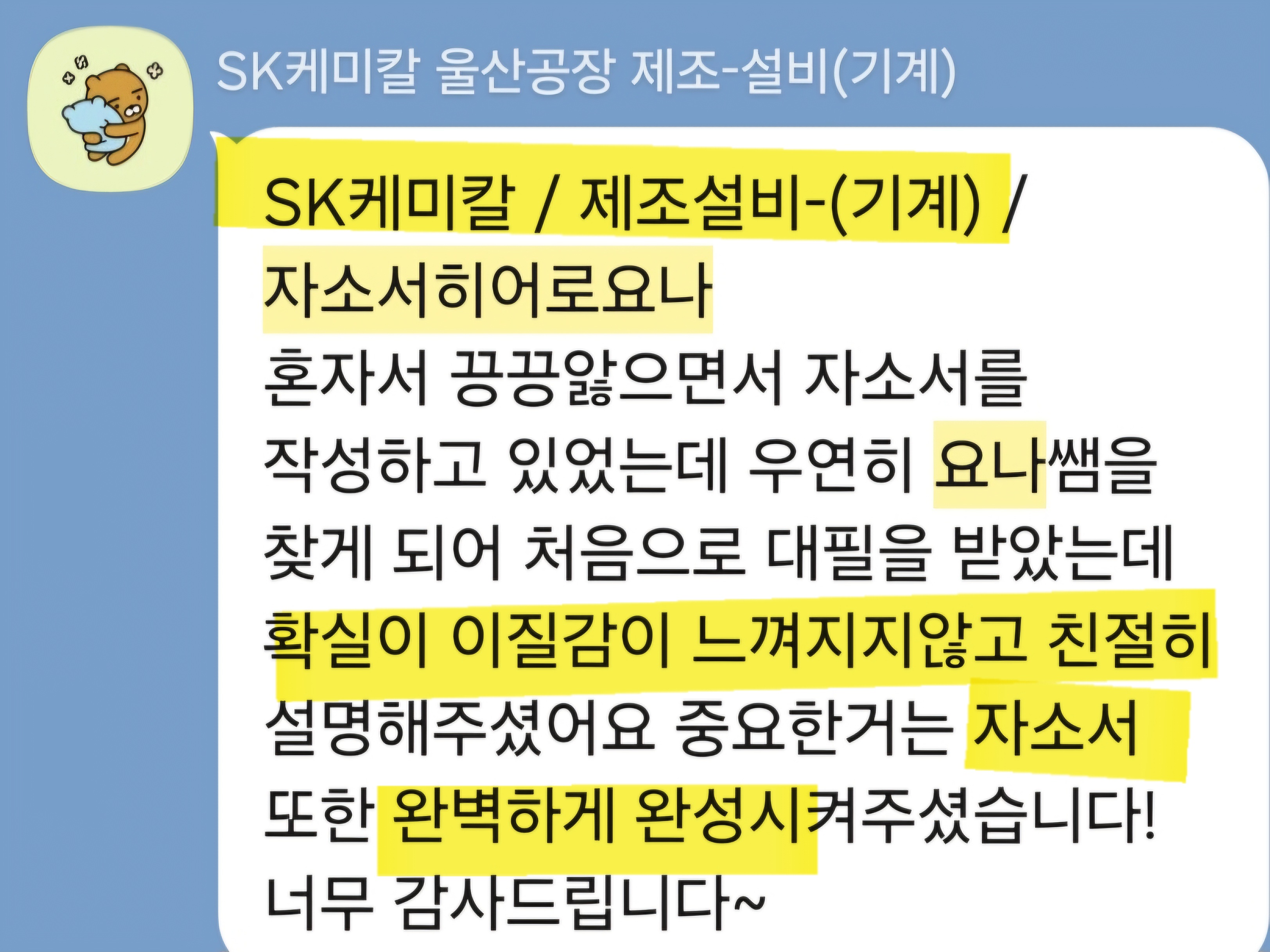 10년 이상 대학 취업 컨설턴트로 활동하며 3만 건 이상의 서류/면접 컨설팅을 진행했습니다. SK하이닉스 지원자들의 자기소개서를 다수 다뤄 왔기에, 기업과 직무에 맞춘 맞춤형 첨삭이 가능합니다.