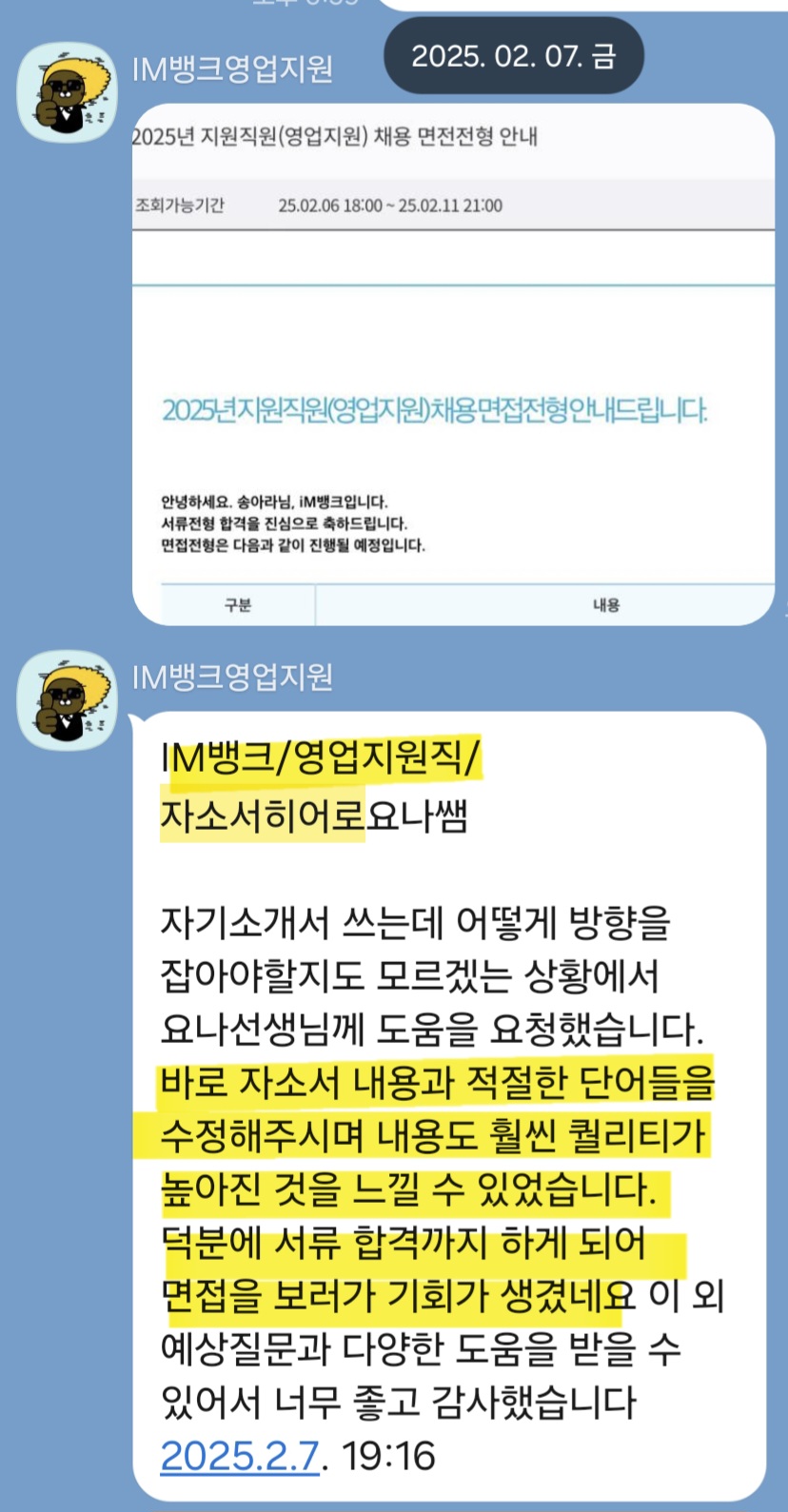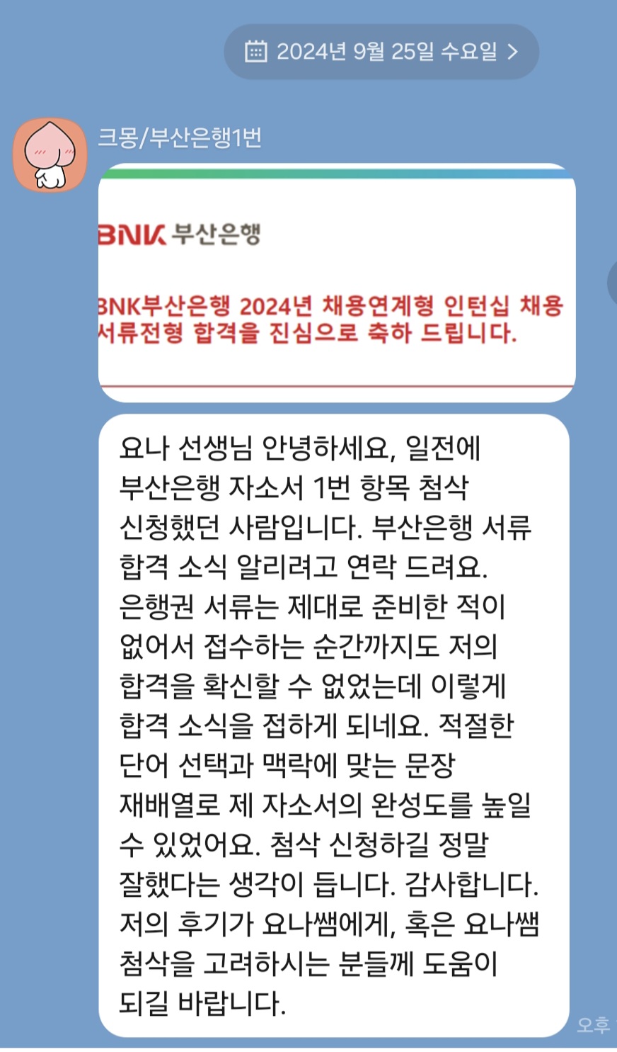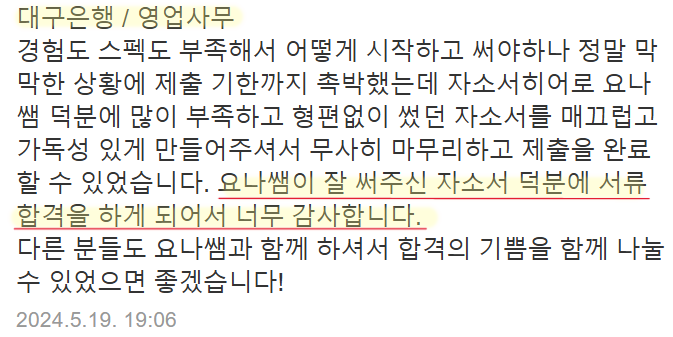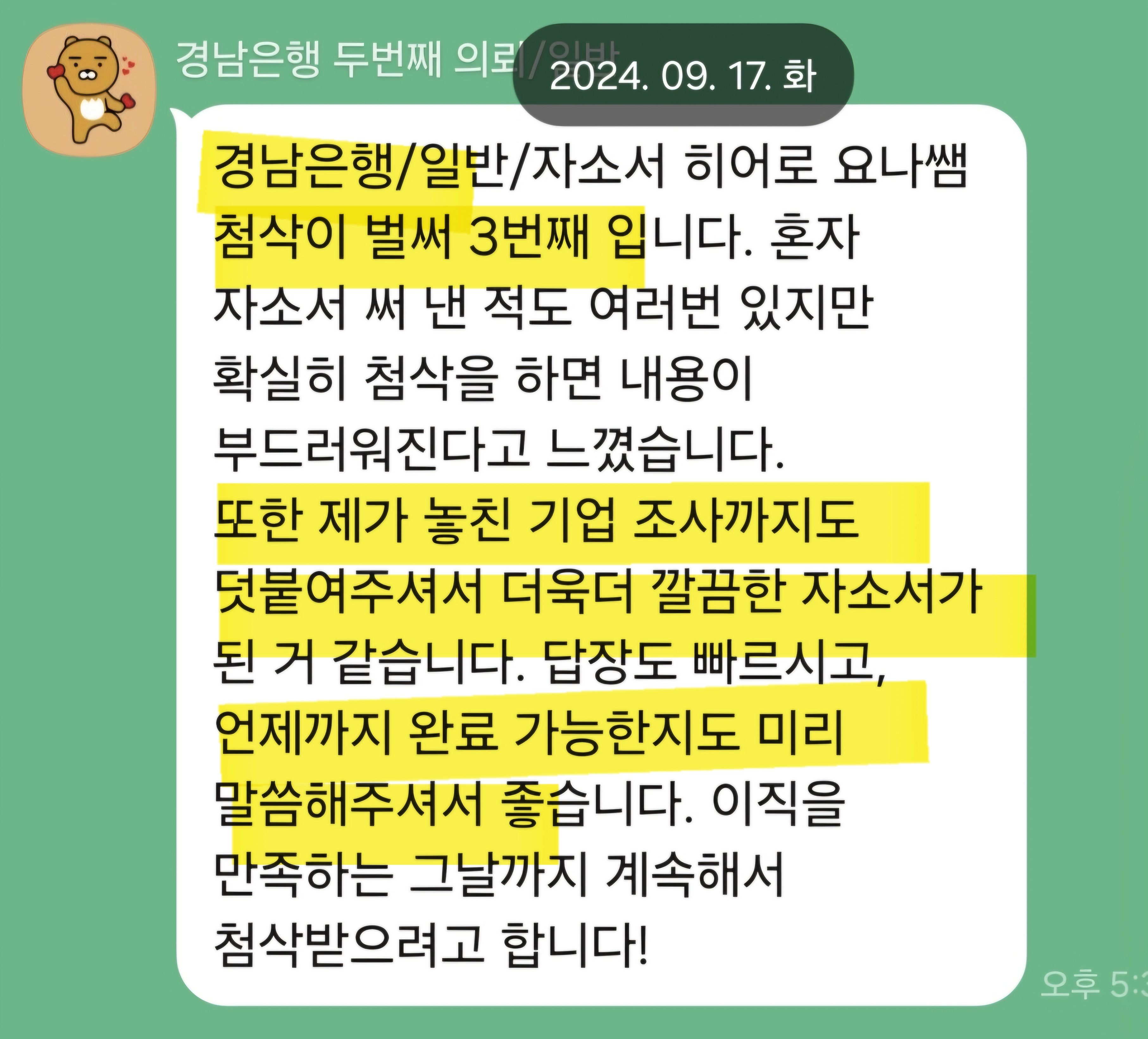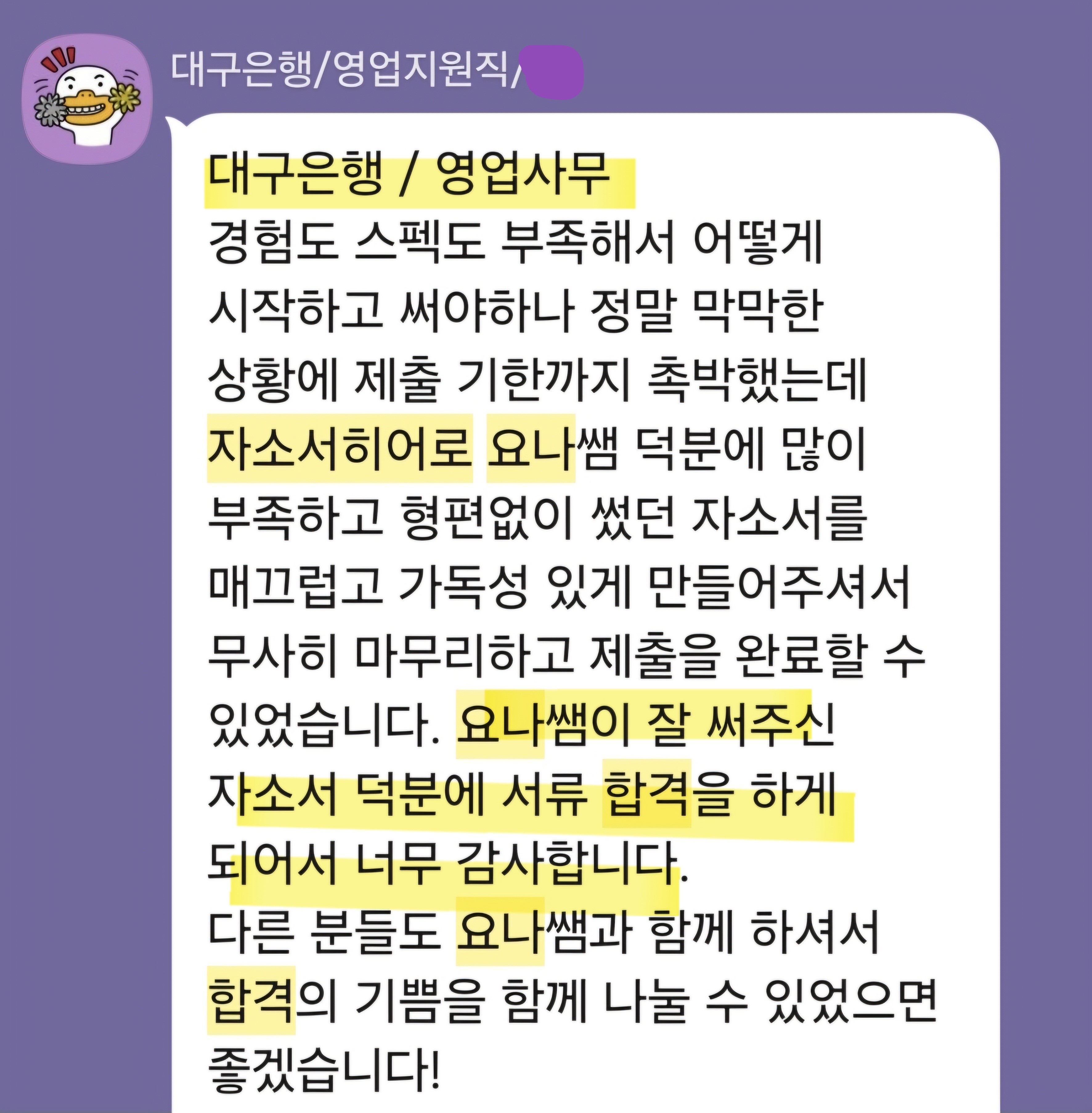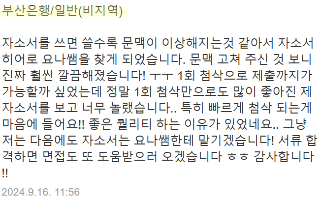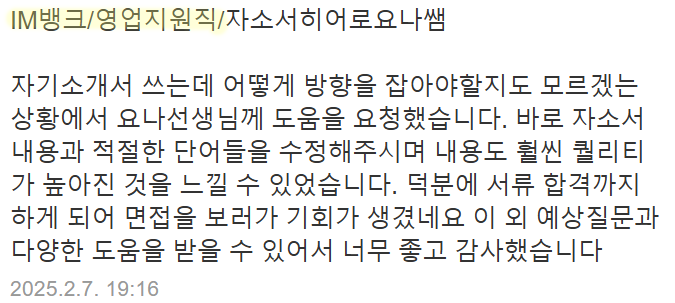 저는 지난 10년간 대학교 취업 컨설턴트로 활동하며, 30,000건 이상의 서류 및 면접 컨설팅을 진행해왔습니다. 특히 금융권 첨삭 대필 경험이 풍부하며, 크몽 첨삭 후기 2,000개, 블로그 댓글 후기 2,000개 이상으로 수많은 취업 준비생들과 함께했습니다.