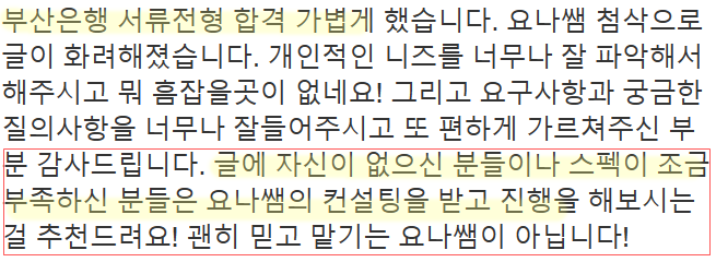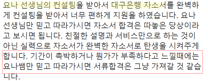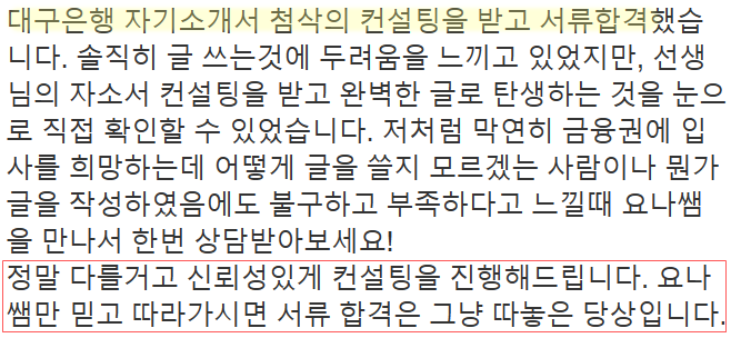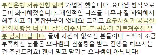 95% 이상의 서류 합격률을 자랑하는 이유는 정확한 직무 분석과 지원자 개별 상담을 통해, 고유한 소재를 자기소개서에 녹여내기 때문입니다.